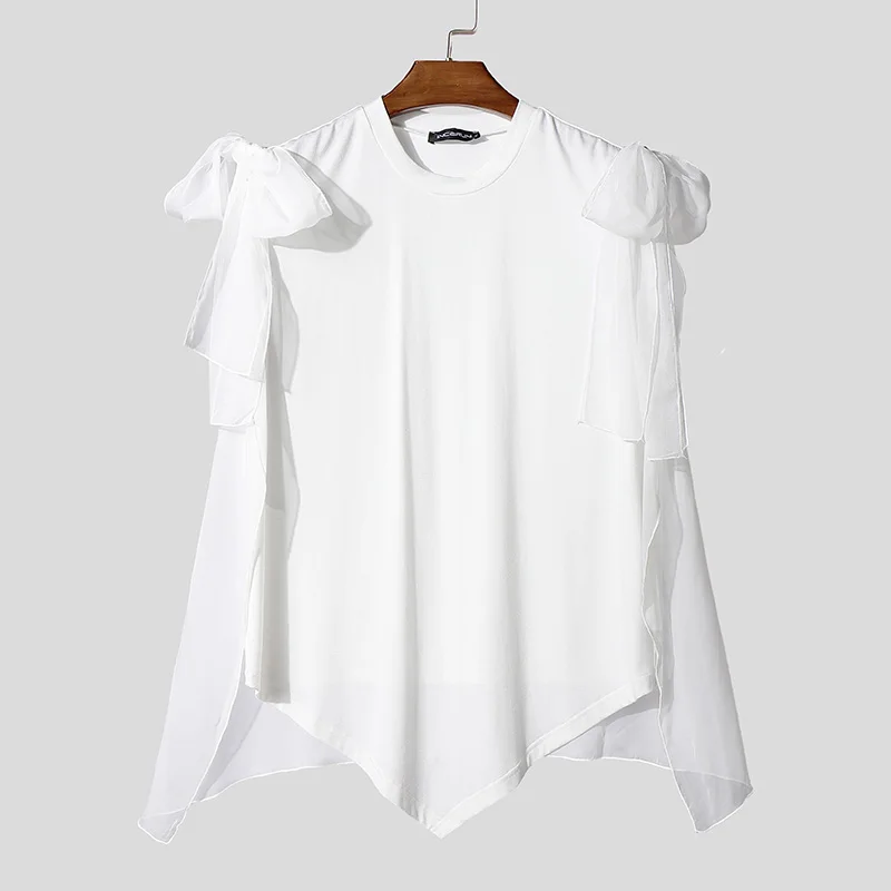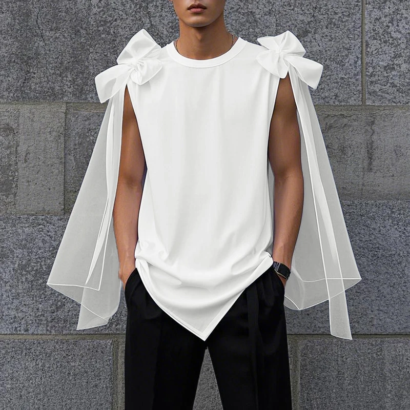 Men Tank Tops Mesh Patchwork O-neck Sleeveless Bow Summer Unisex Tee Tops Streetwear Fashion Casual Men Clothing S-5XL