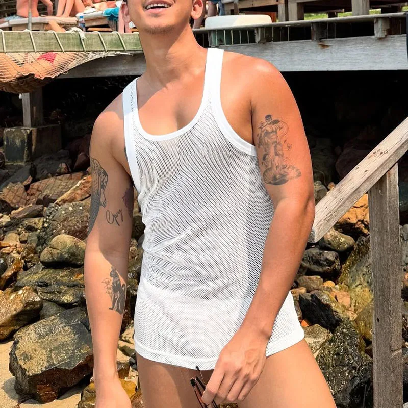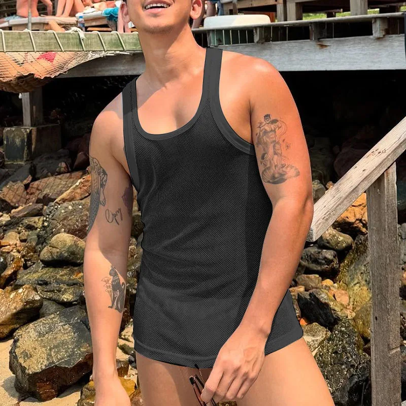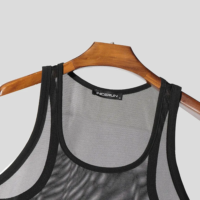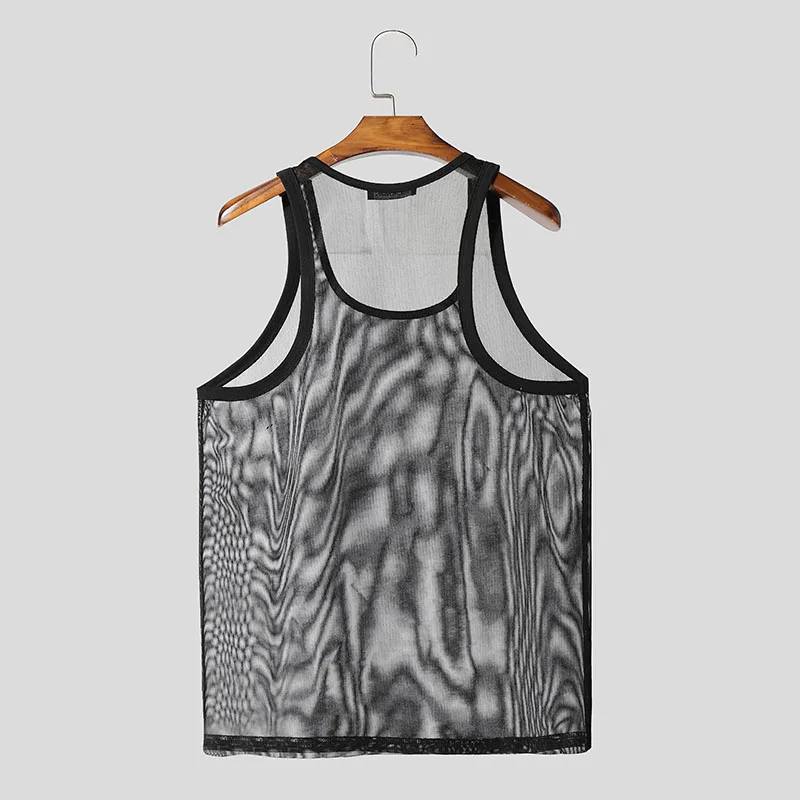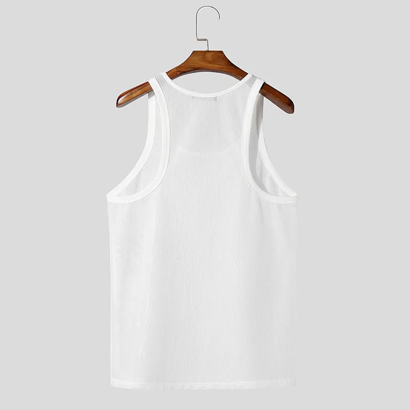 Men Tank Tops Solid Color O-neck Sleeveless Mesh Male Vests Summer Streetwear Transparent Hollow Out Men Clothing