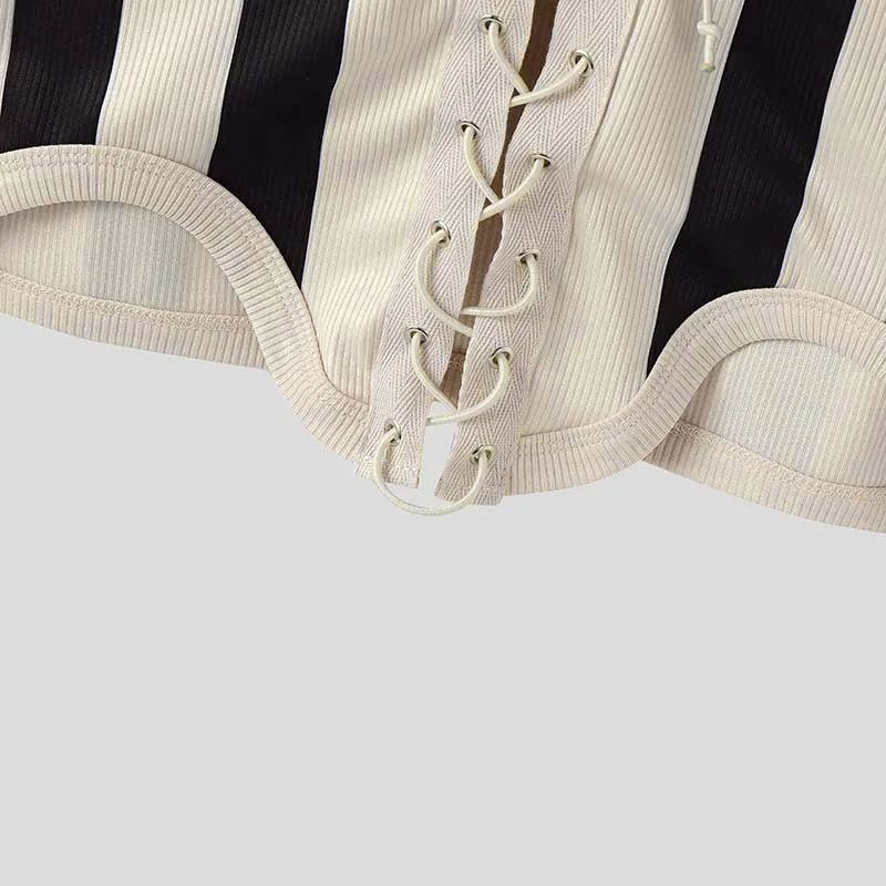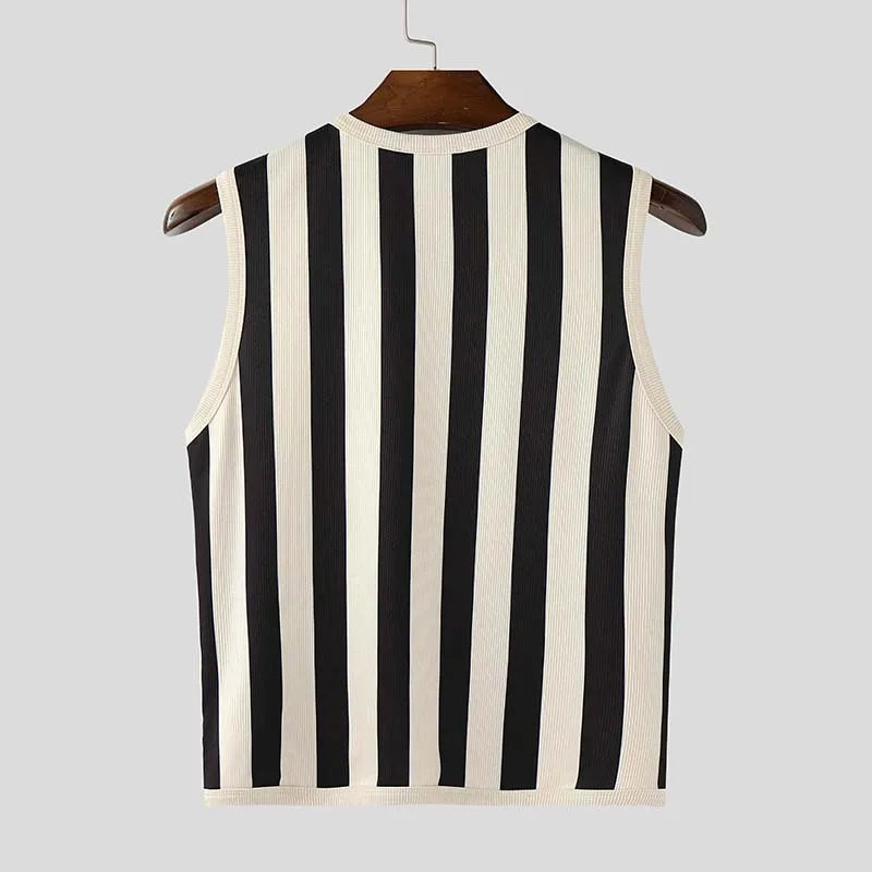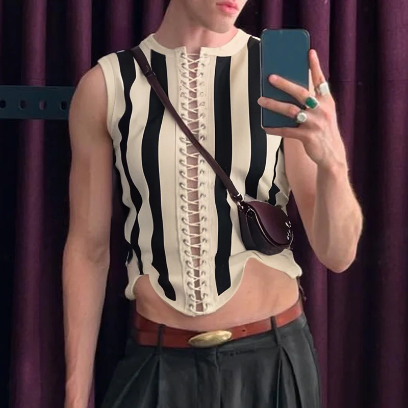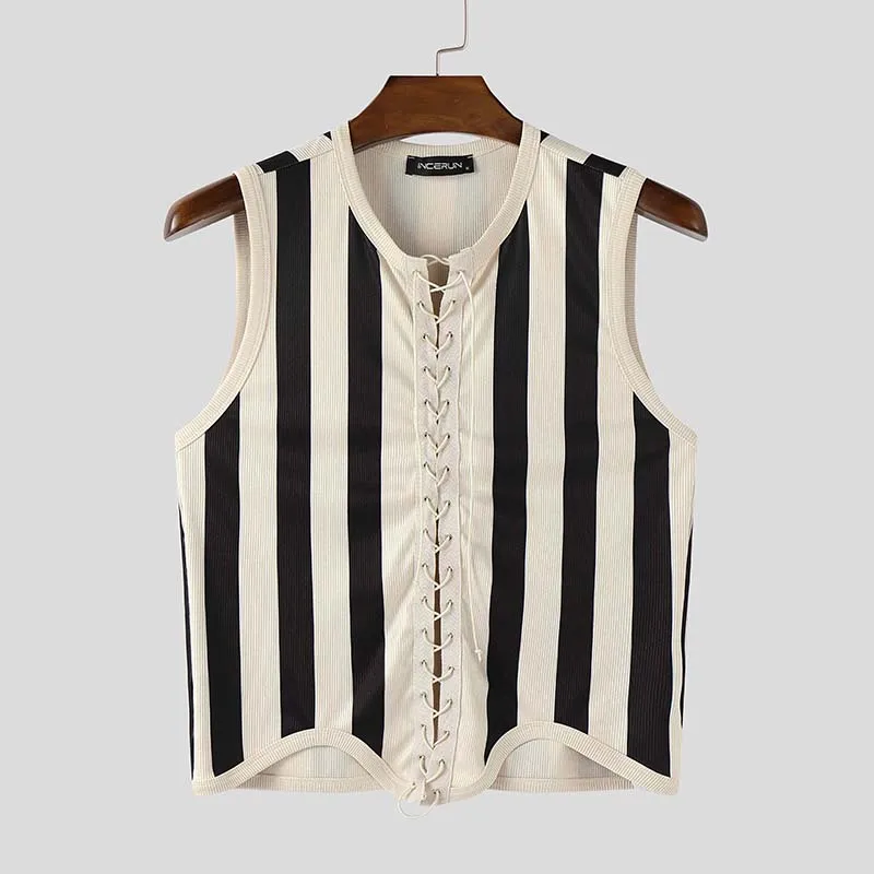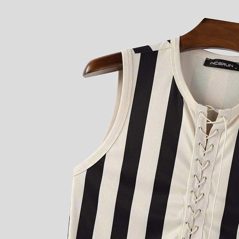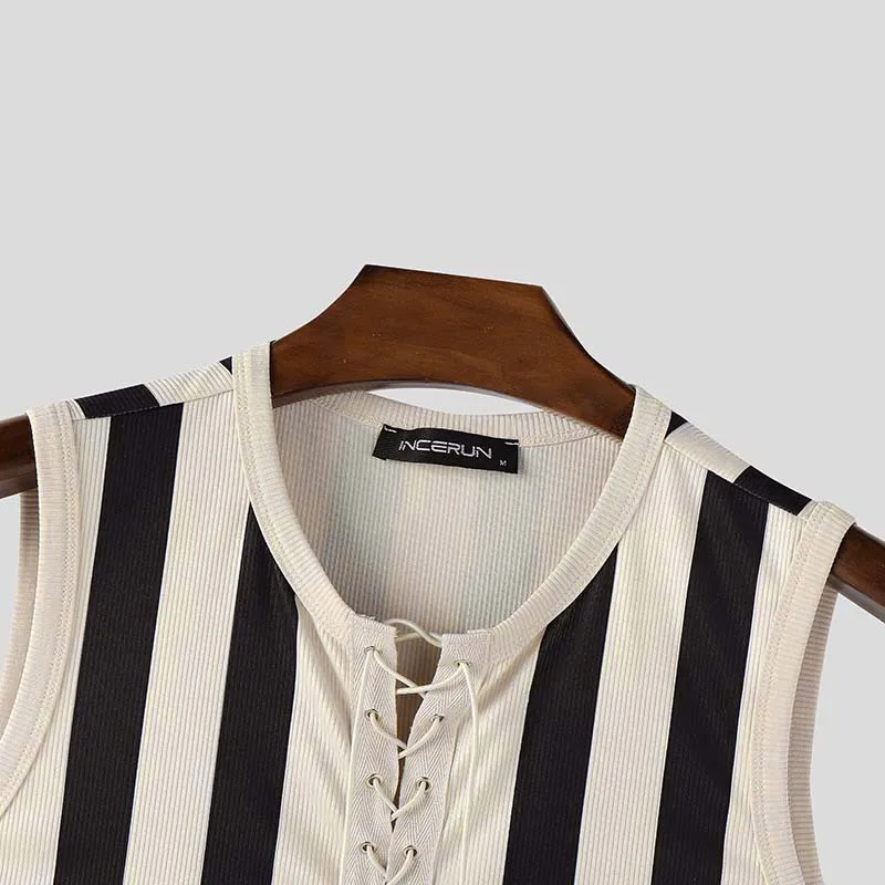 Men Tank Tops Striped Lace Up Sleeveless Summer Knitted Male Vests Streetwear Hollow Out Sexy Fashion Unisex Crop Tops INCERUN