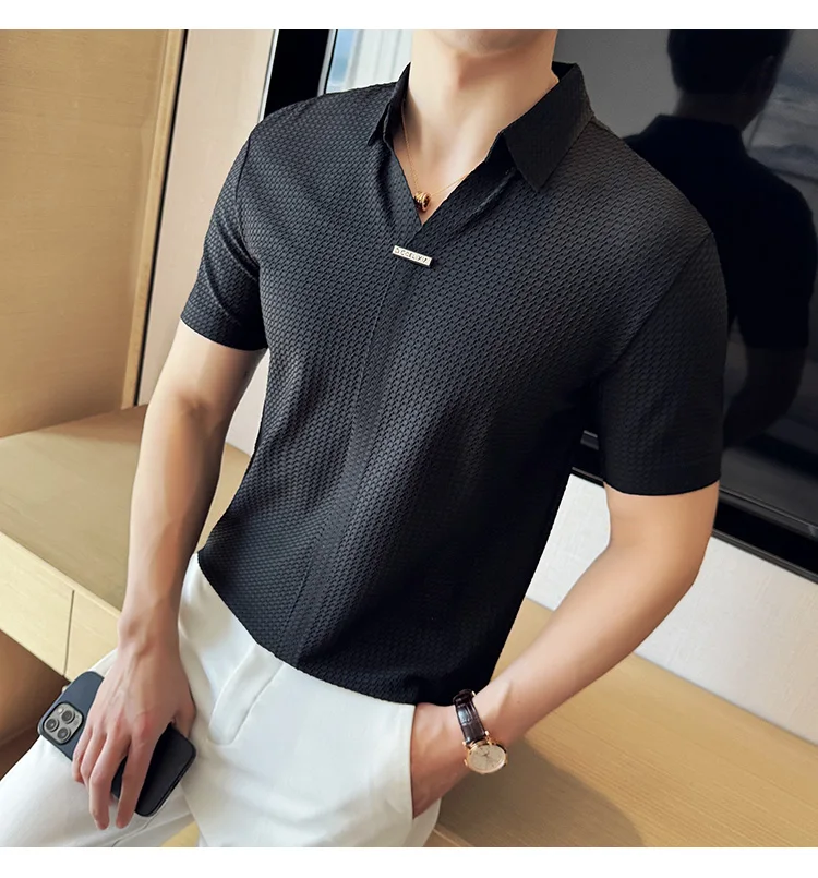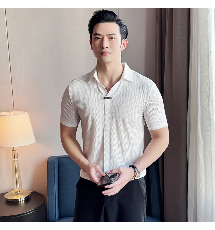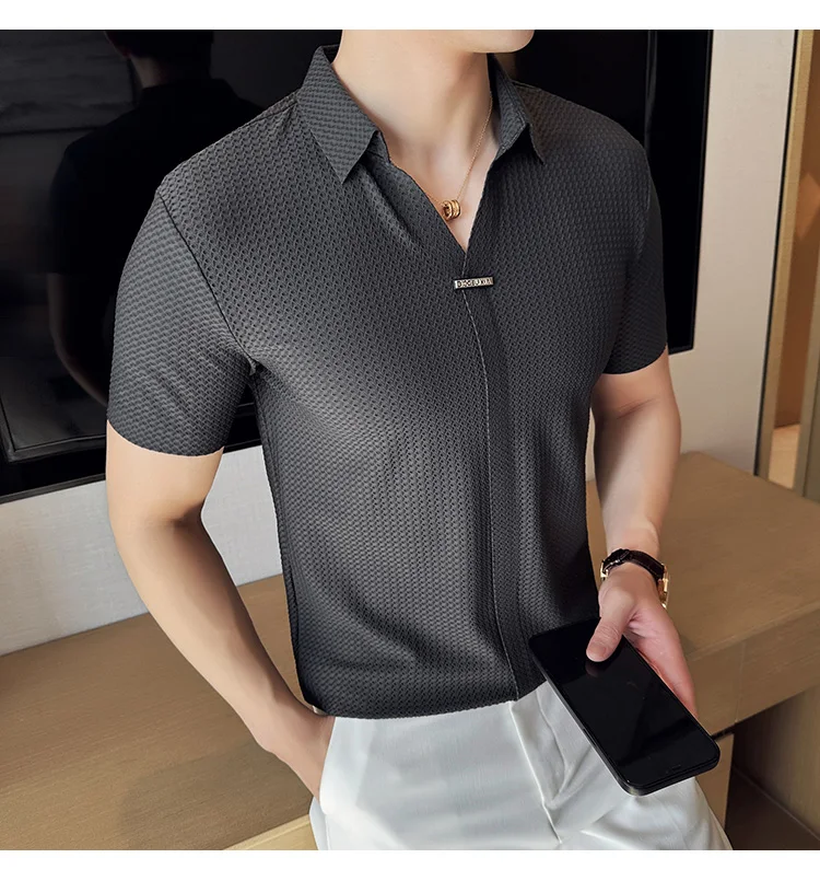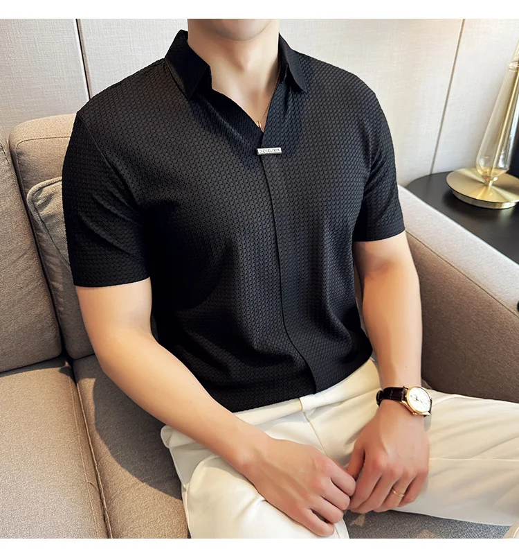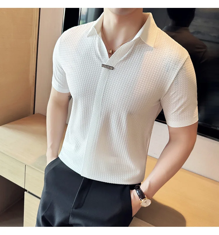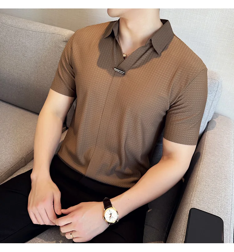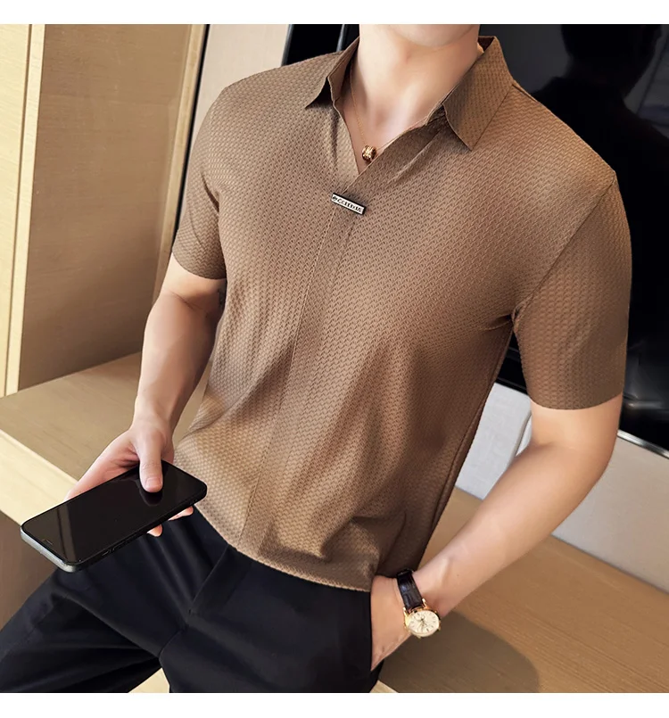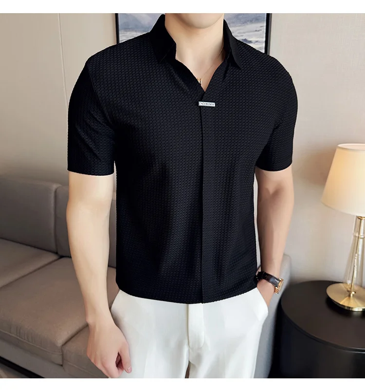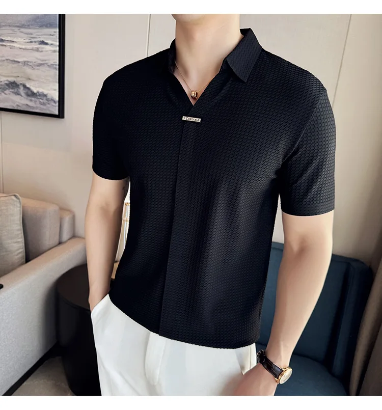 Men Waffle Polo Shirt British Style Summer Ice Silk Thin Solid Casual Elastic Slim Fit Short Sleeved T-shirt Men Clothing