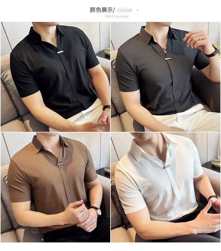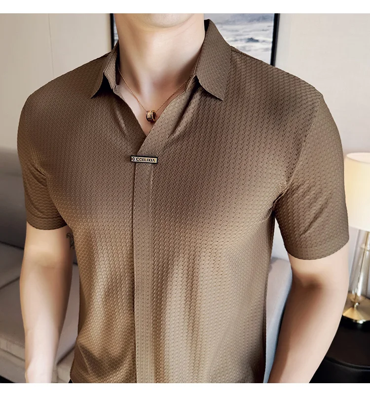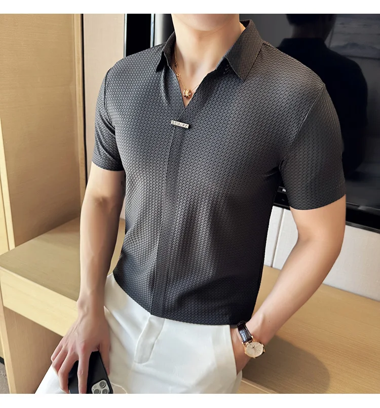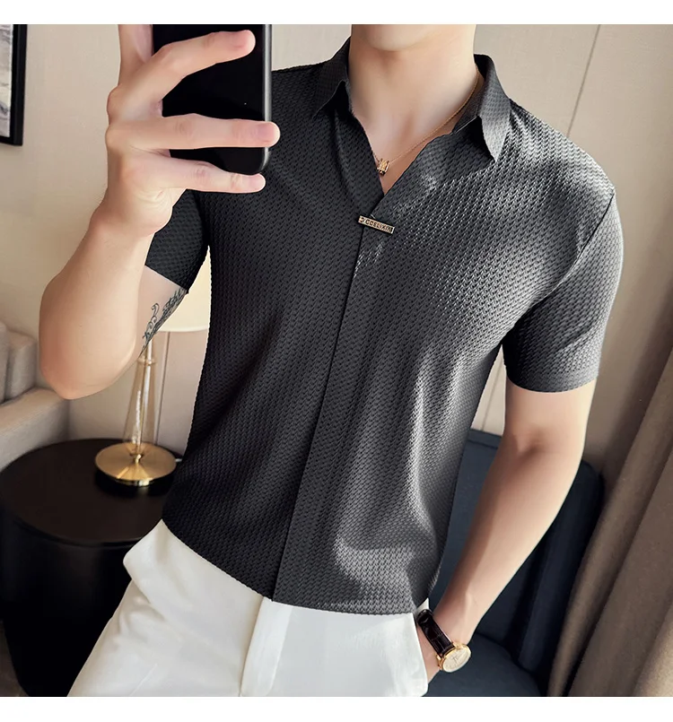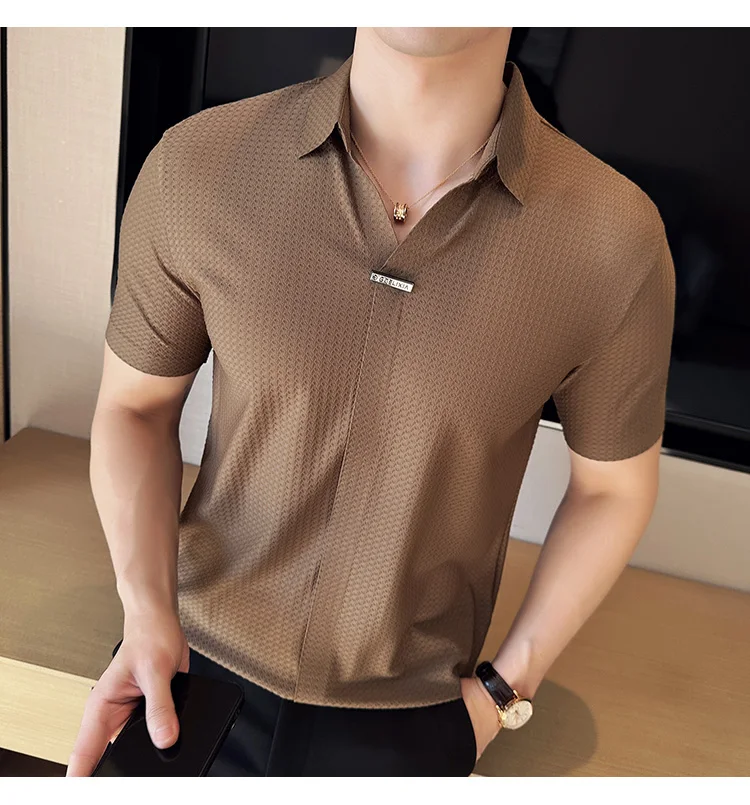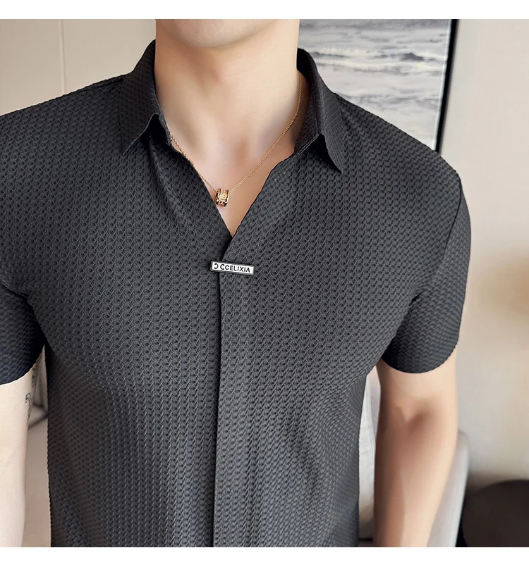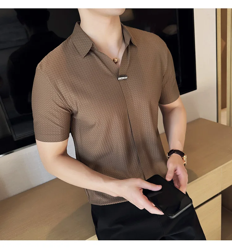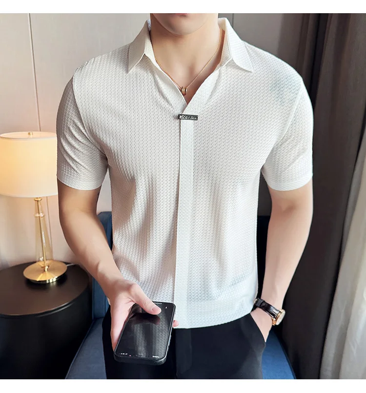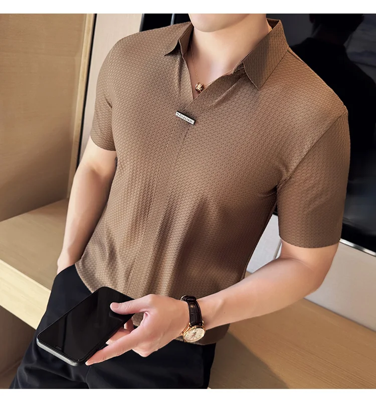 Men Waffle Polo Shirt British Style Summer Ice Silk Thin Solid Casual Elastic Slim Fit Short Sleeved T-shirt Men Clothing
