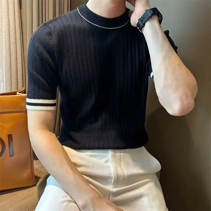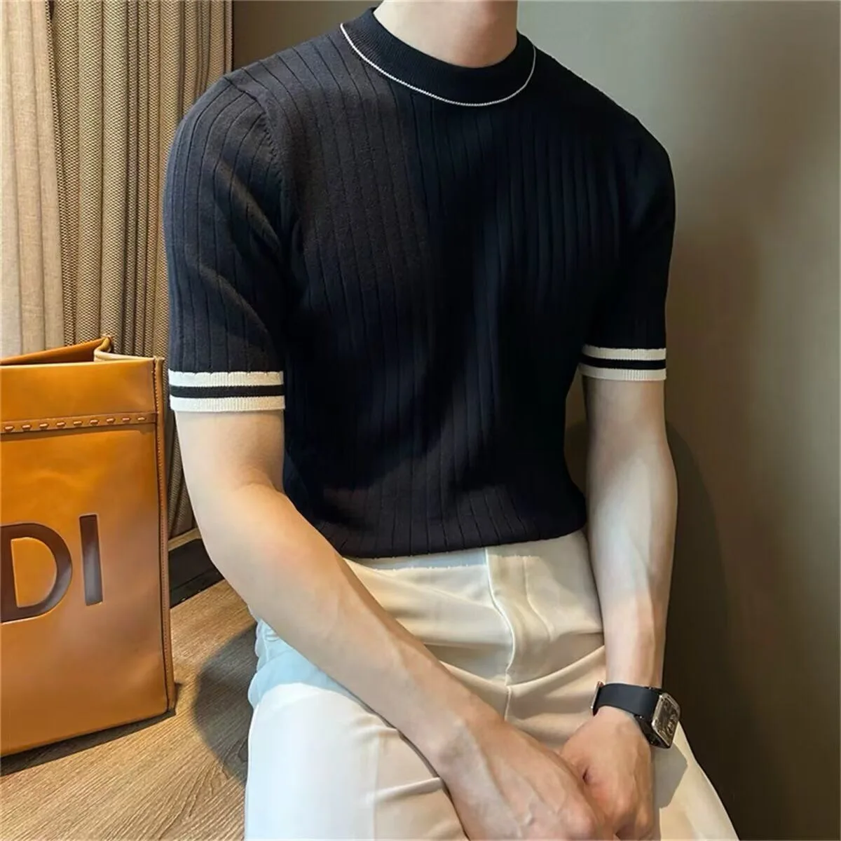 Men's Clothing Fashion Patchwork Tops Luxury High Quality Knit O Neck Short-sleeved T-shirt Leisure Popular Retro Slim Knitwear