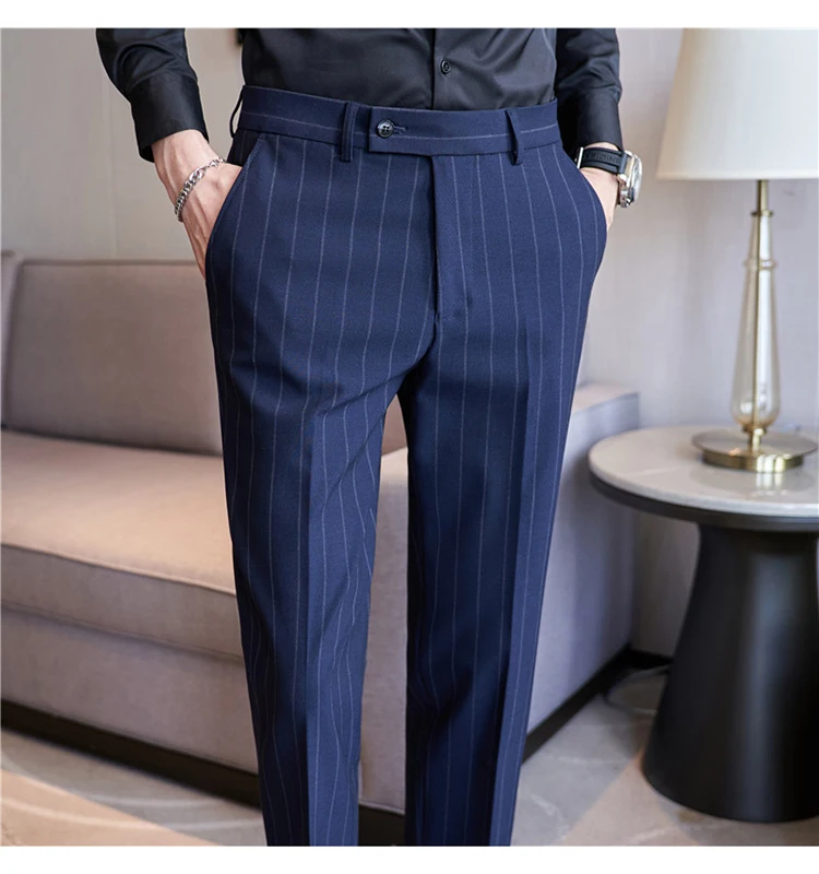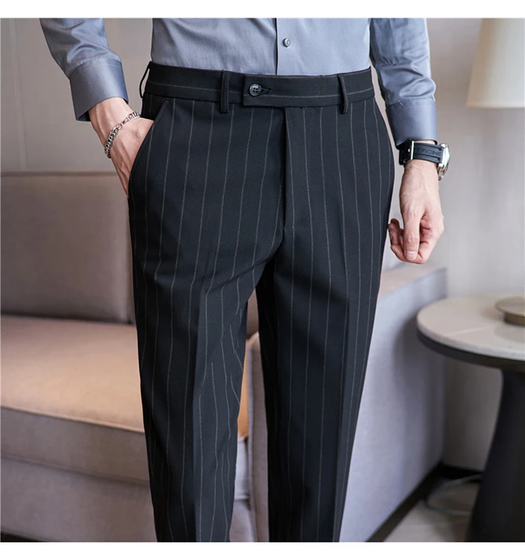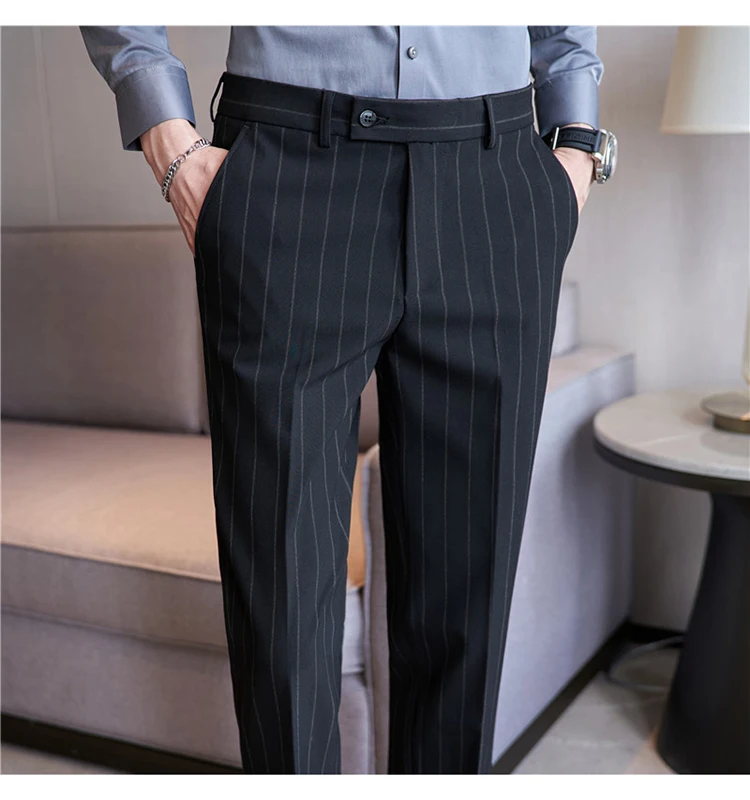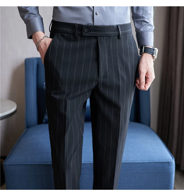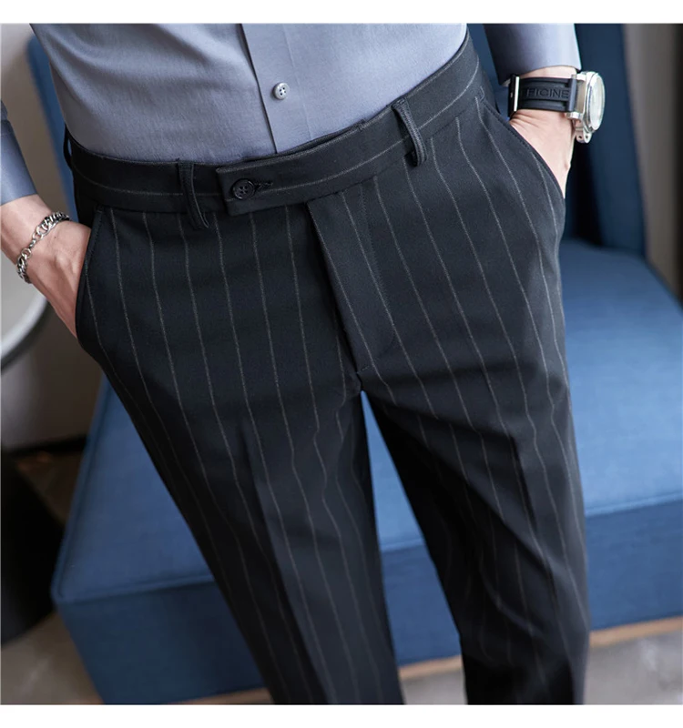 Men's Striped Suit Pants Elastic Autumn New Social Casual Trousers Slim Fit Suit Pants Business Office Wedding Men Clothing