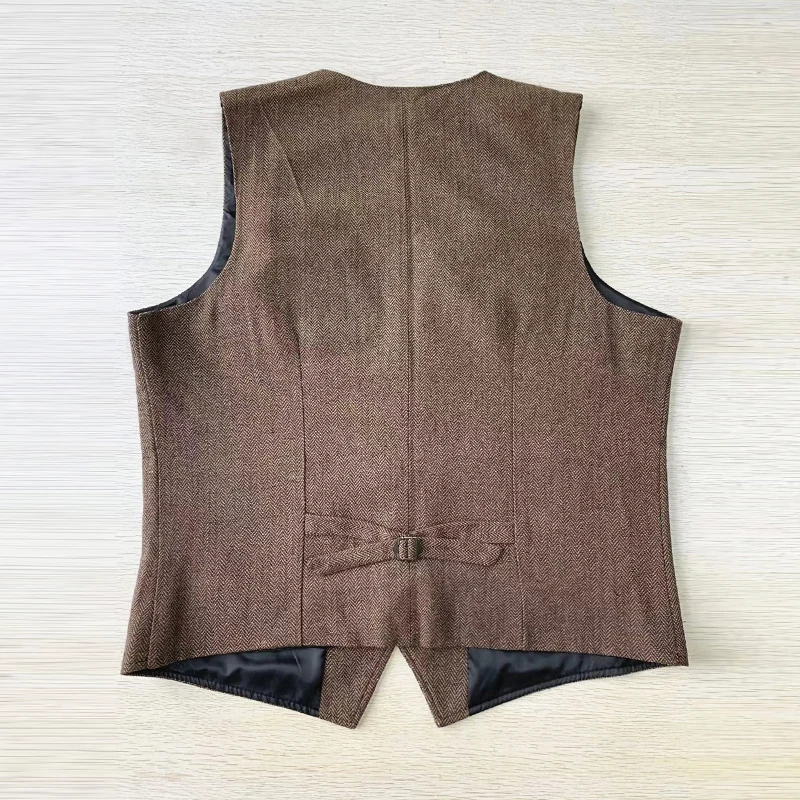 Men's Vest Brown Herringbone Wool Tweed V Neck Single Breasted Retro Tooling Vest Male Gentleman Business Waistcoat For Wedding voguable