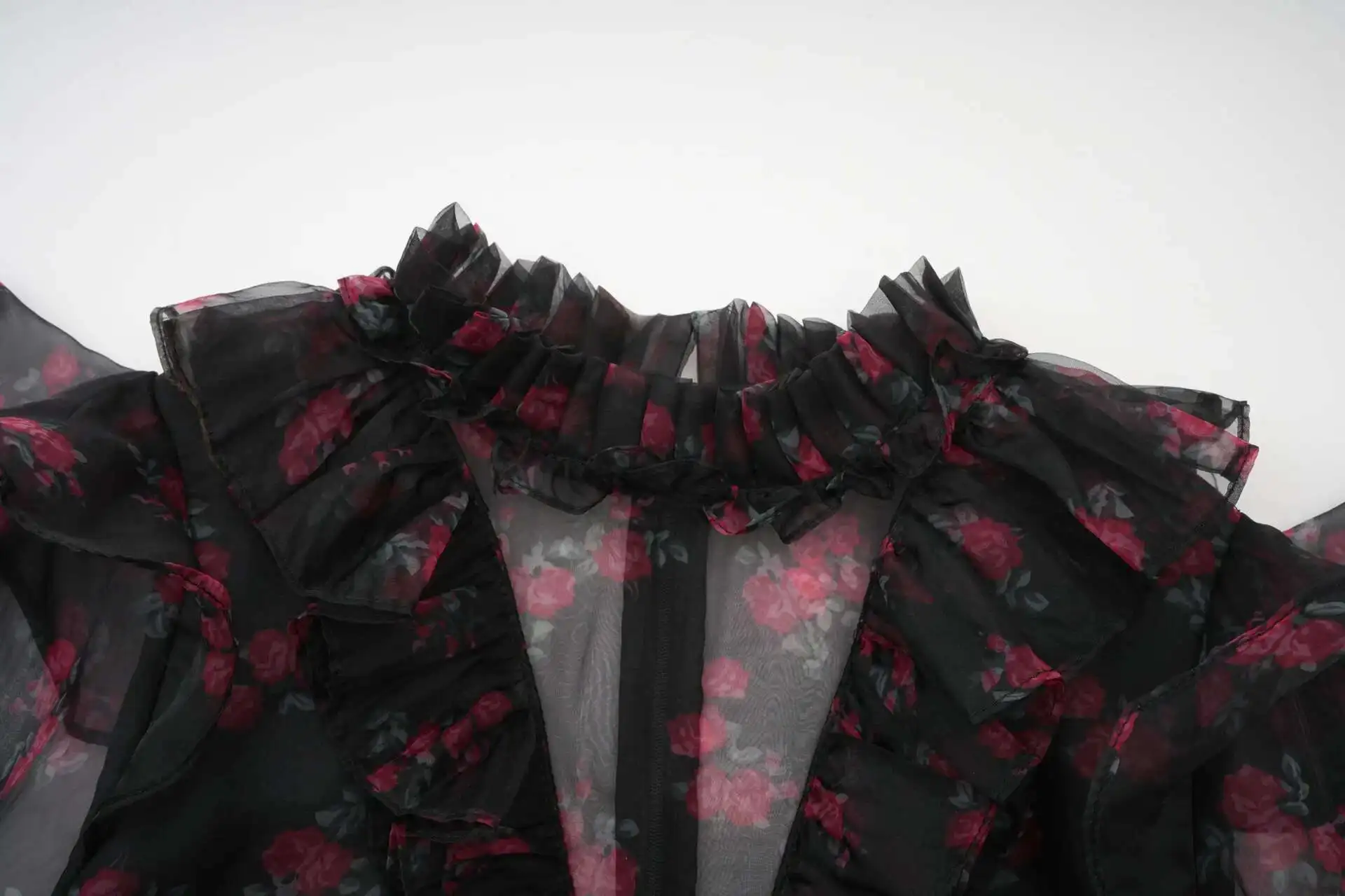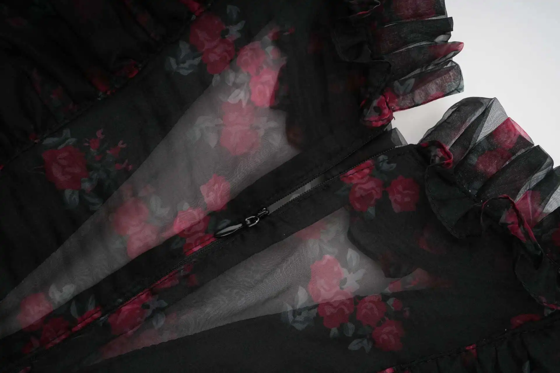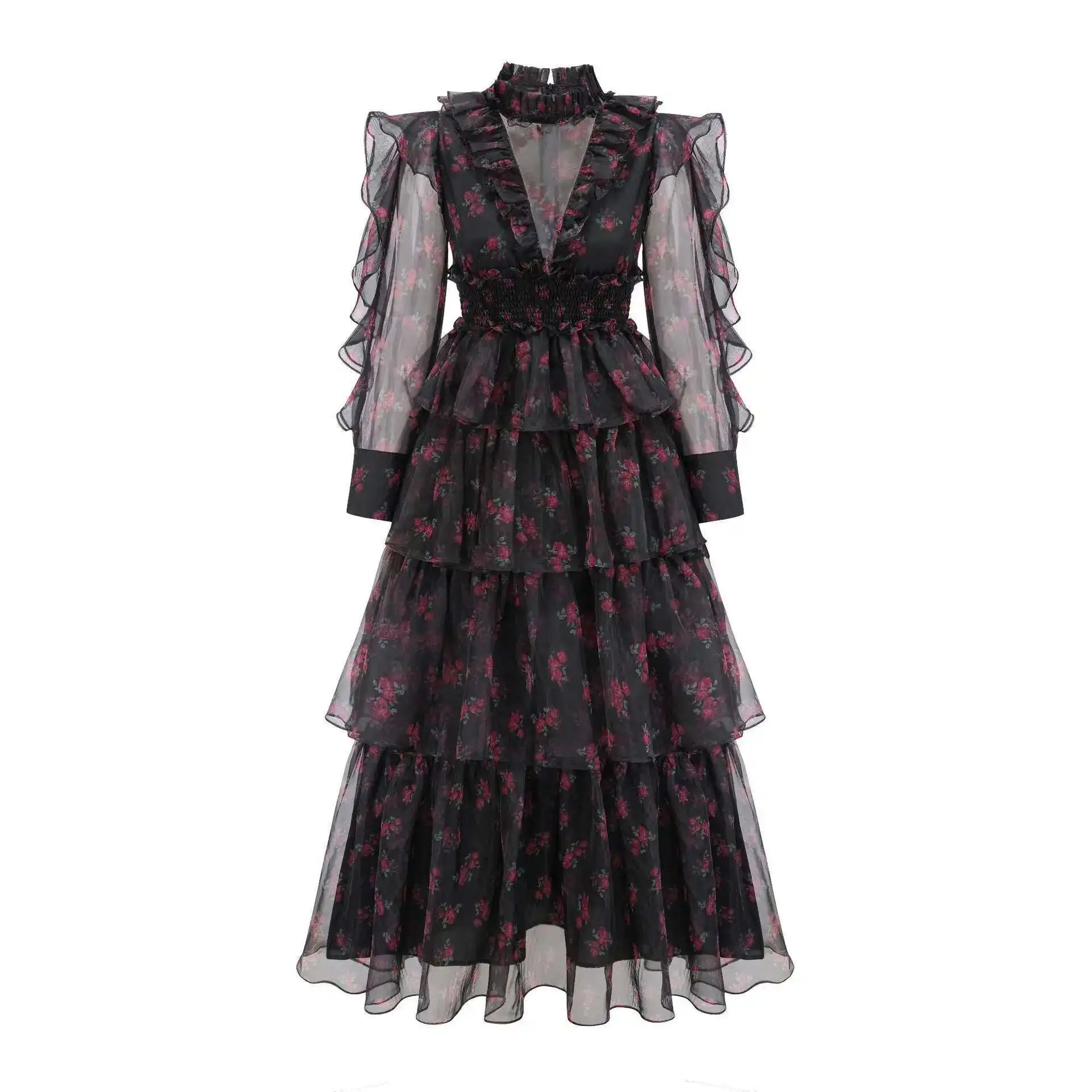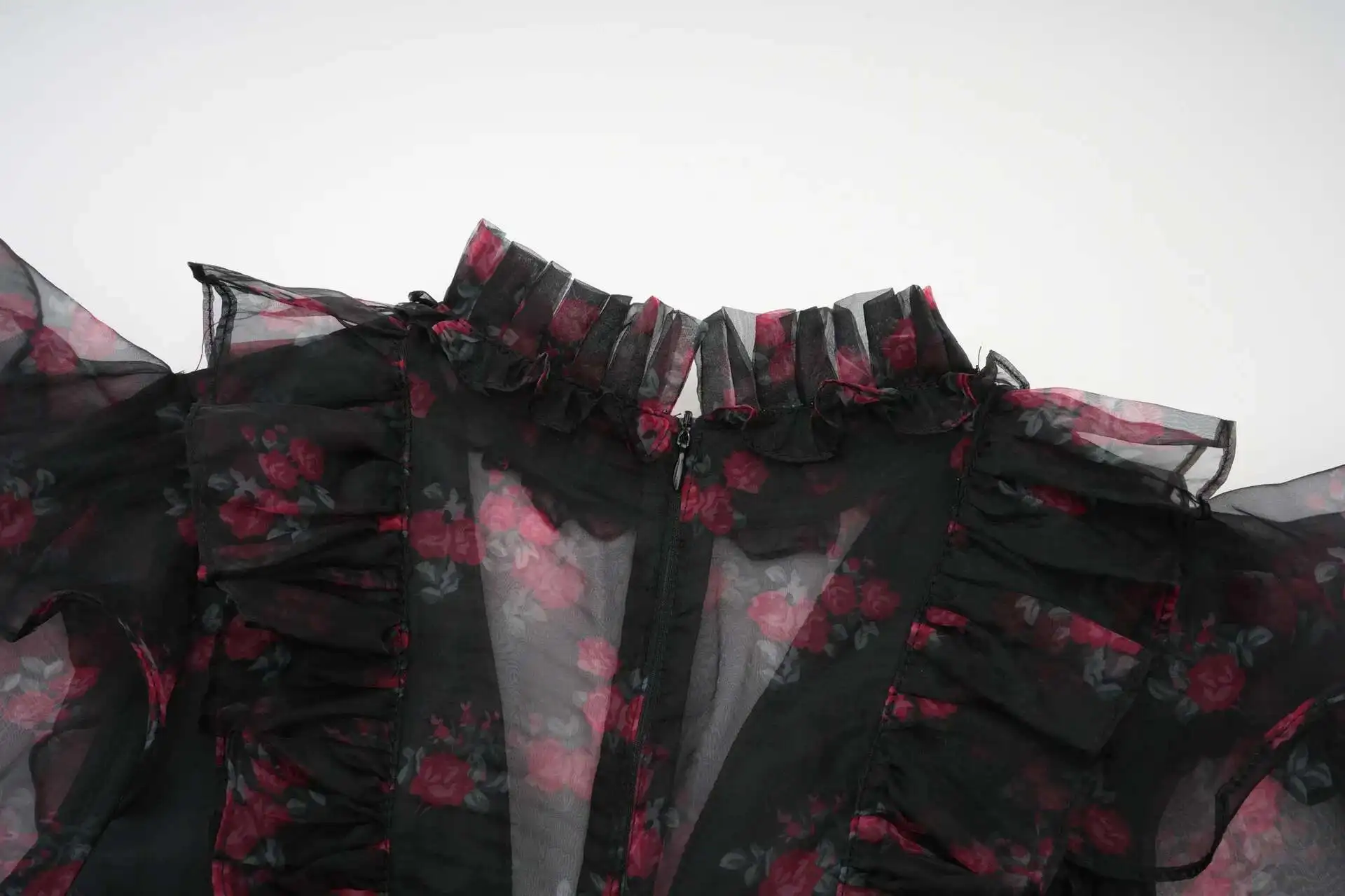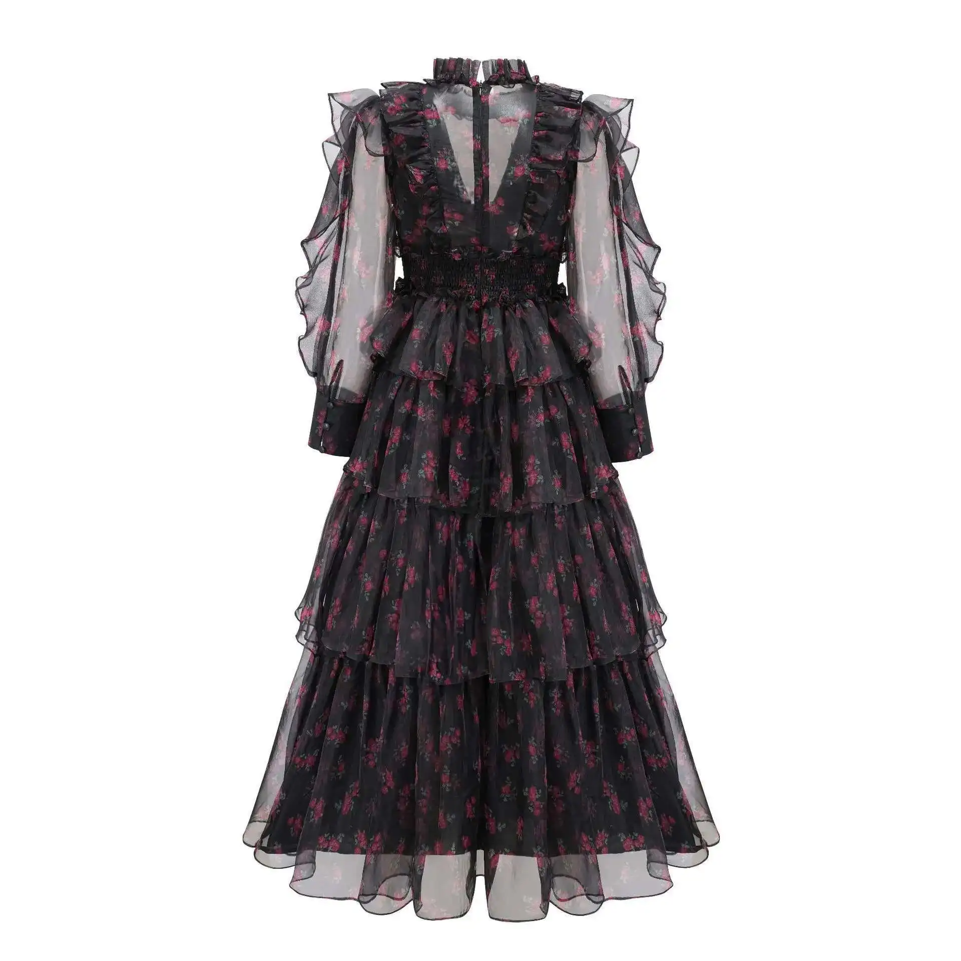 Mesh See-through Women Dress Zipper Flowers Edible Tree Fungus Design Stand Collar Full Sleeve 2025 Dresses Female