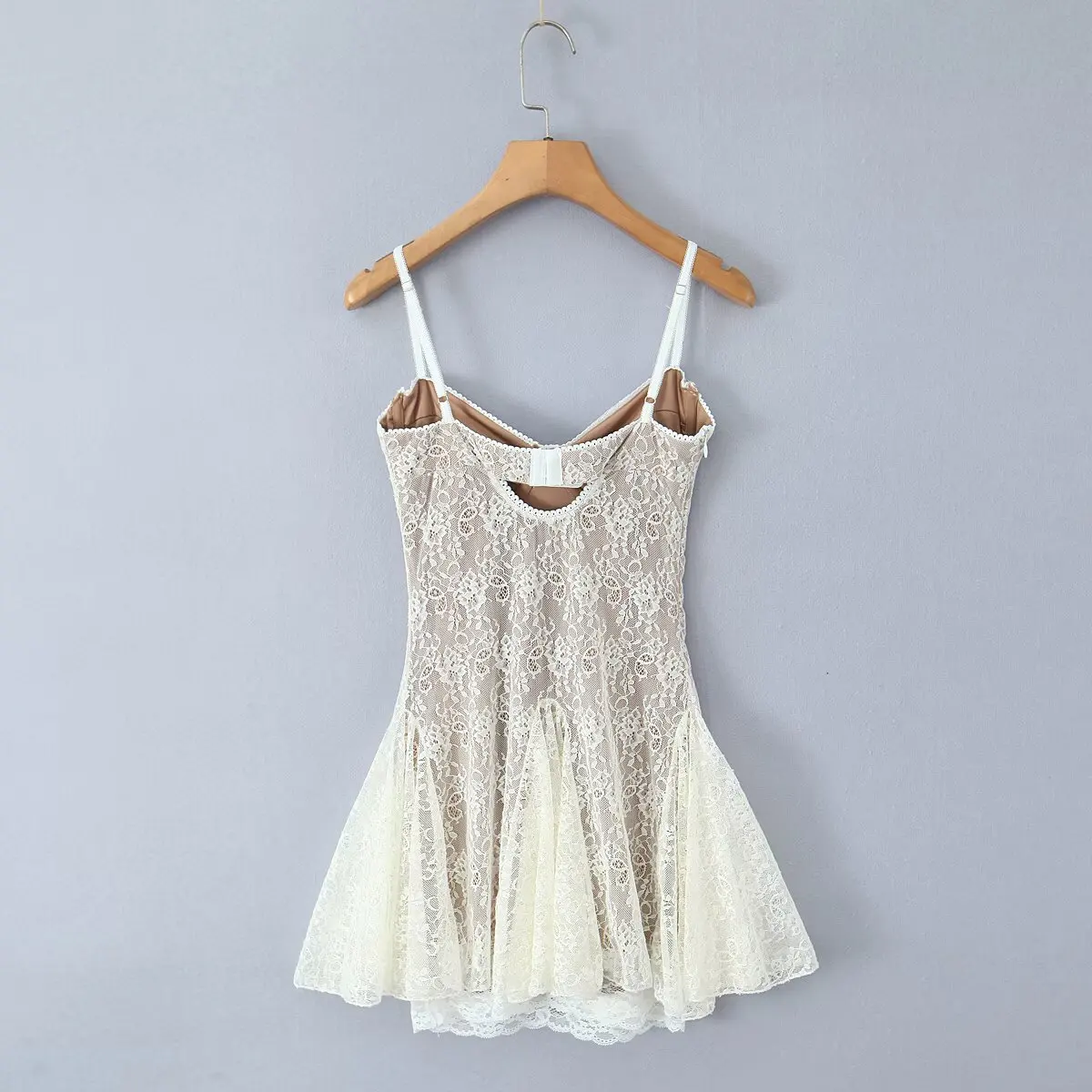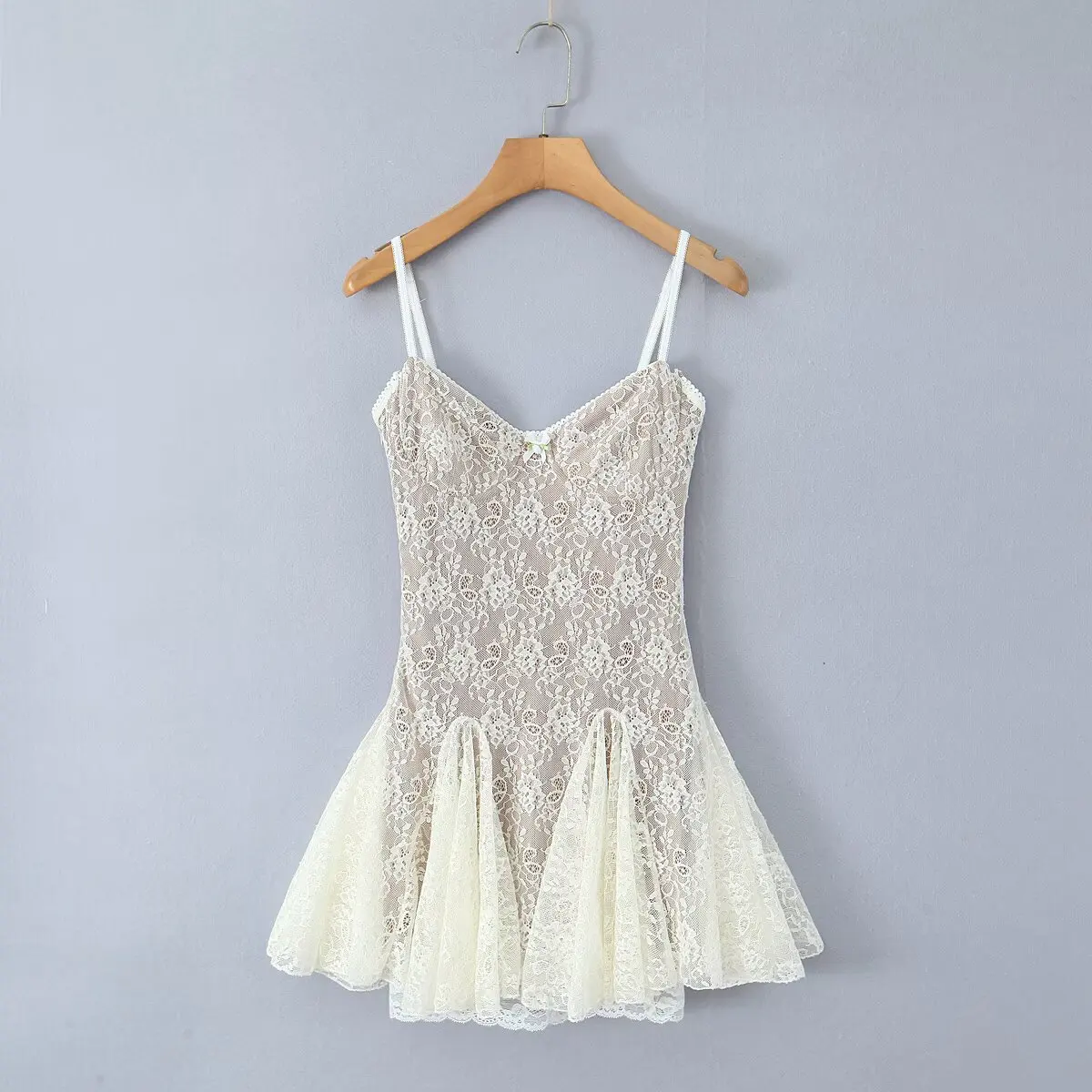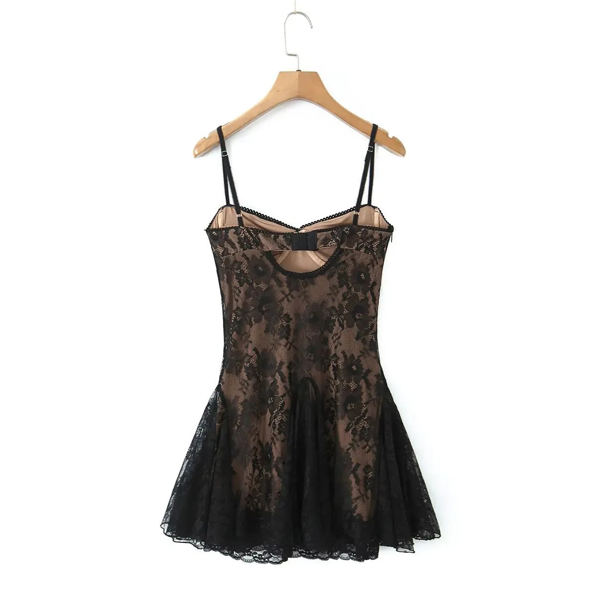 New Fashion Women Spaghetti Straps Lace Sexy Dresses Black Beige Backless Hollow Out A-line Mini Dress Night Out Robe