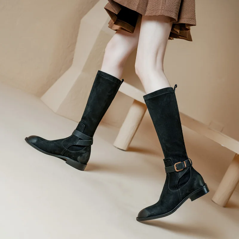New Vintage Women Knee-High Boots Cow Suede Leather Thick Heels Office Ladies Working Shoes Woman Autumn Winter Retro Style voguable