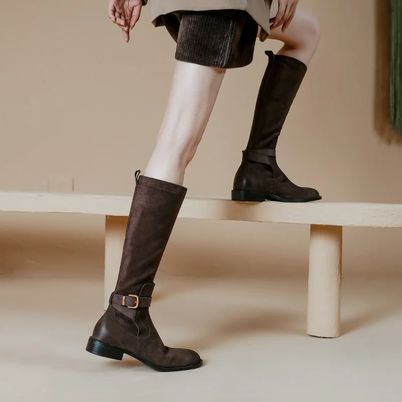 New Vintage Women Knee-High Boots Cow Suede Leather Thick Heels Office Ladies Working Shoes Woman Autumn Winter Retro Style
