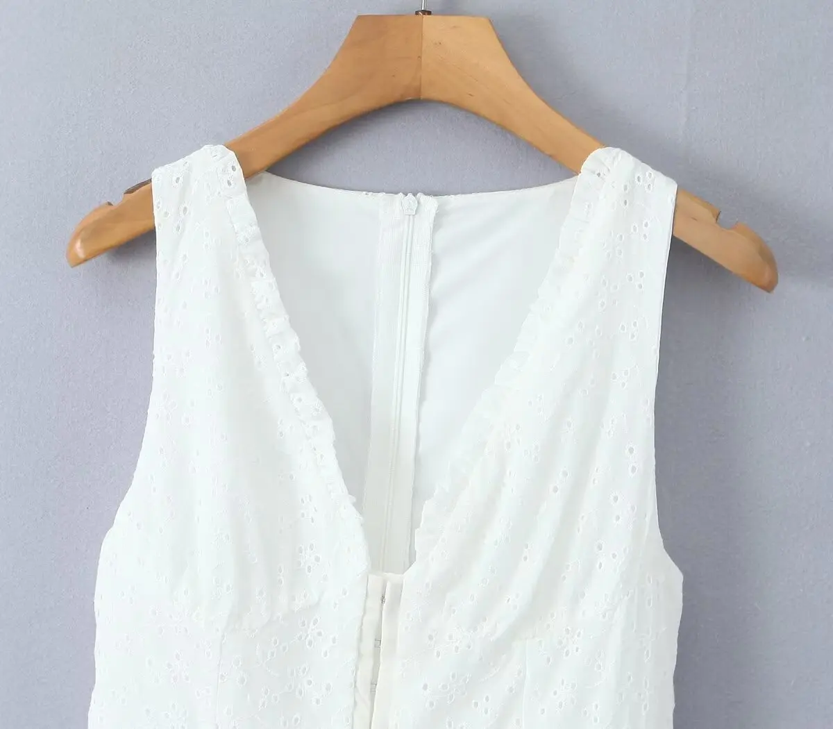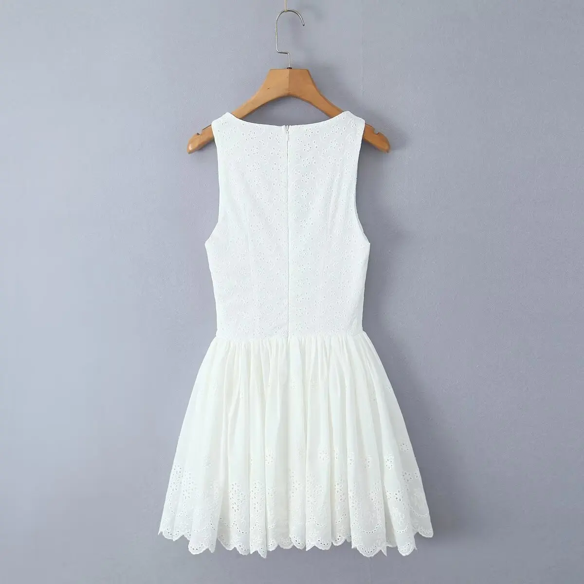 New 2025 Women Hollow Out Embroidery White Tank Dress Sleeveless V Neck Low Waist A-
