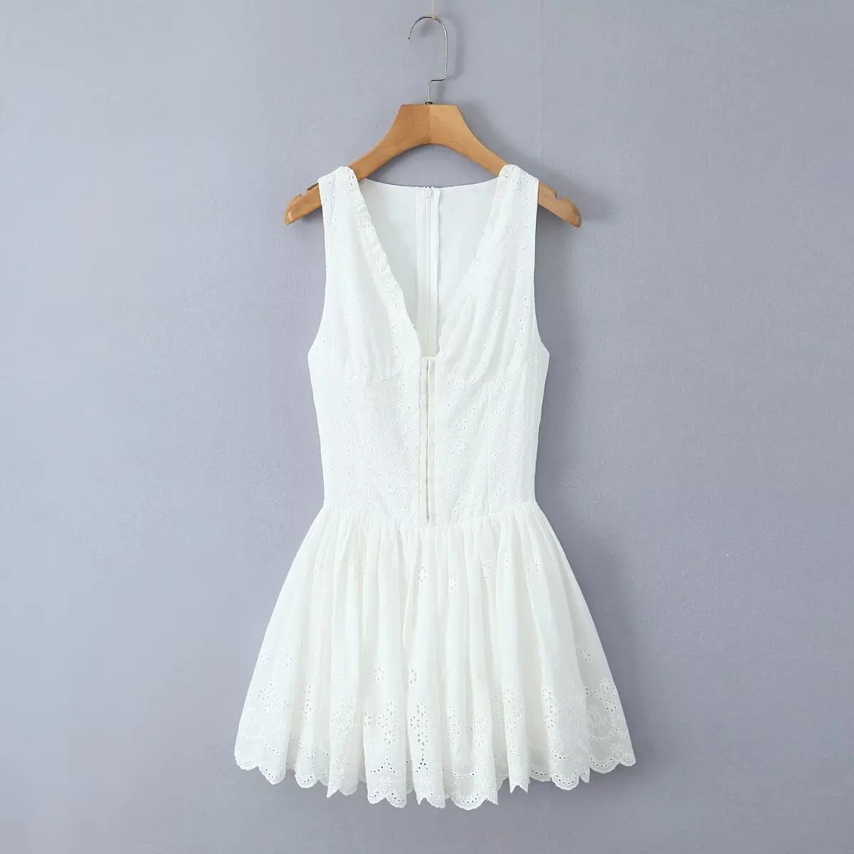 New Women Hollow Out Embroidery White Tank Dress Sleeveless V Neck Low Waist A-line Mini Dresses Summer Cotton Robe