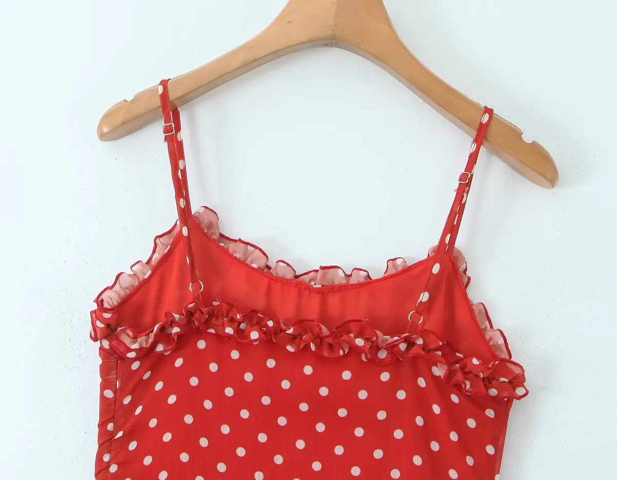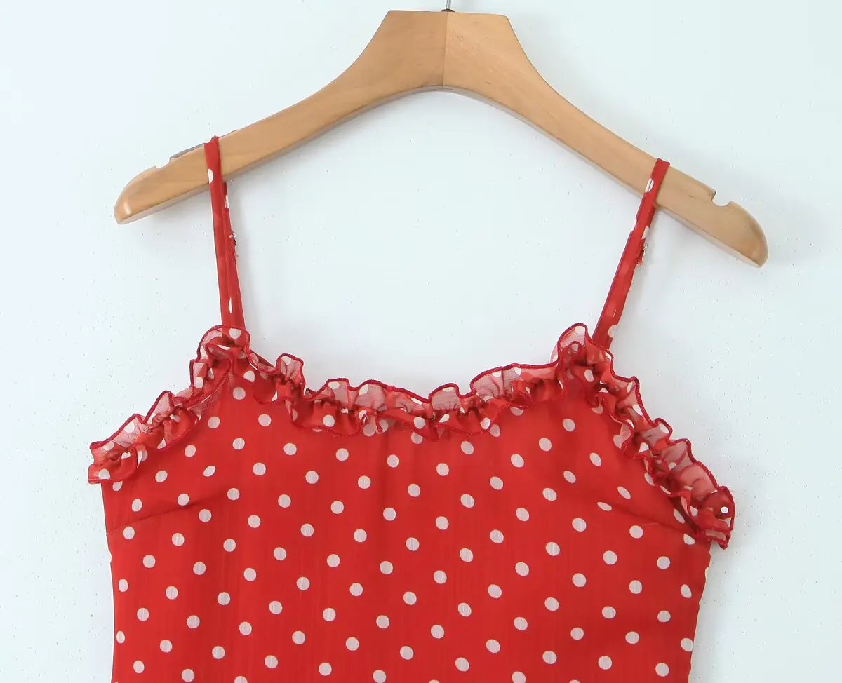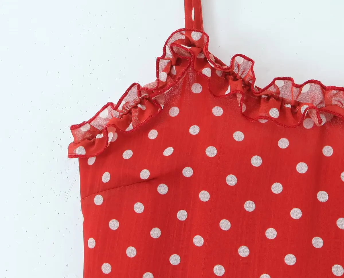 New 2025 Women Polka Dot Red Sexy Sling Dreses Ruffle O Neck A-line Midi Summer