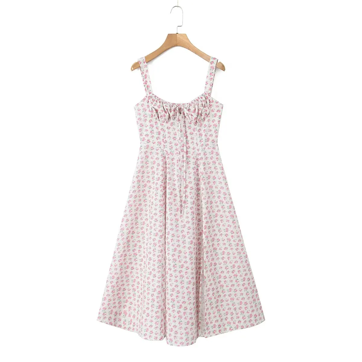 New Women Spaghetti Strap Sexy Slit Floral Print Dresses Elegant A-line Midi Female Holiday Summer Dress Lace Up Robe
