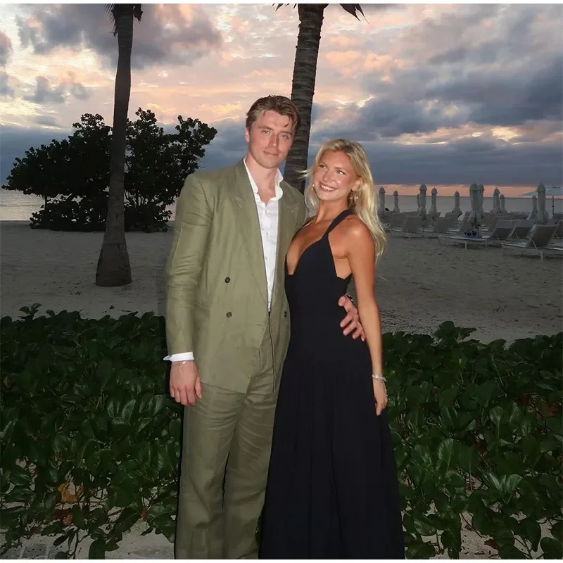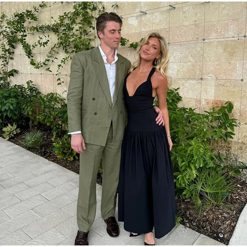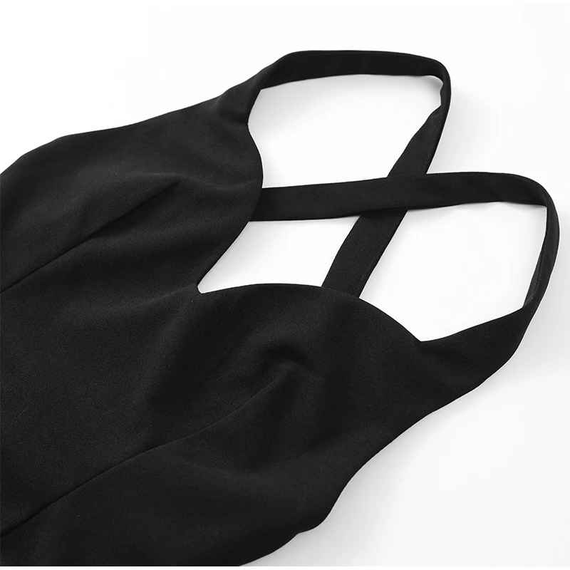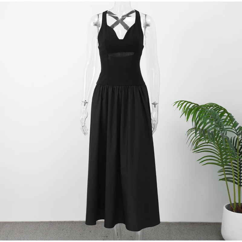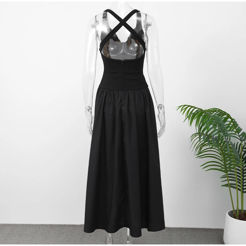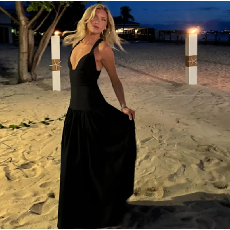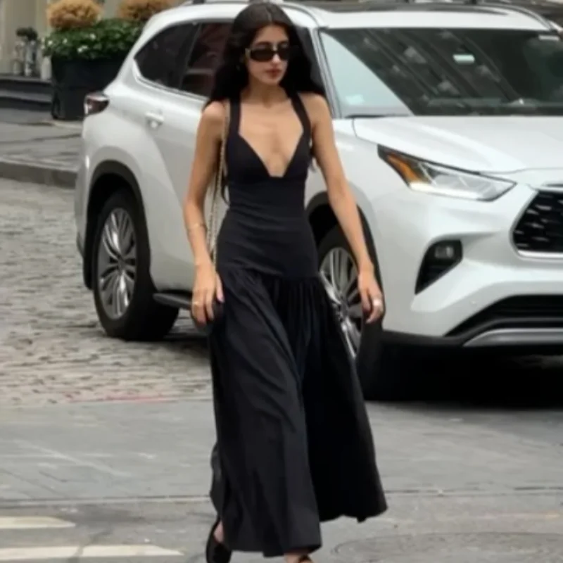 New Wrinkled V-neck Sleeveless Suspender Black Dresses Casual Backless Slim Fit Women's Long Dress Summer Street Beach Vestidos