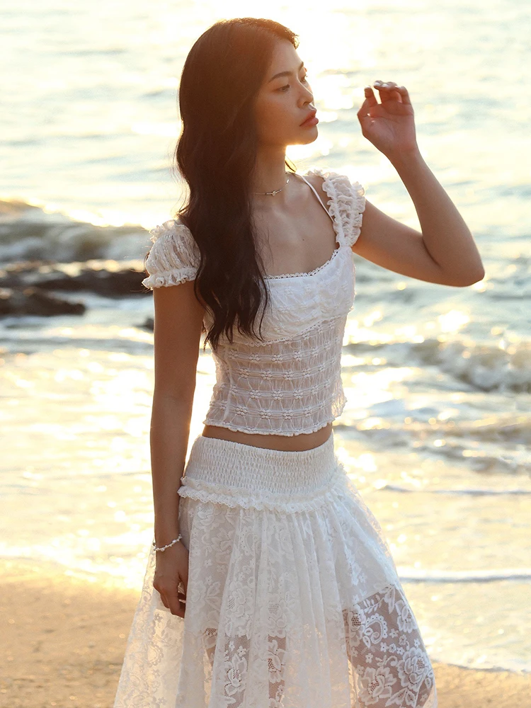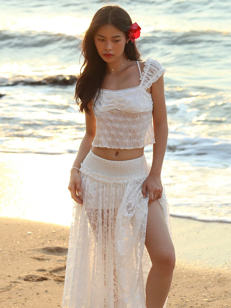 Patchwork 2-Piece Set Jacquard Women Lace Bandage Mini t-Shirt+High Slits Skinny Skirt Elasticated Waist Matching Suits