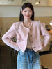 Pink Sweet Tweed Jackets Women Vintage O Neck Cute Elegant Long Sleeve Short Coats Retro Casual Single Breasted Pockets Outwear