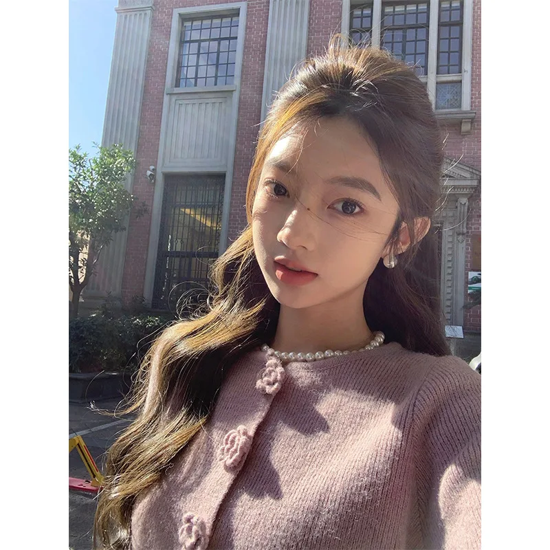 Purple Camellia Knitted Cardigan Women Korean Wear Chic and Beautiful Short Tops and Jackets in Early Autumn