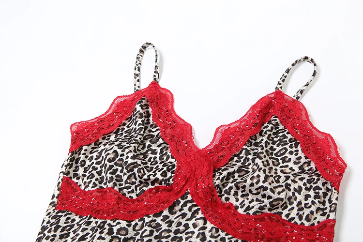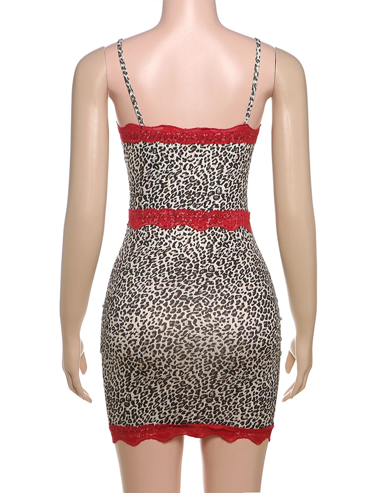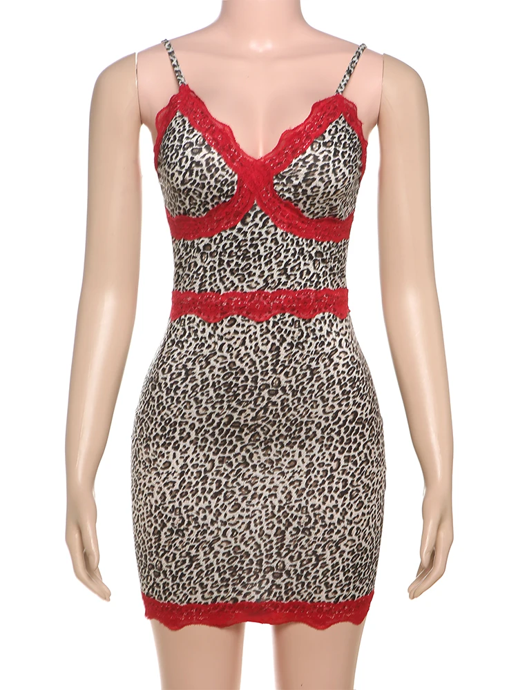 Red Lace Patchwork Dress Women Leopard Print Sexy Backless Sleeveless Summer Trend Midnight Stretch Clubwear Bodycon