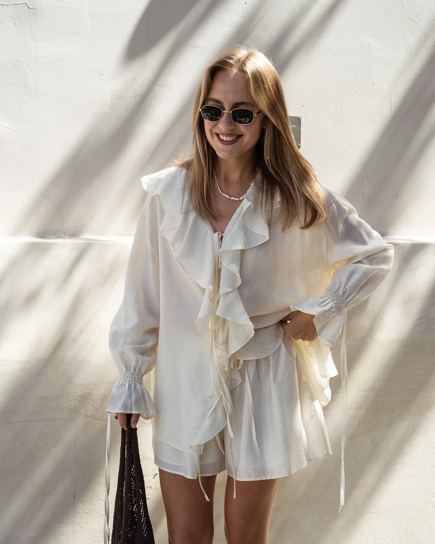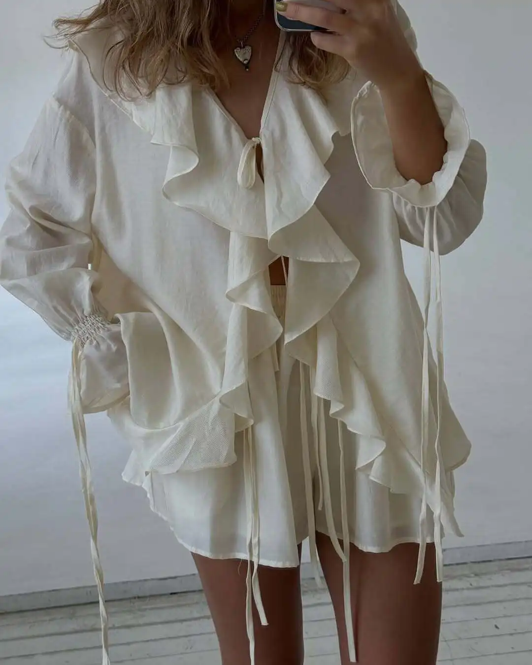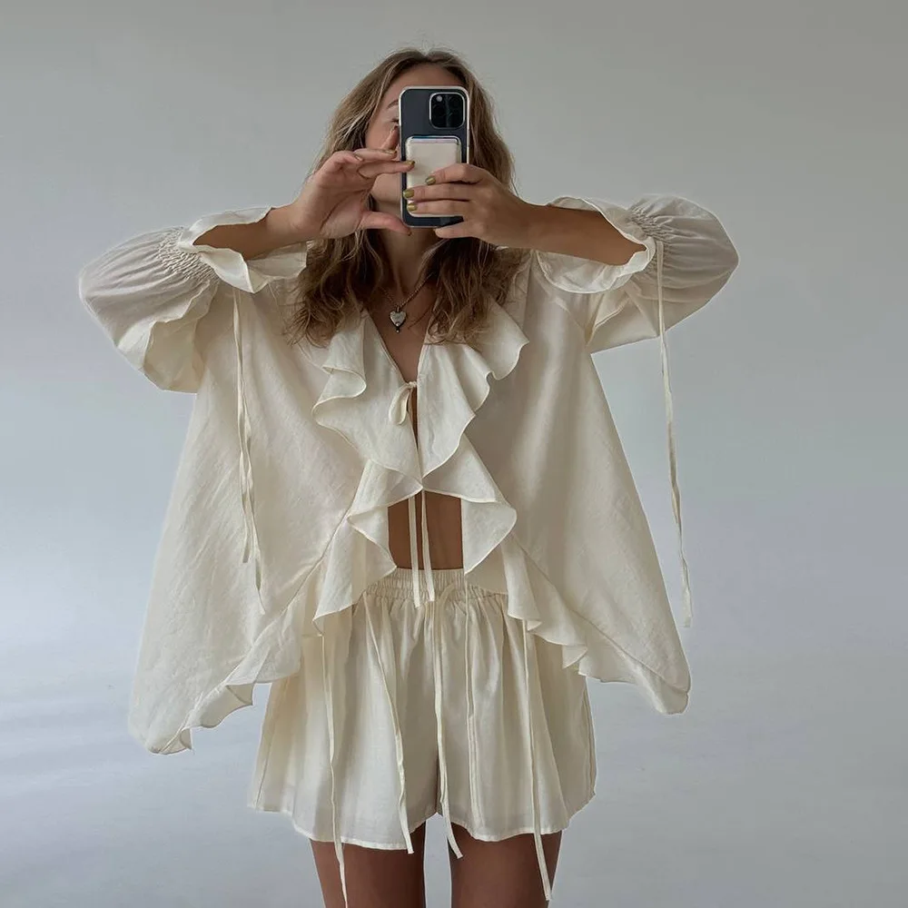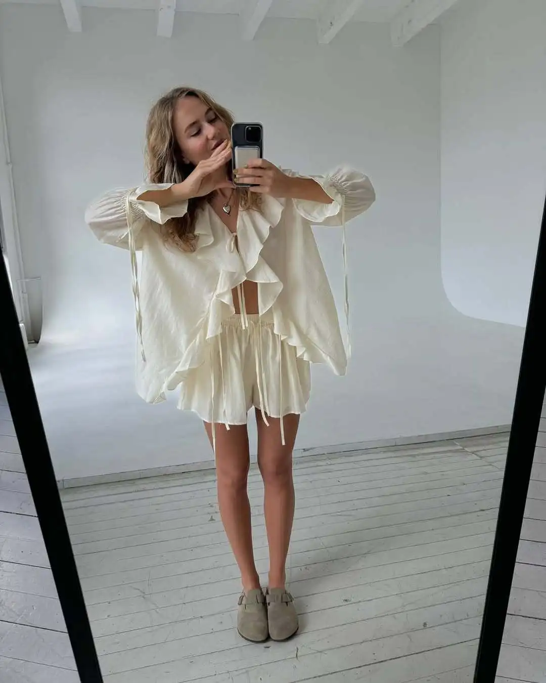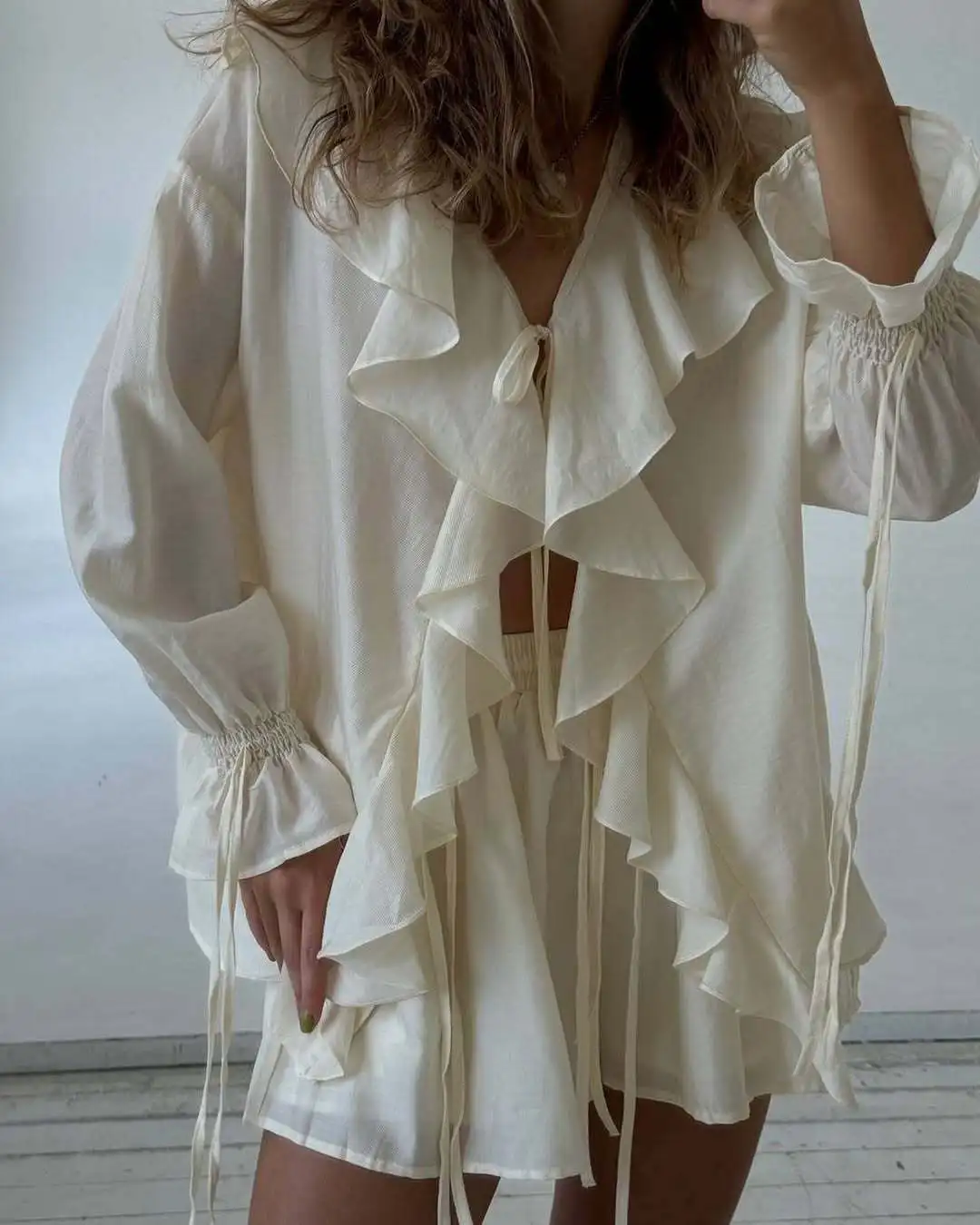 Ruffle Beige Simple Casual Women Sets V-neck Long Sleeve Shirts Top And Shorts Summer Outfits Vacation Chic Fashion 2 Piece Set