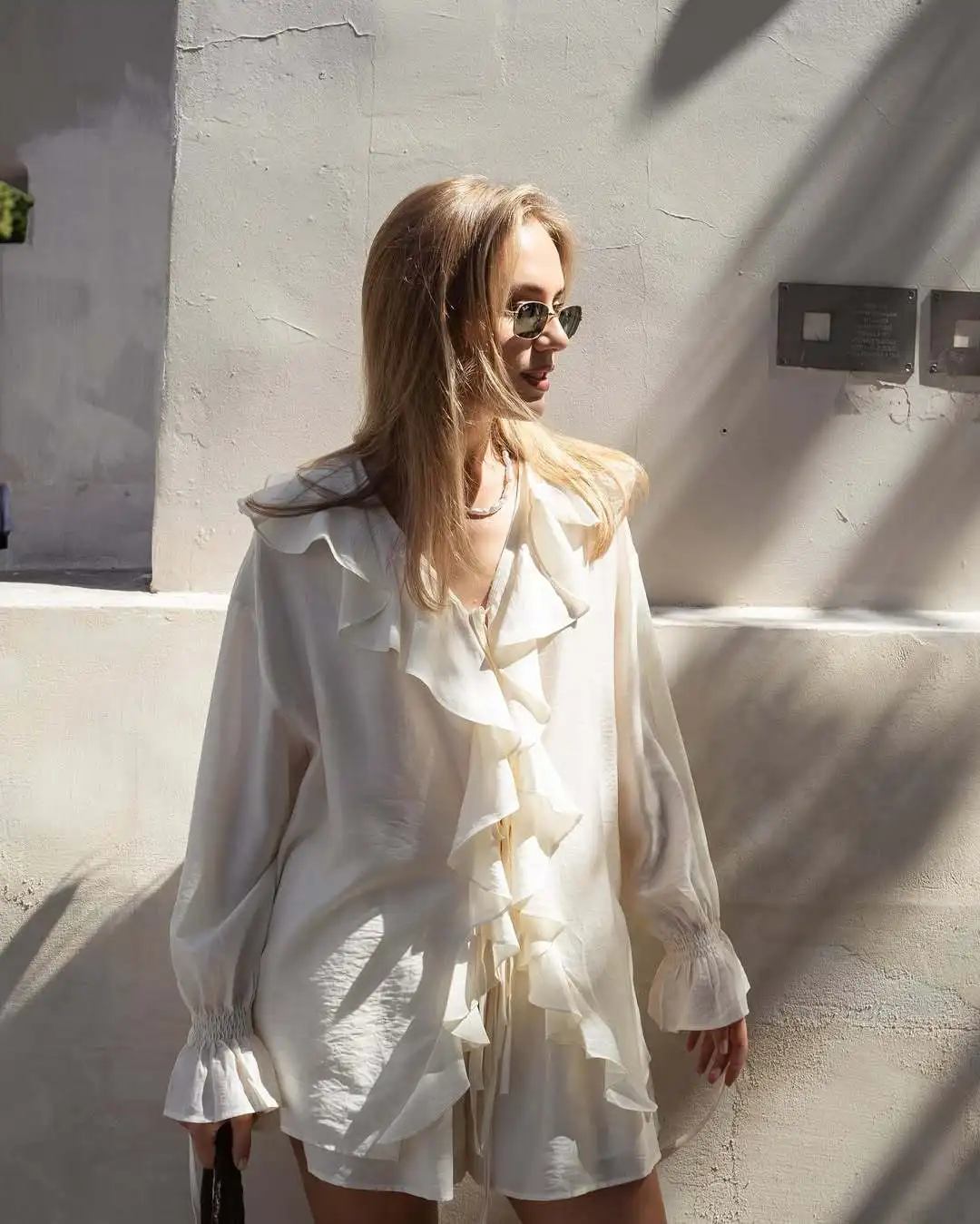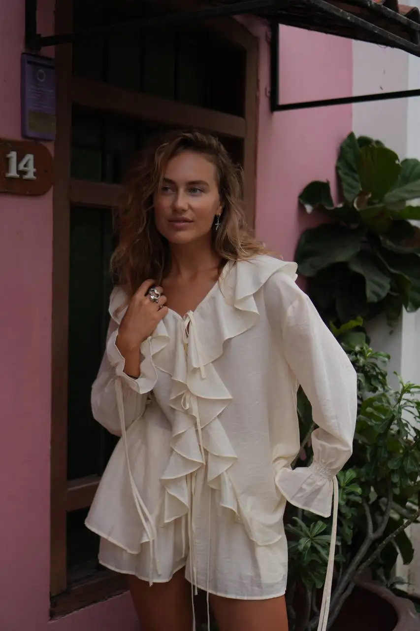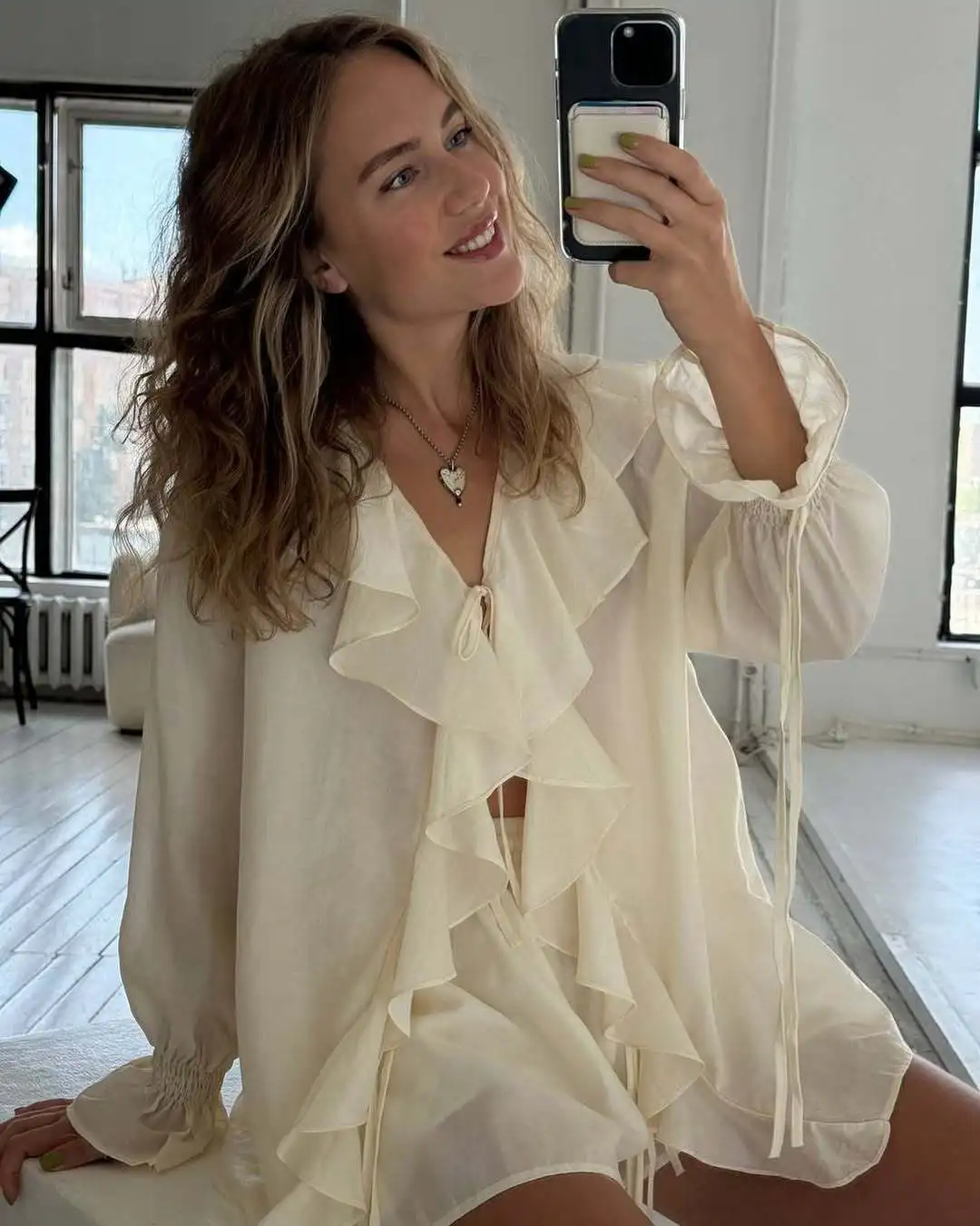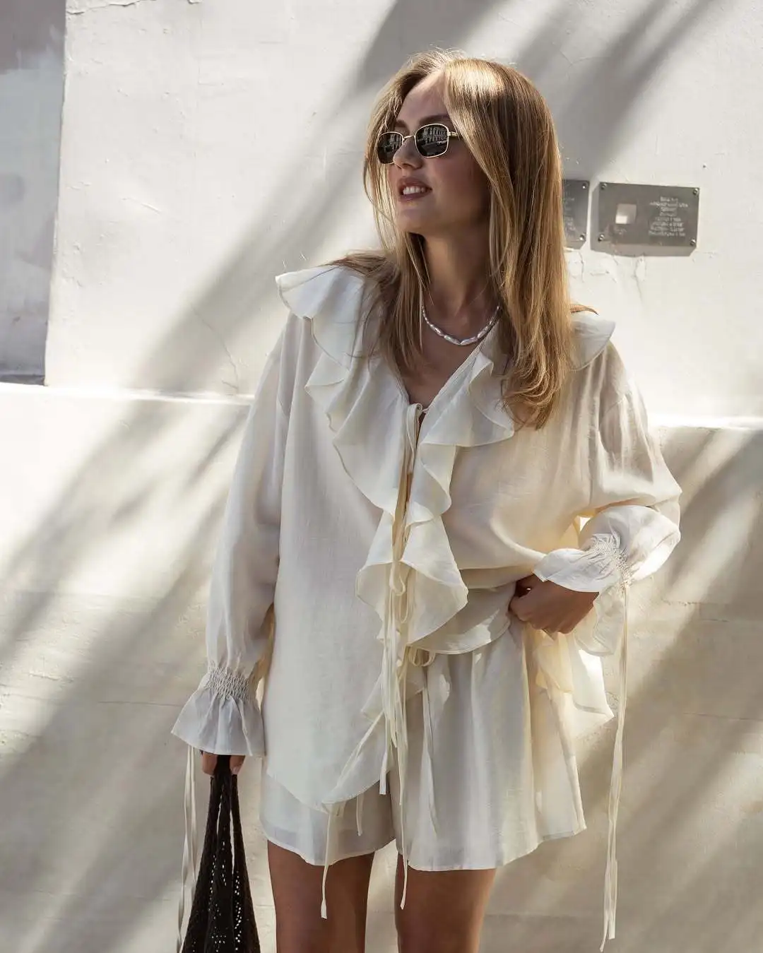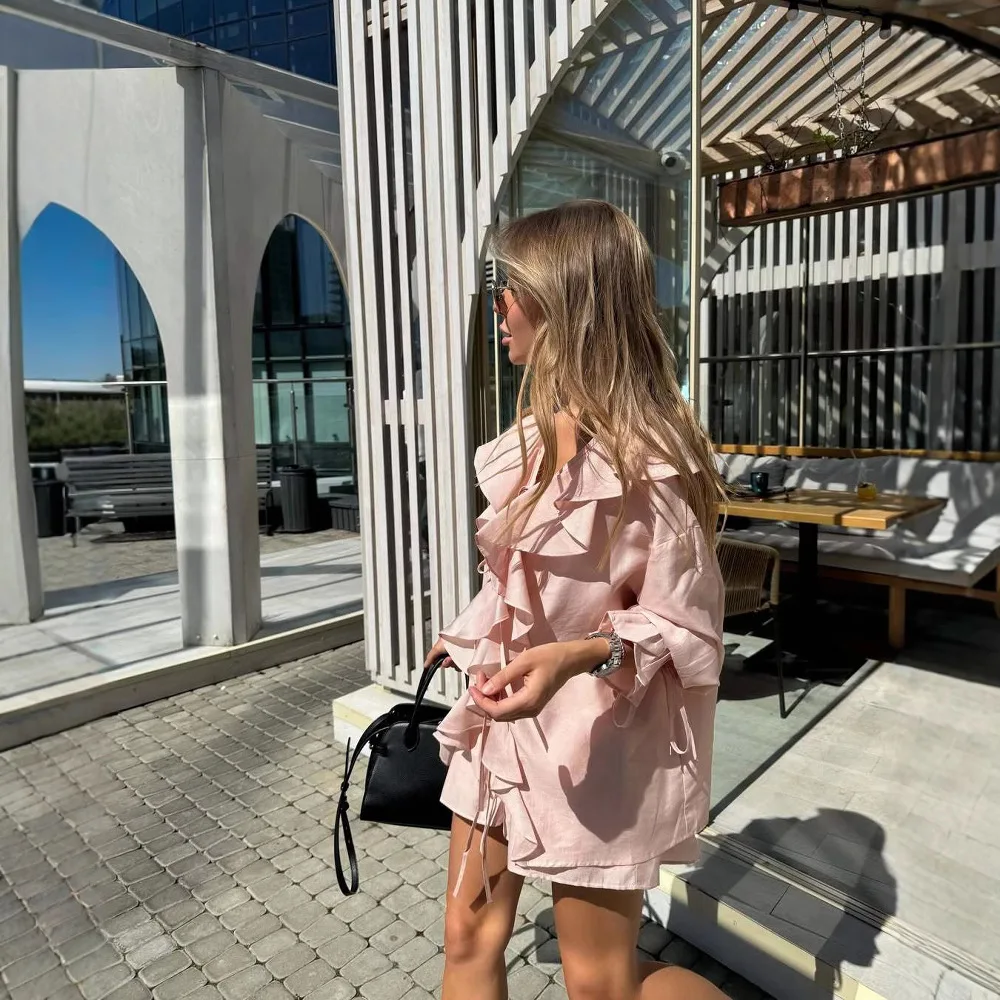 Ruffle Beige Simple Casual Women Sets V-neck Long Sleeve Shirts Top And Shorts Summer Outfits Vacation Chic Fashion 2 Piece Set