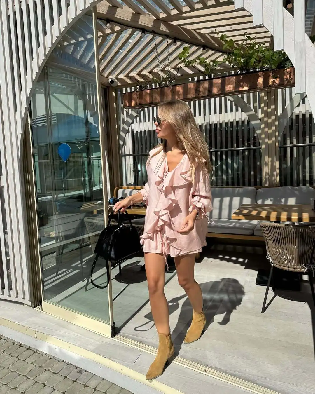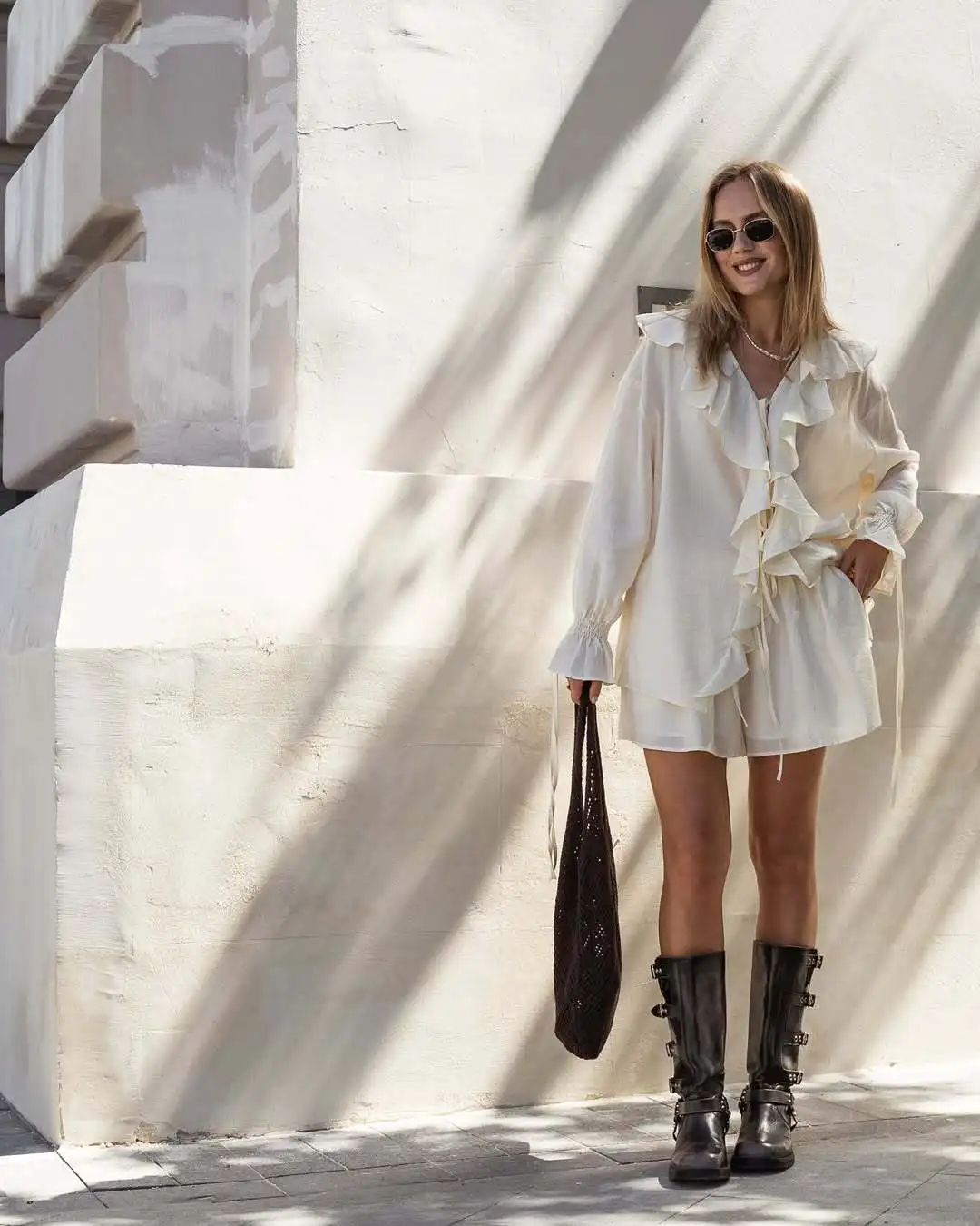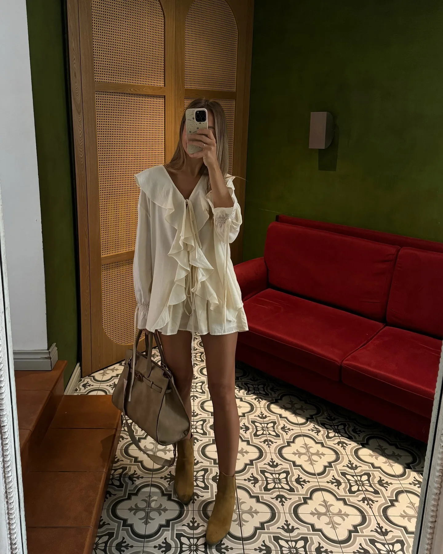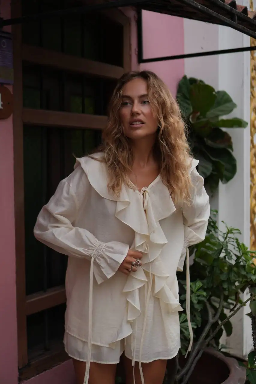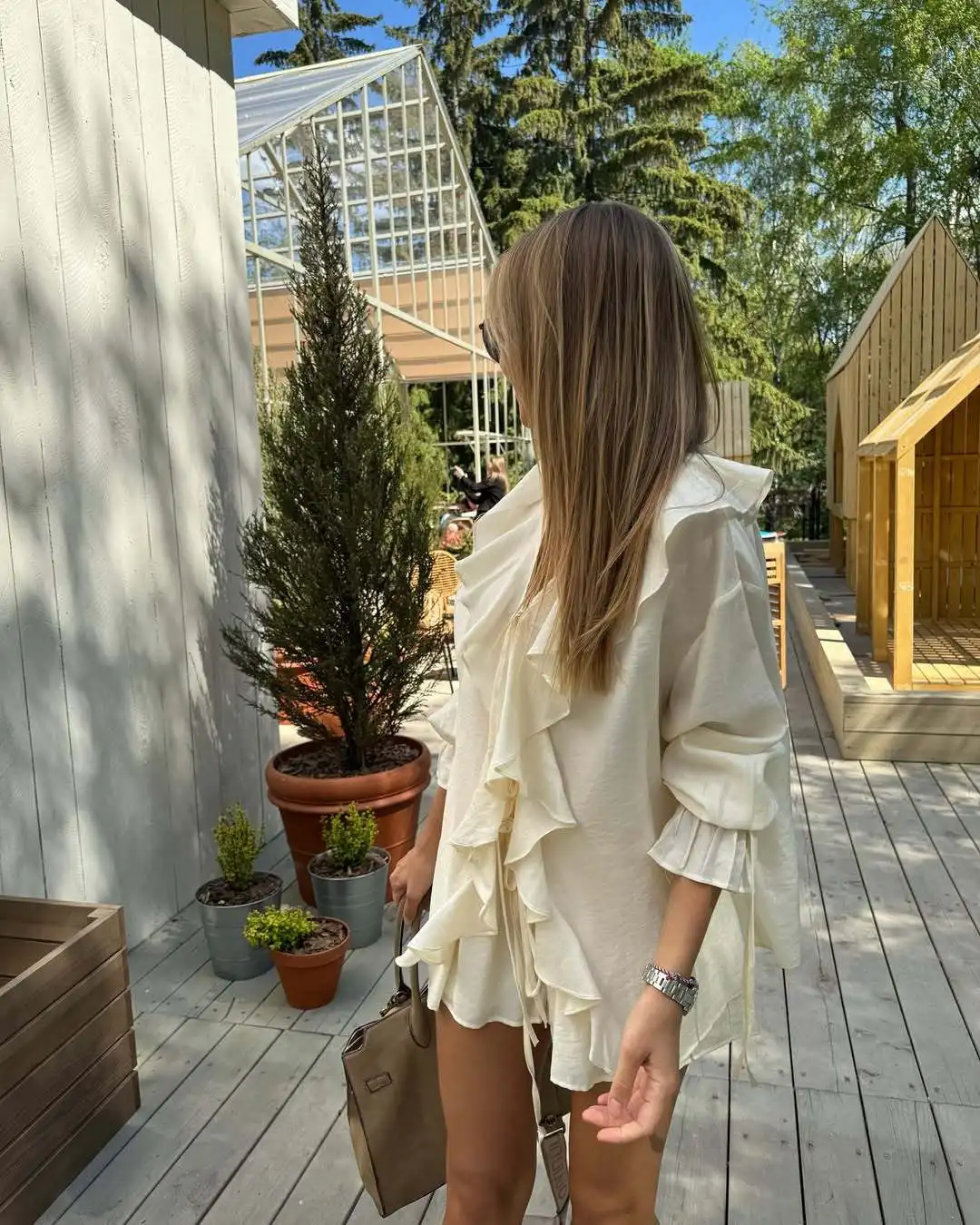 Ruffle Beige Simple Casual Women Sets V-neck Long Sleeve Shirts Top And Shorts Summer Outfits Vacation Chic Fashion 2 Piece Set