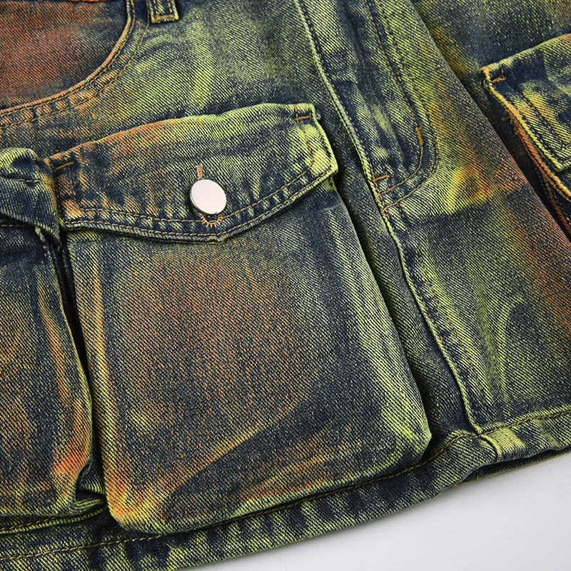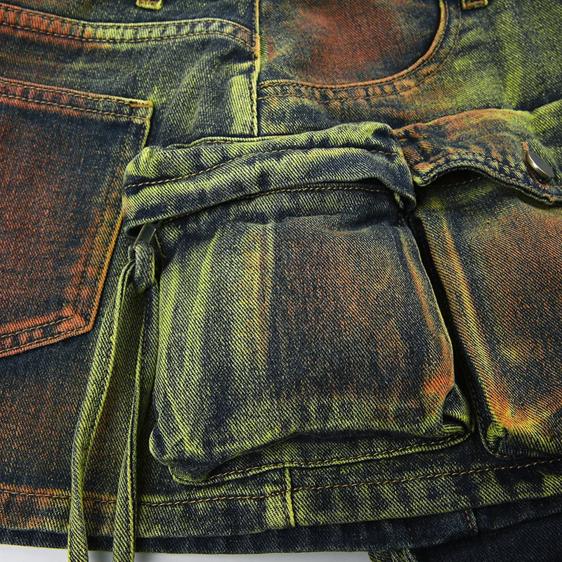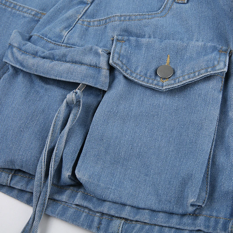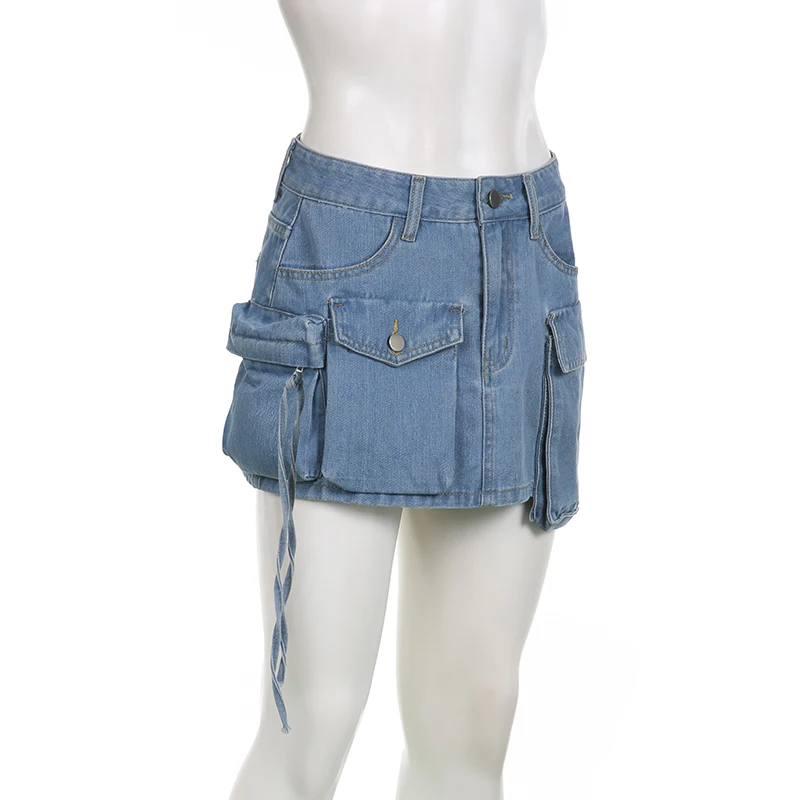 Safari Style Big Pockets Denim Skirt Sexy Slim Mid-Waisted Mini Skirts Women Summer Fashion Streetwear Ladies