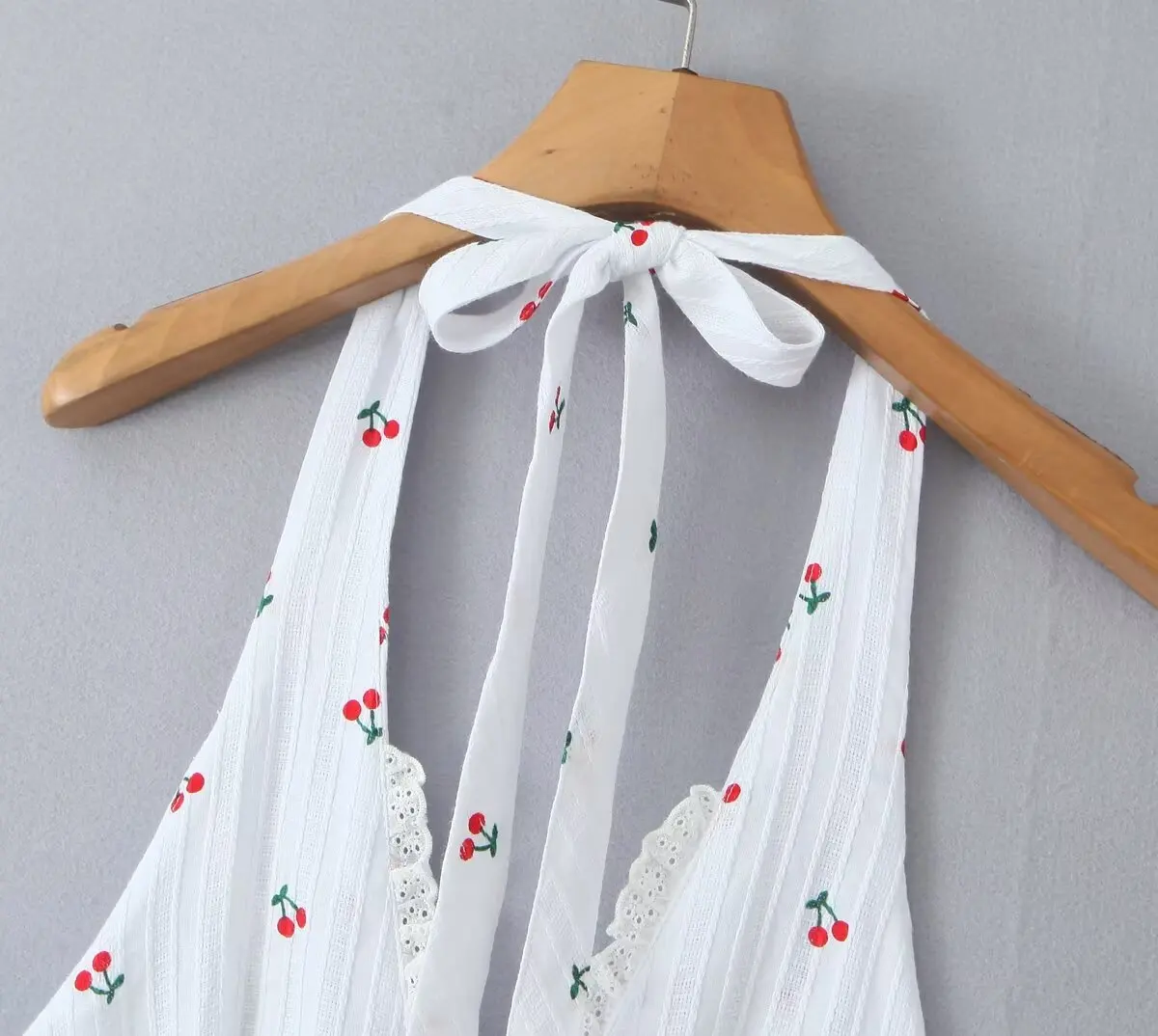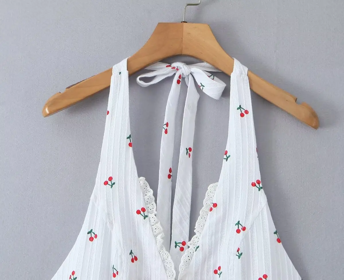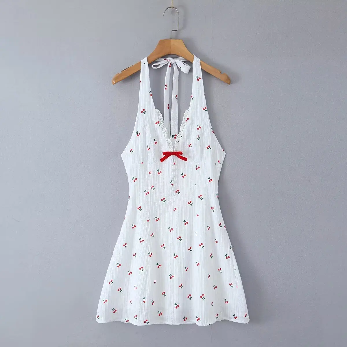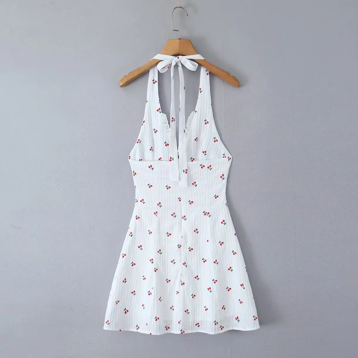 Sexy Backless Halter Holiday Beach Dress For Women Sleeveless A-line Cherry Print Summer Dresses Short Robe