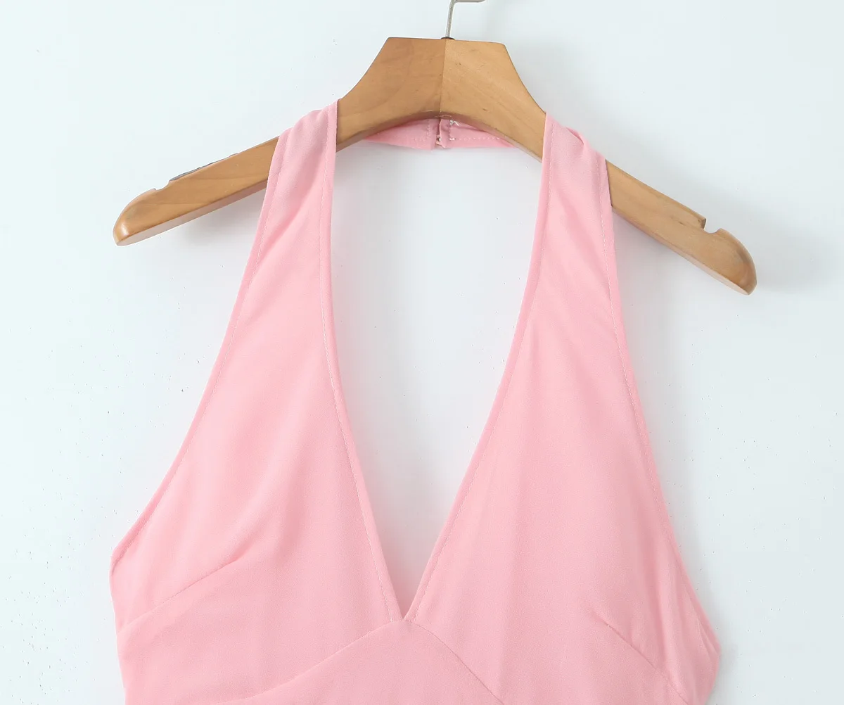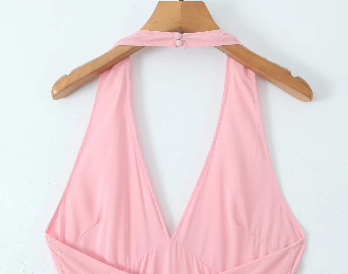 Sexy Backless Pink Halter Dress For Women Sleeveless A-line Midi Party Dresses Summer Robe
