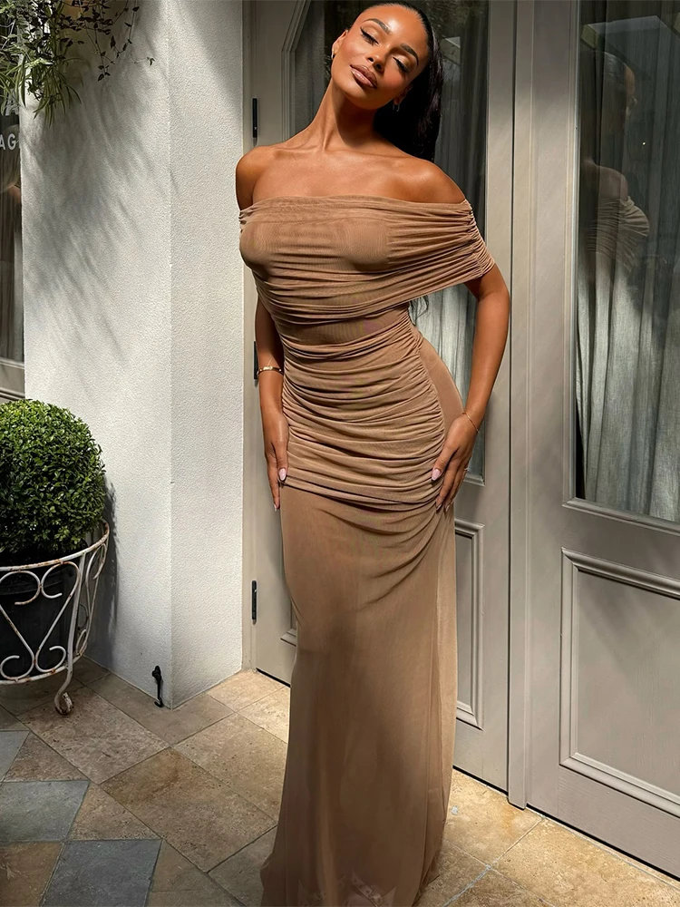 Sexy Coquette Maxi Dress Women See Through Summer Elegant Slash Neck Ruched Stretch Clubwear Midnight Party Vestidos