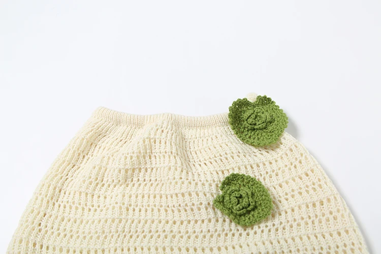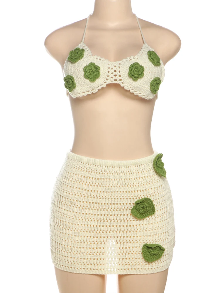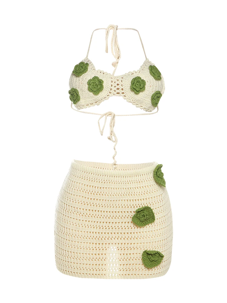 Sexy Crochet Applique 2 Piece Set Women Hollow See Through Halter Bra+Peach Hip Skirts Beach Vacation Matching Clubwear