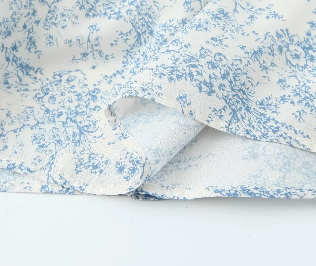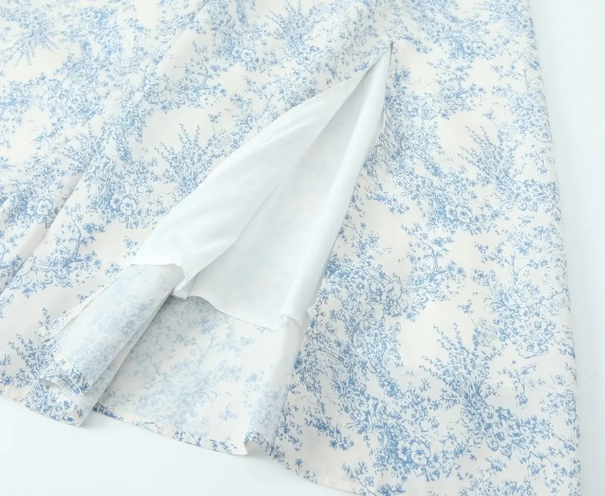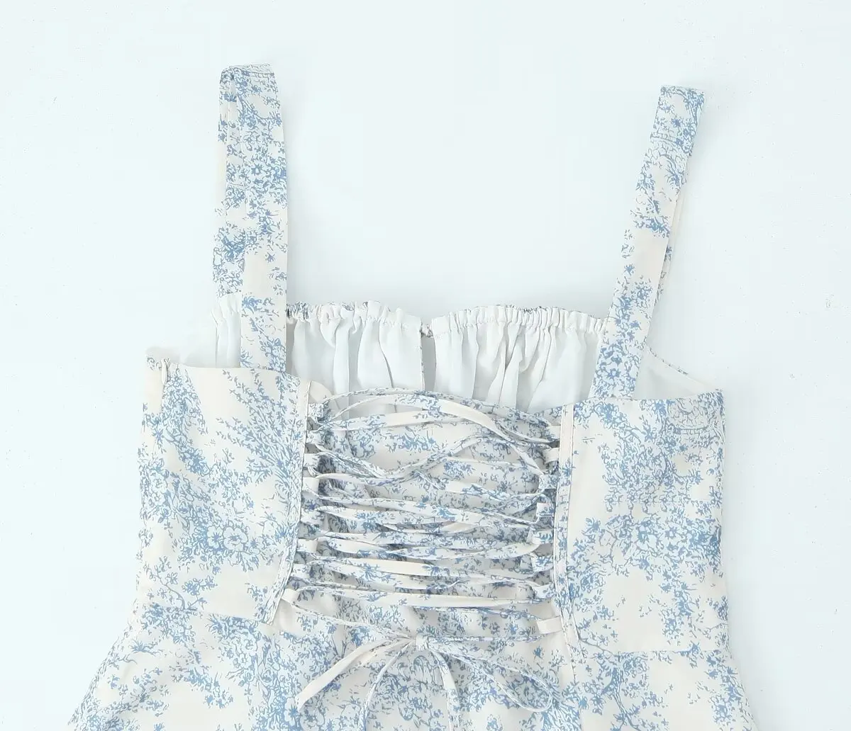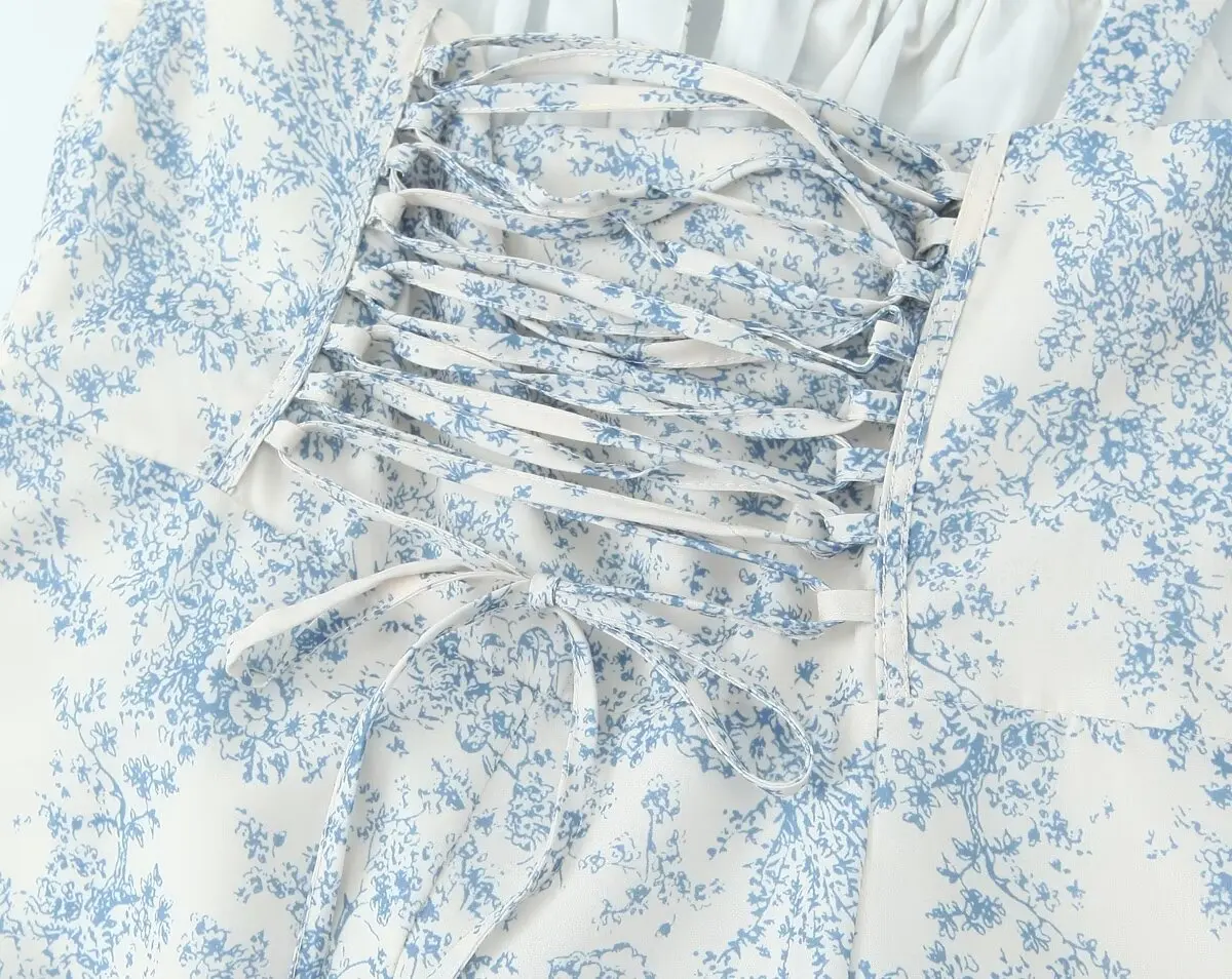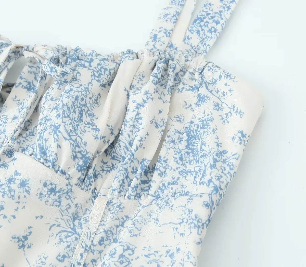 Sexy Elegant Women French Floral Print Sling Midi Dresses Front Slit Lacing Up Back Female A-line Summer Dress Holiday