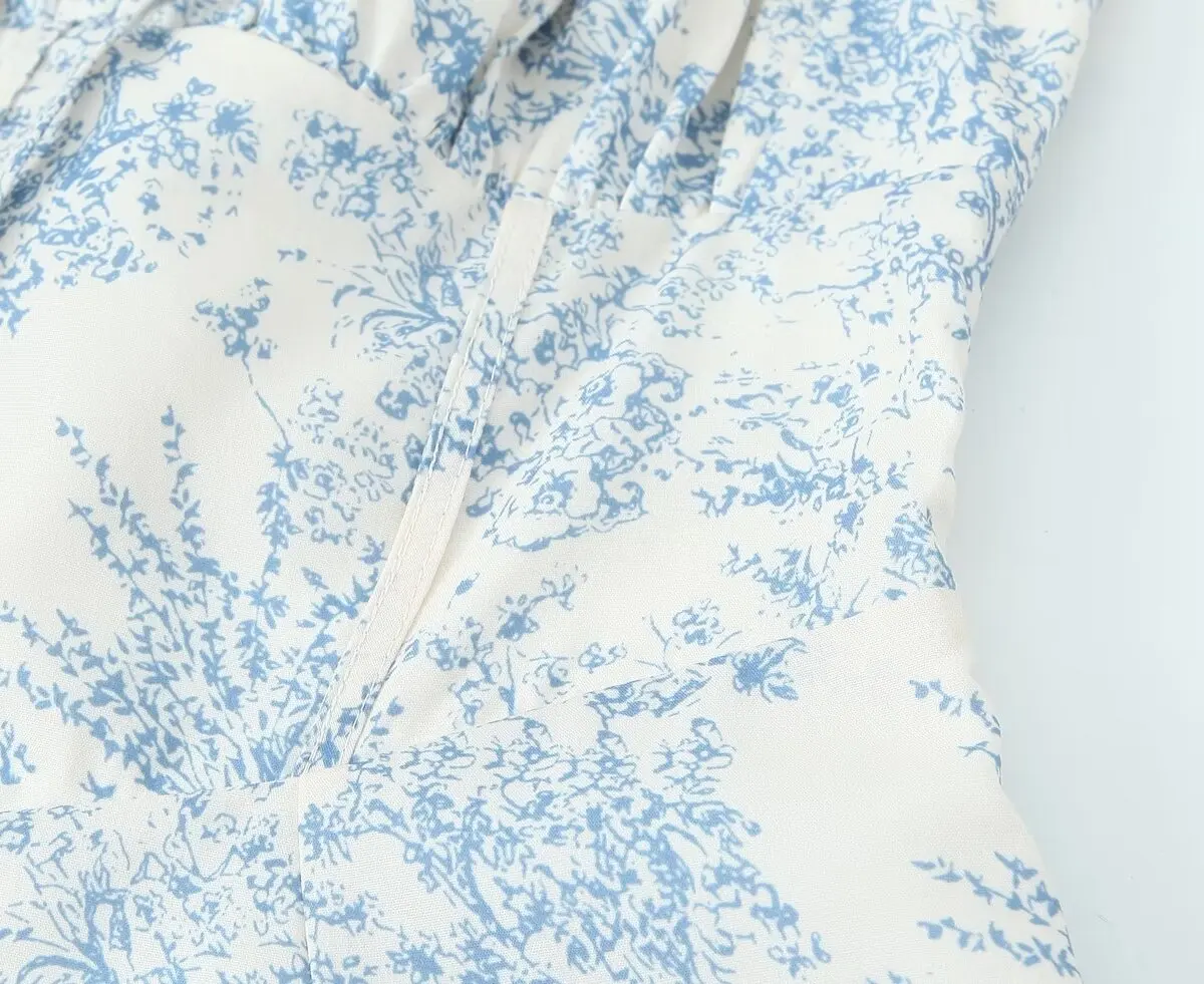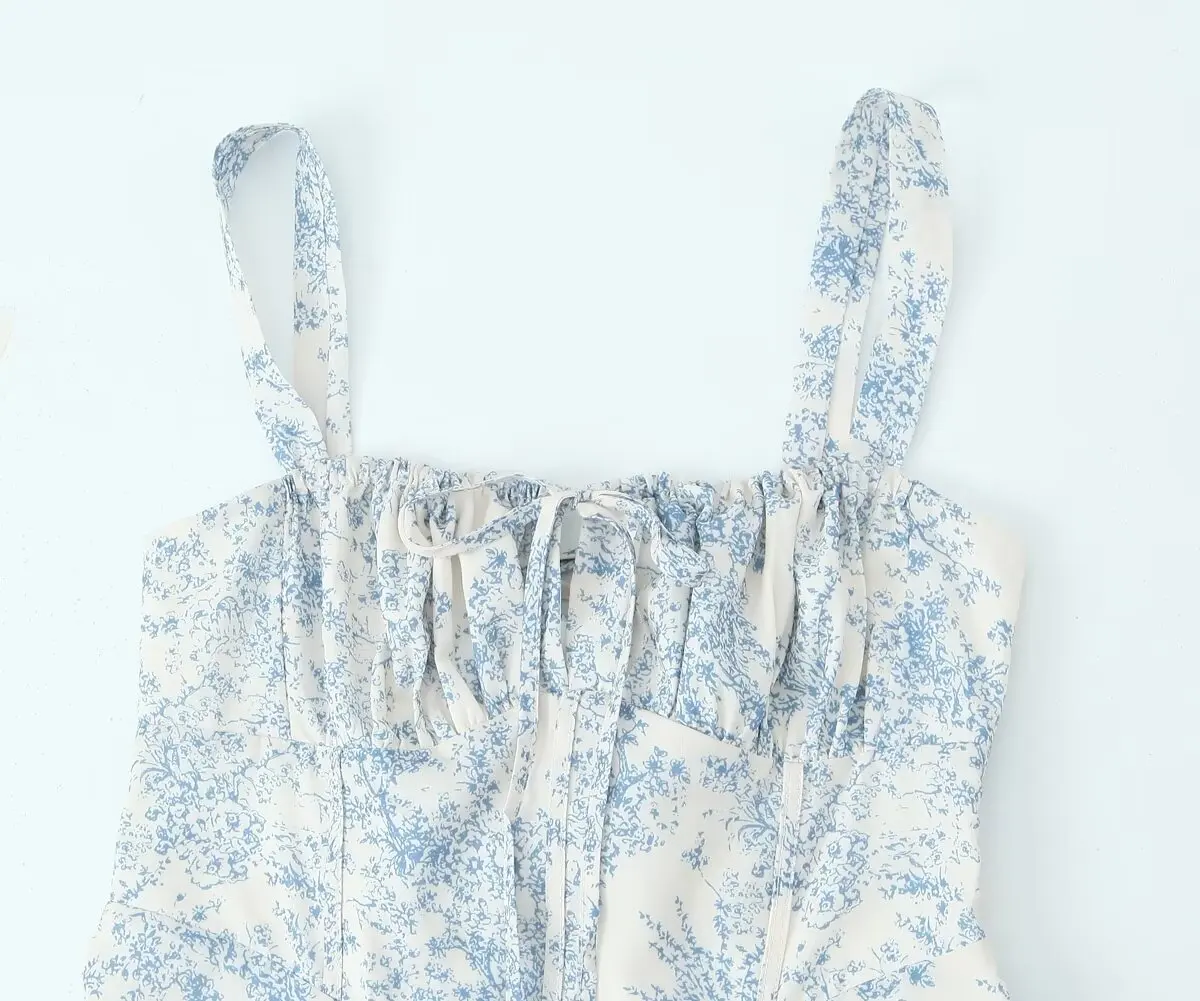 Sexy Elegant Women French Floral Print Sling Midi Dresses Front Slit Lacing Up Back