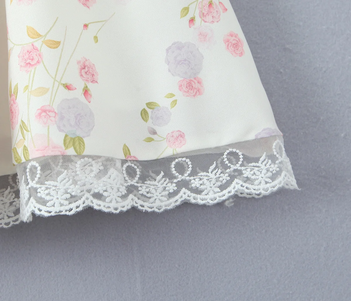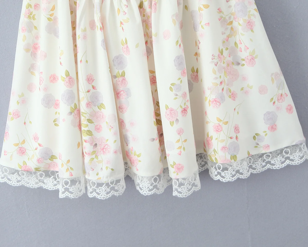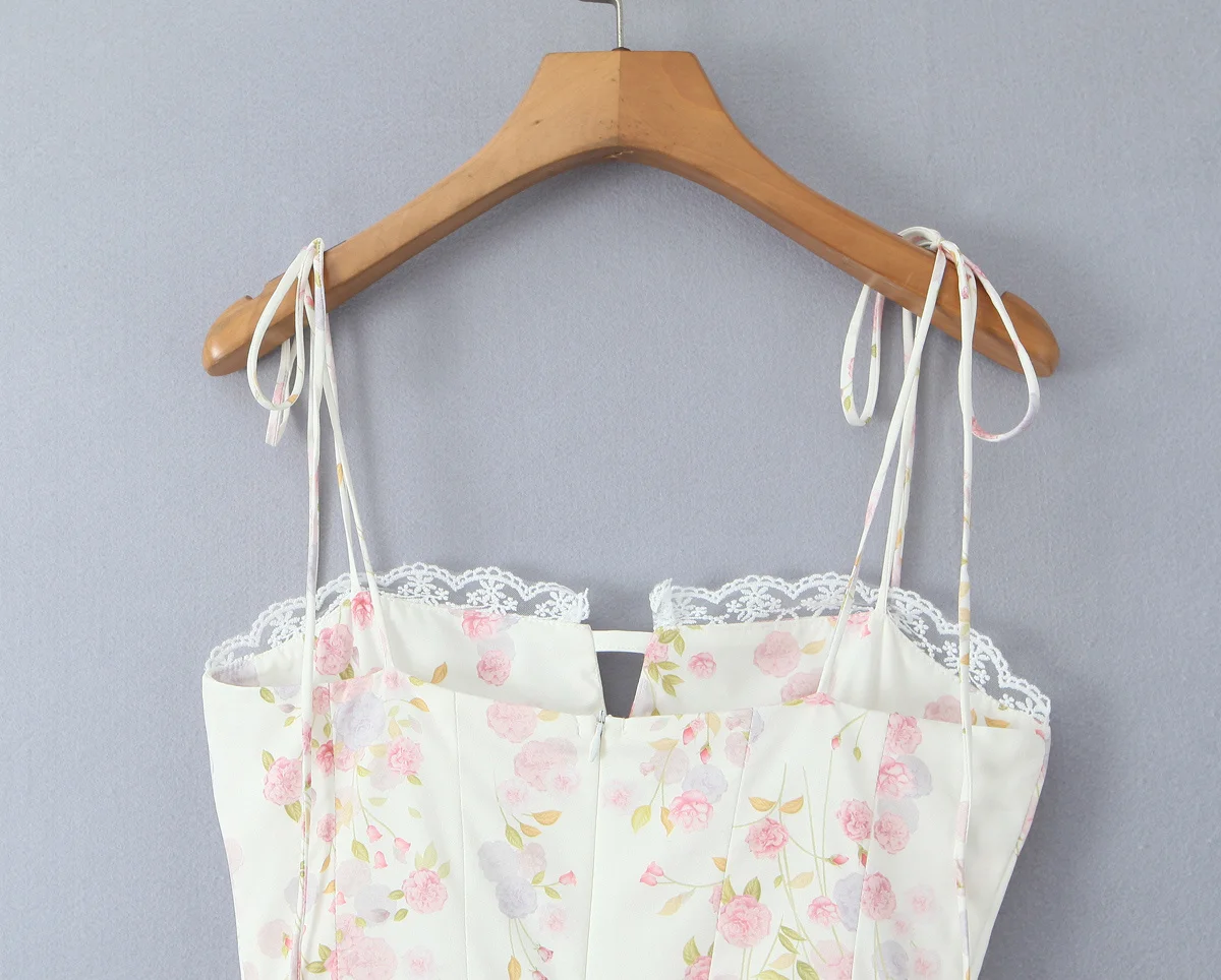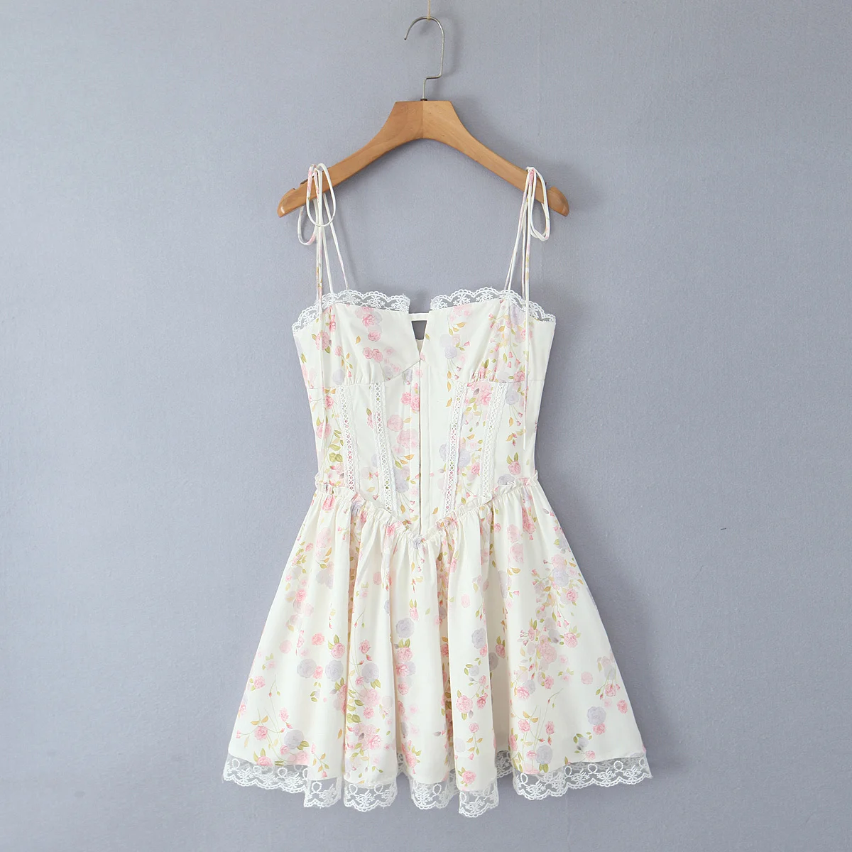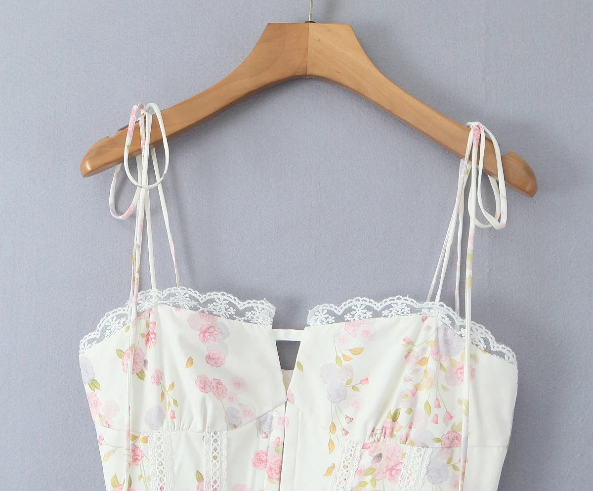 Sexy Elegant Women Lace Patchwork Floral Print Sling Mini Dress Low Waist A-line Summer Holiday Party Dresses Pretty Robe