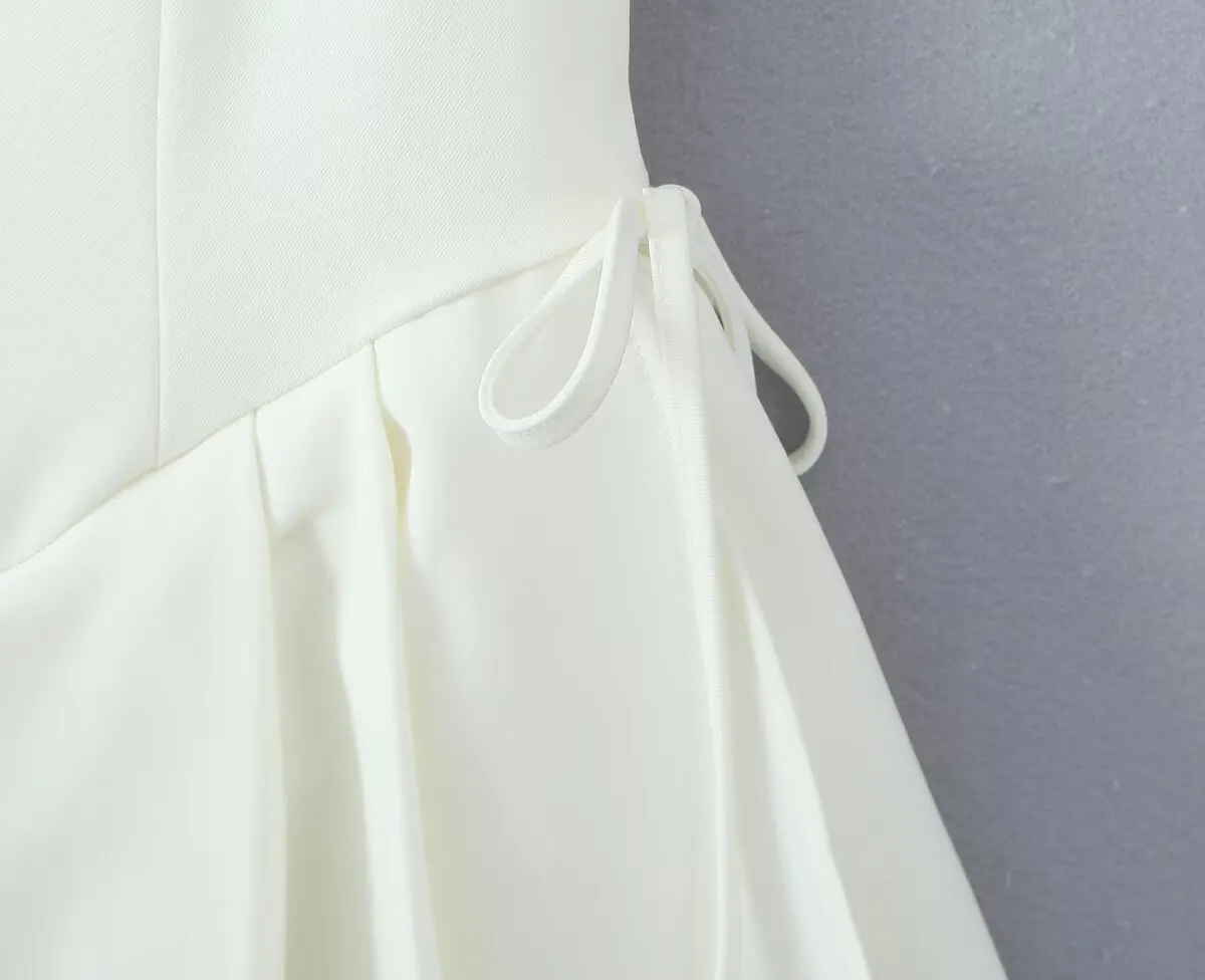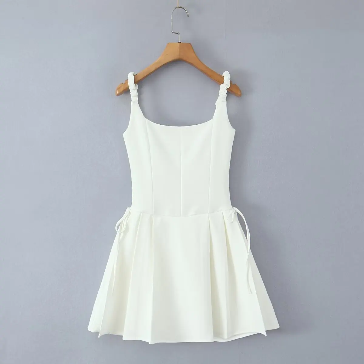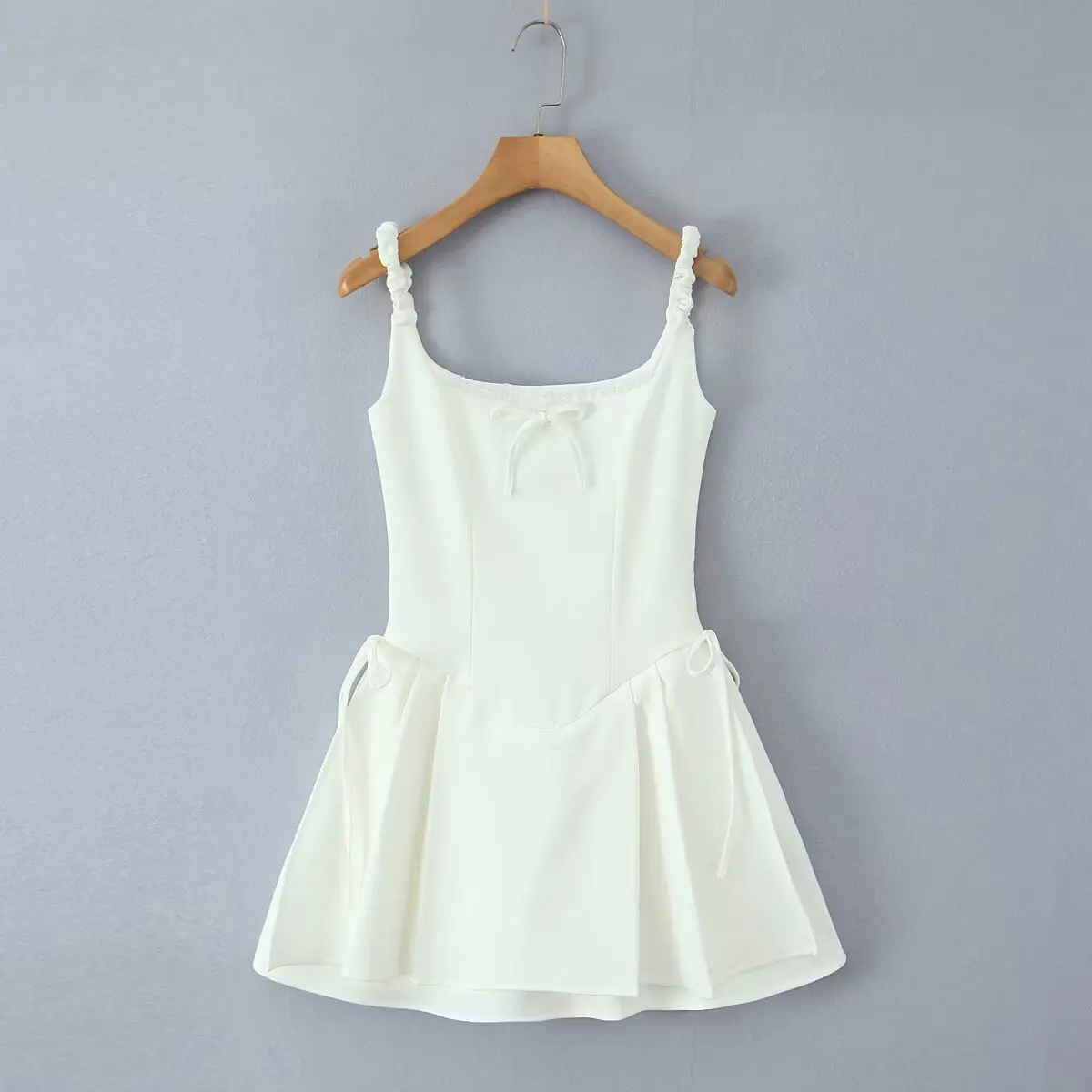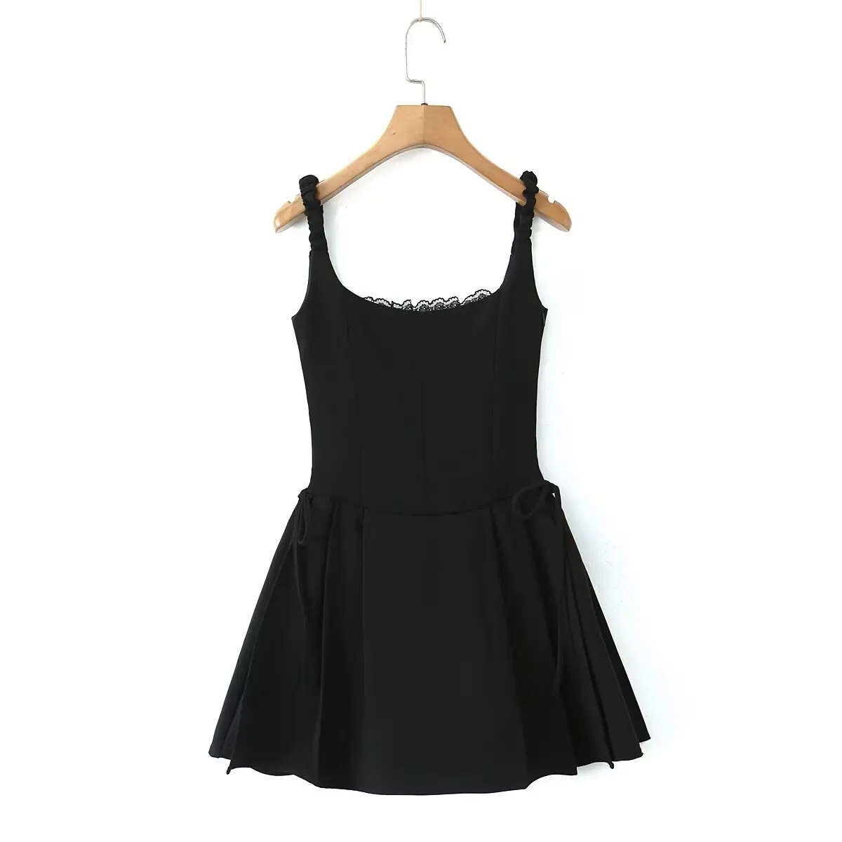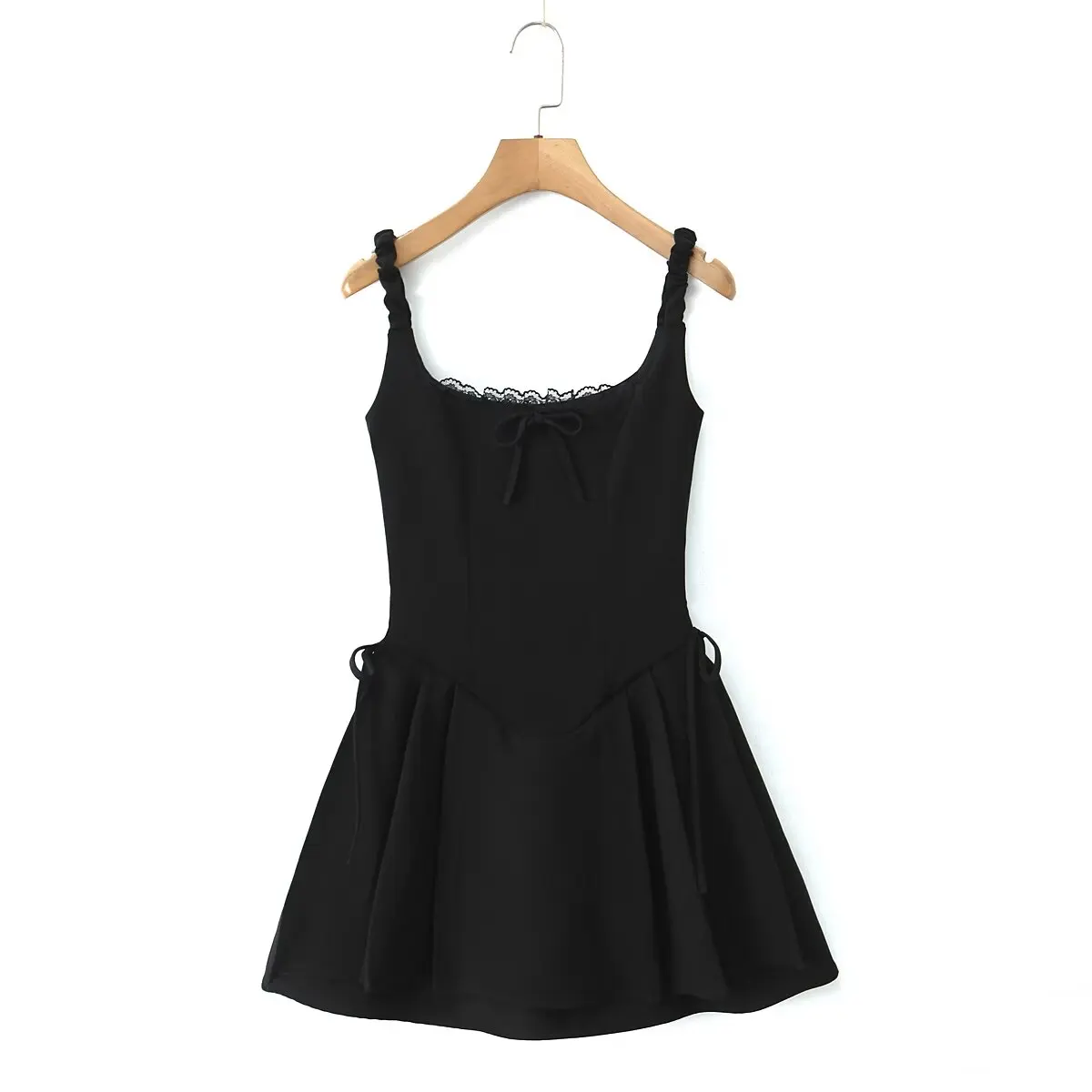 Sexy Elegant Women Lace Trim Black White Spaghetti Straps Dress Bow Low Waist A-line Mini Dresses Evening Party Robe