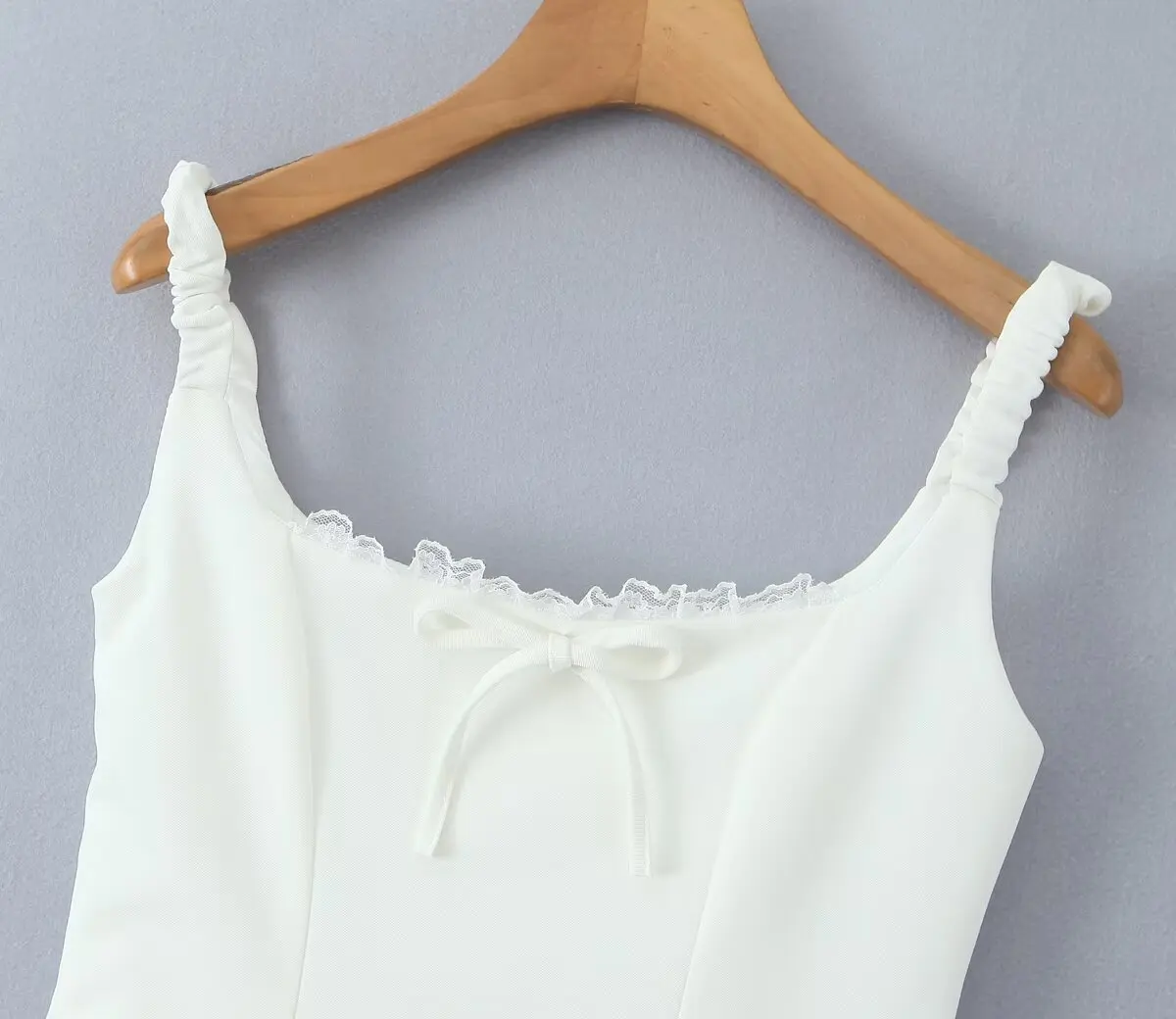 Sexy Elegant Women Lace Trim Black White Spaghetti Straps Dress Bow Low Waist A-