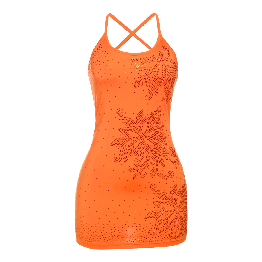 Sexy Flower Rhinestones Dress Women Low-Neck Cross Bandage Backless Fashion Vacation Thin Beach Party Style Mini Bodycon