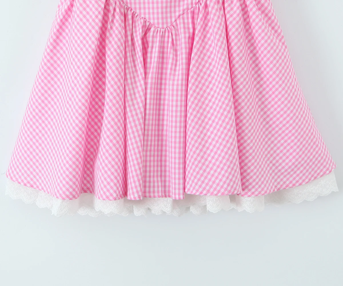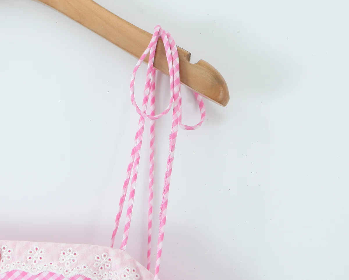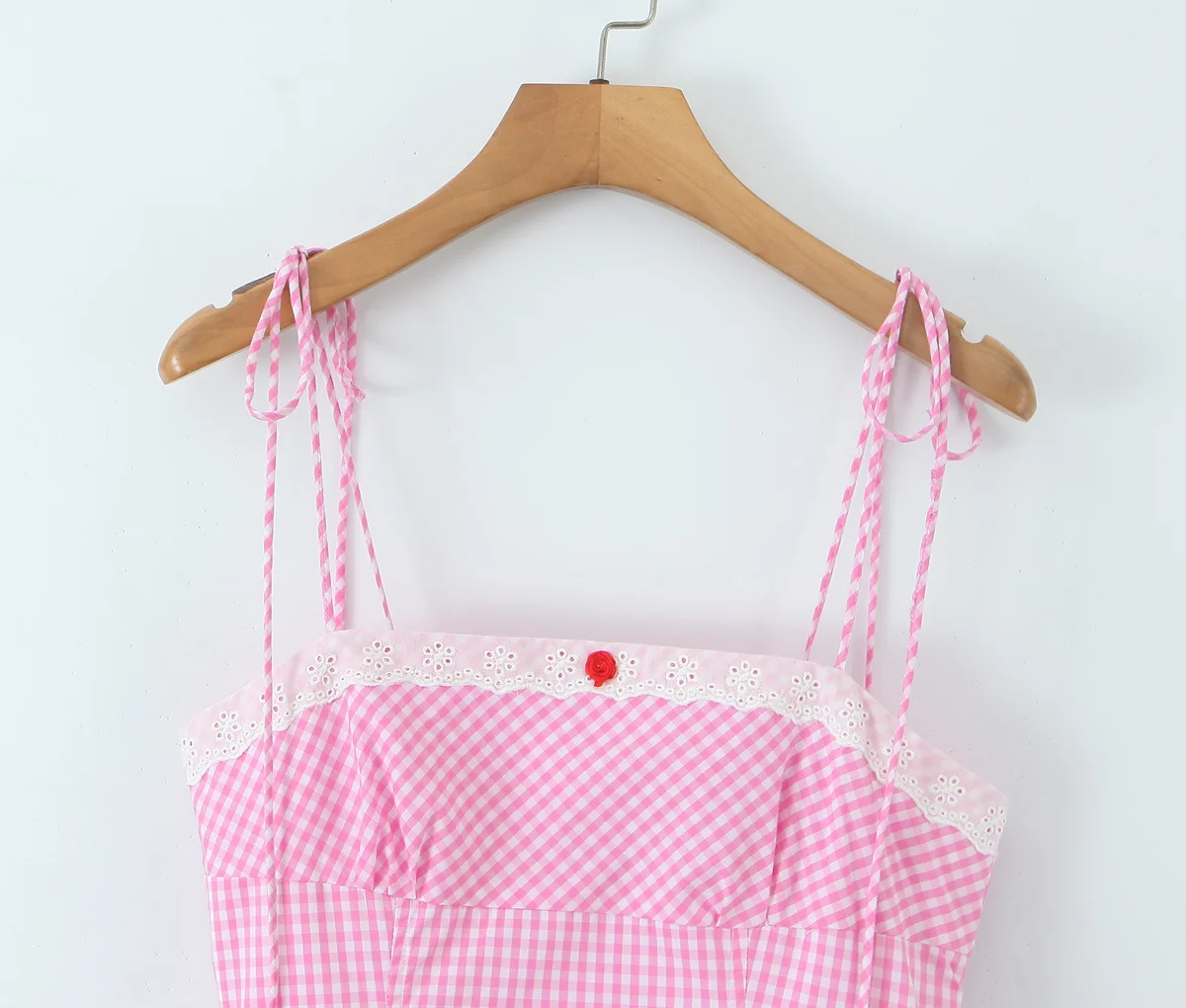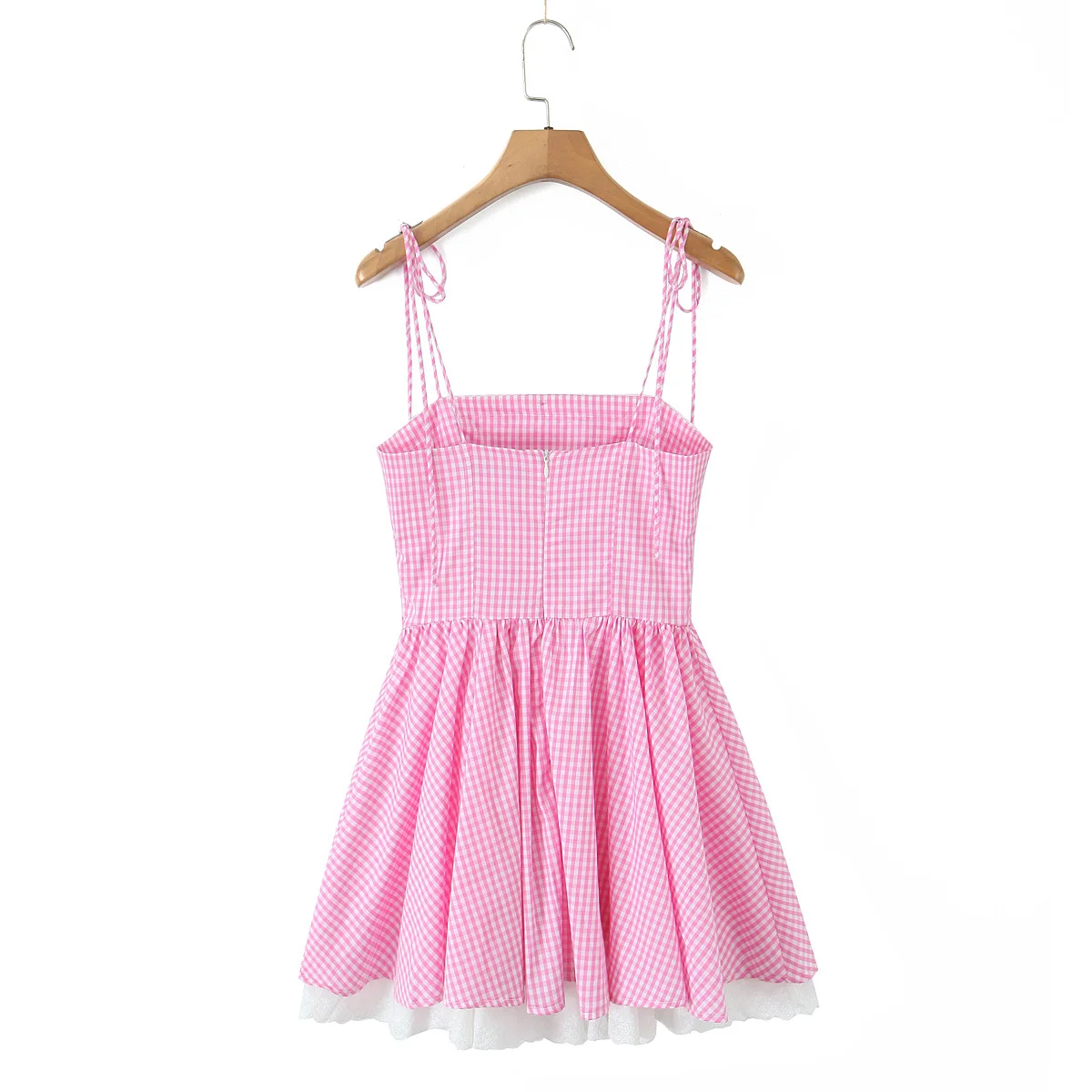 Sexy Spaghetti Straps Pink Plaid Mini Dress Women Embroidery Lace Spliced Elegant A-
