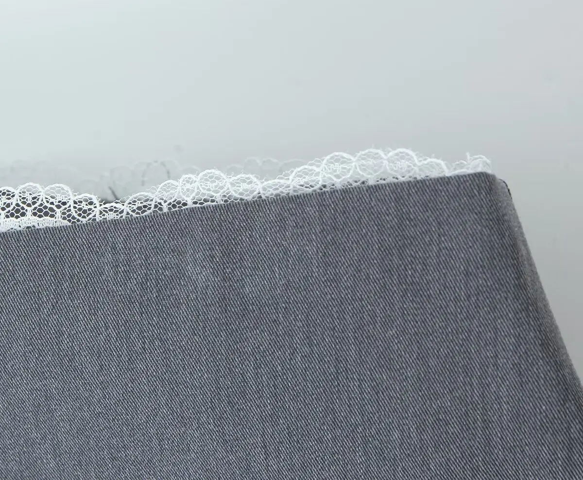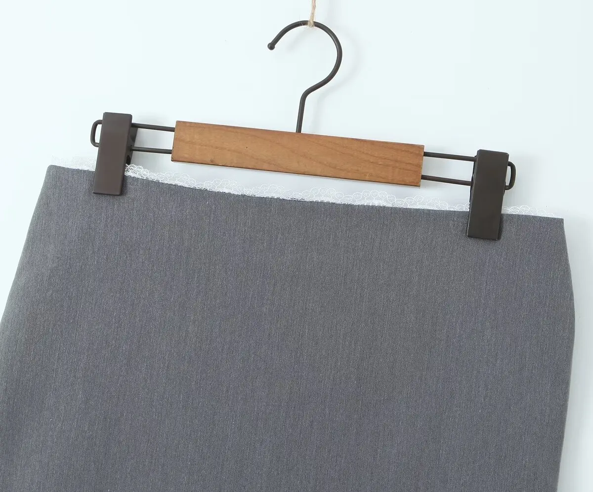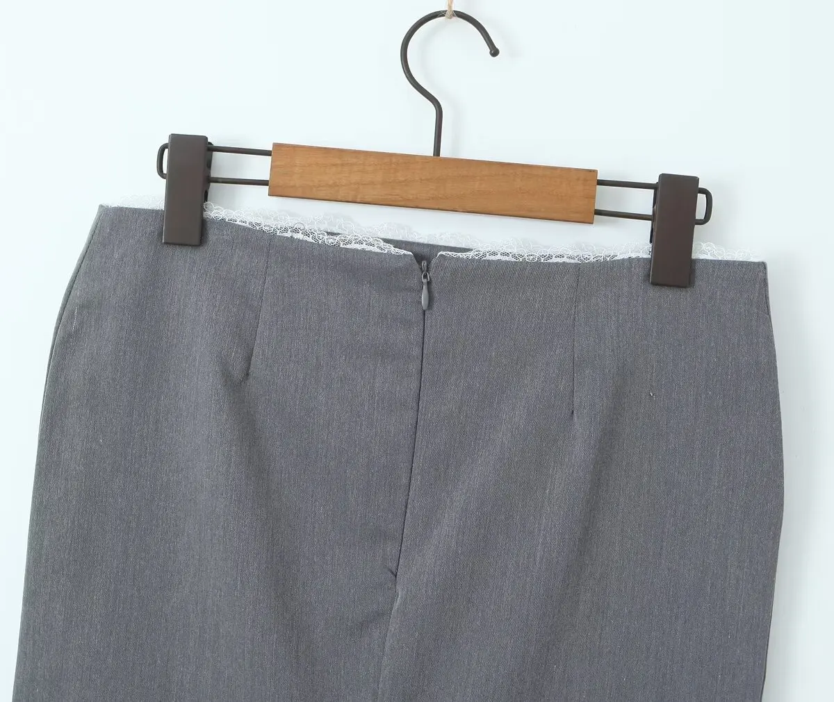 Sexy Women Lace Trim Gray Pencil Skirt Back Slit Low Waist Package Hips Knee Length Skirts