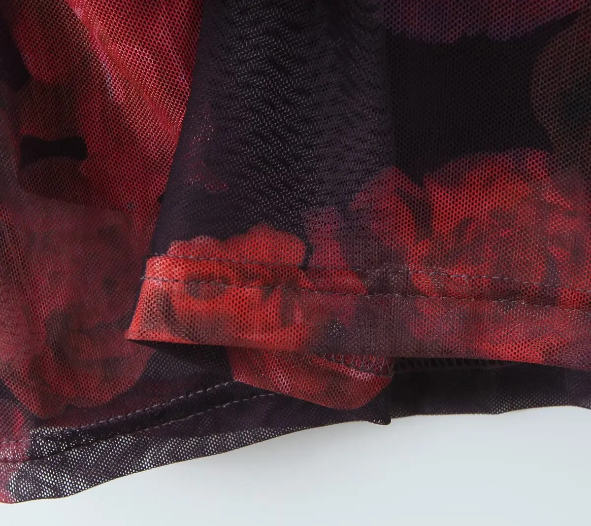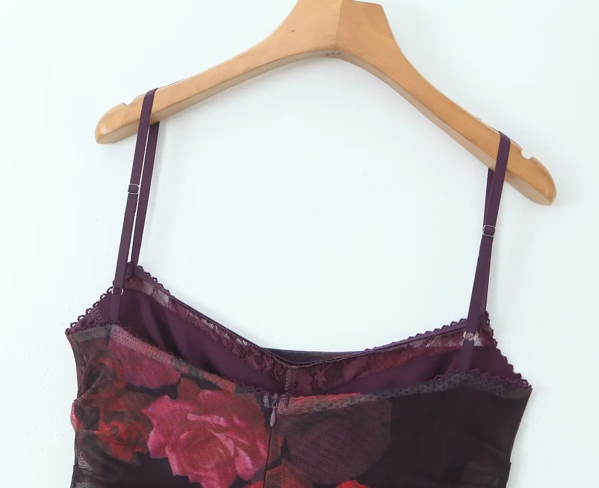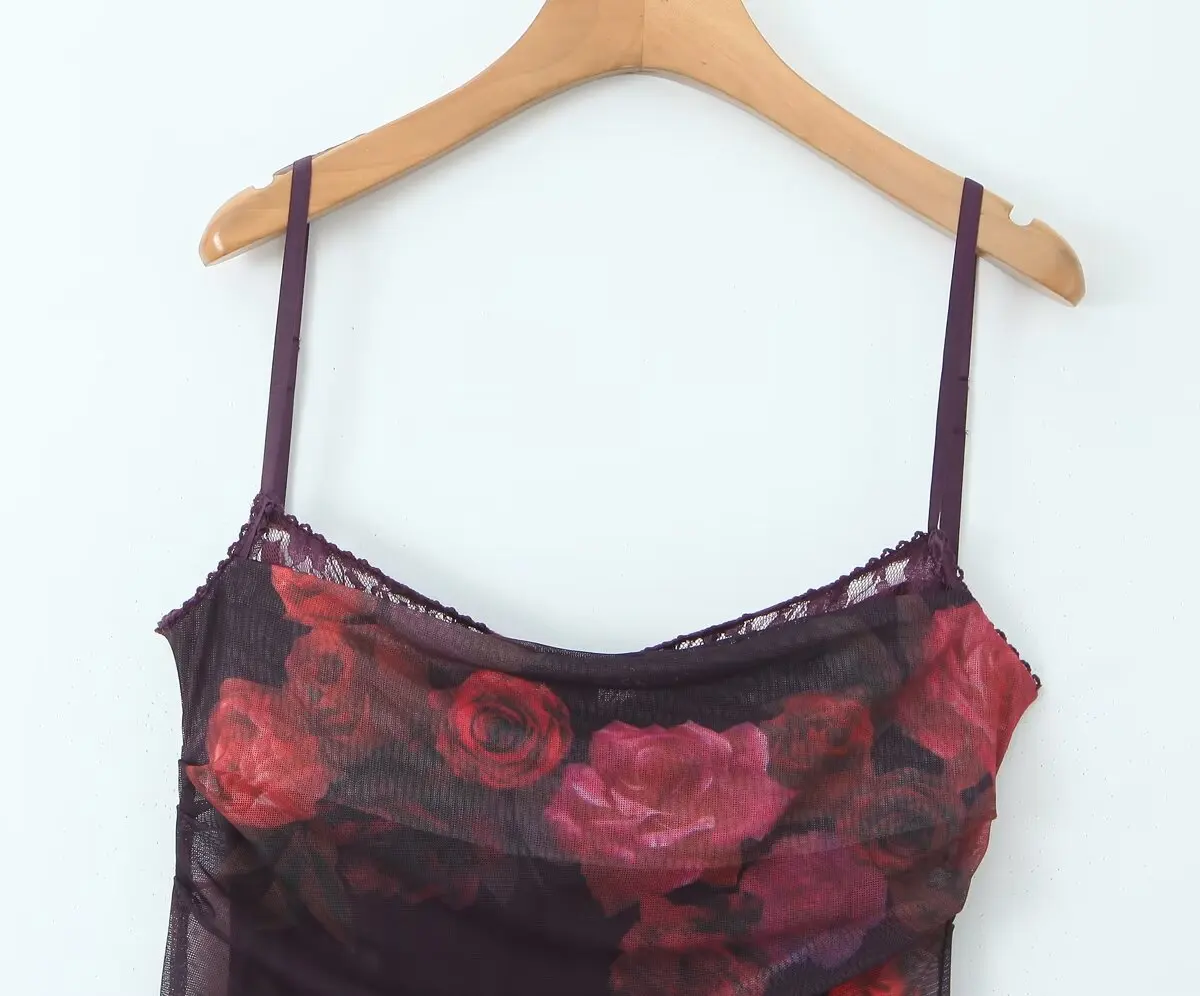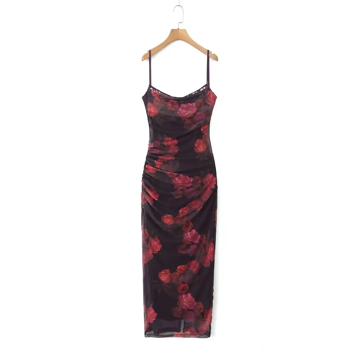 Sexy Women Vintage Floral Print Mesh Sling Long Dress Side Ruching Back Hem Slit Female