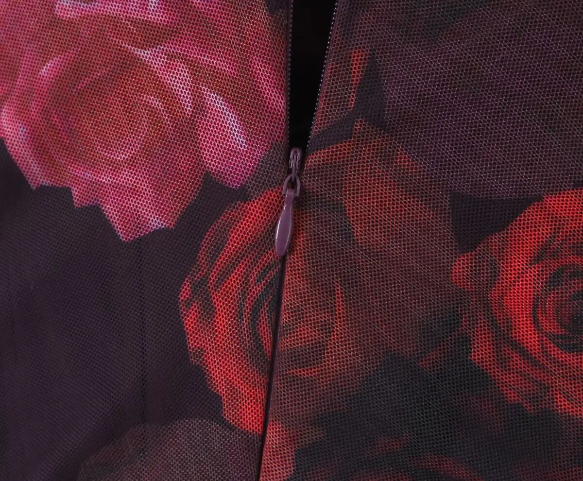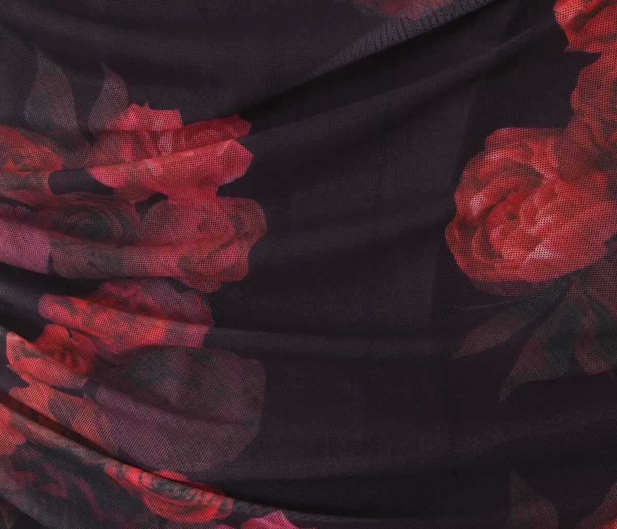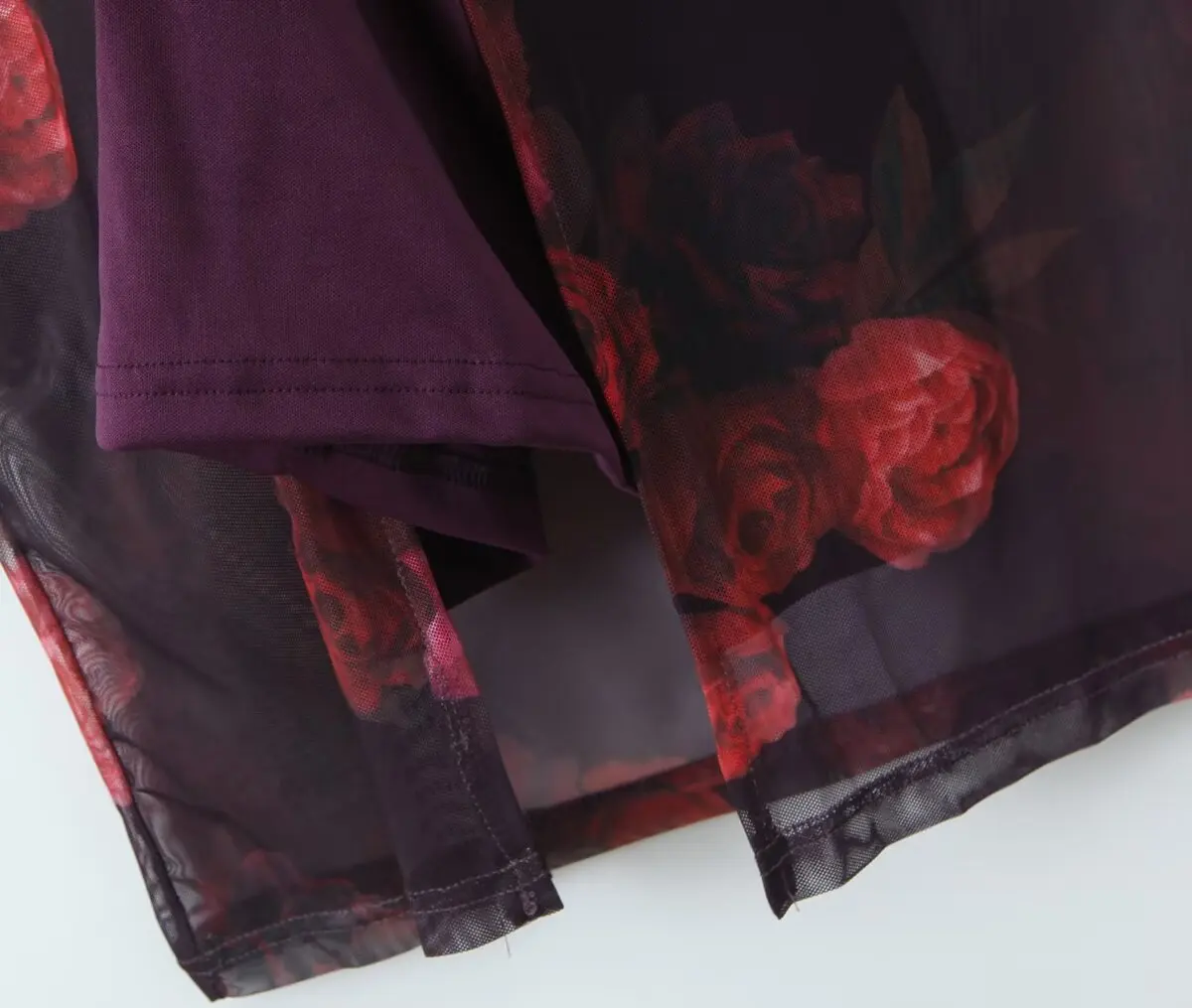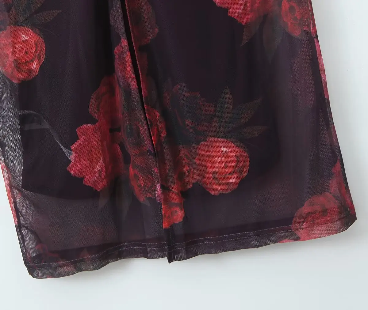 Sexy Women Vintage Floral Print Mesh Sling Long Dress Side Ruching Back Hem Slit Female