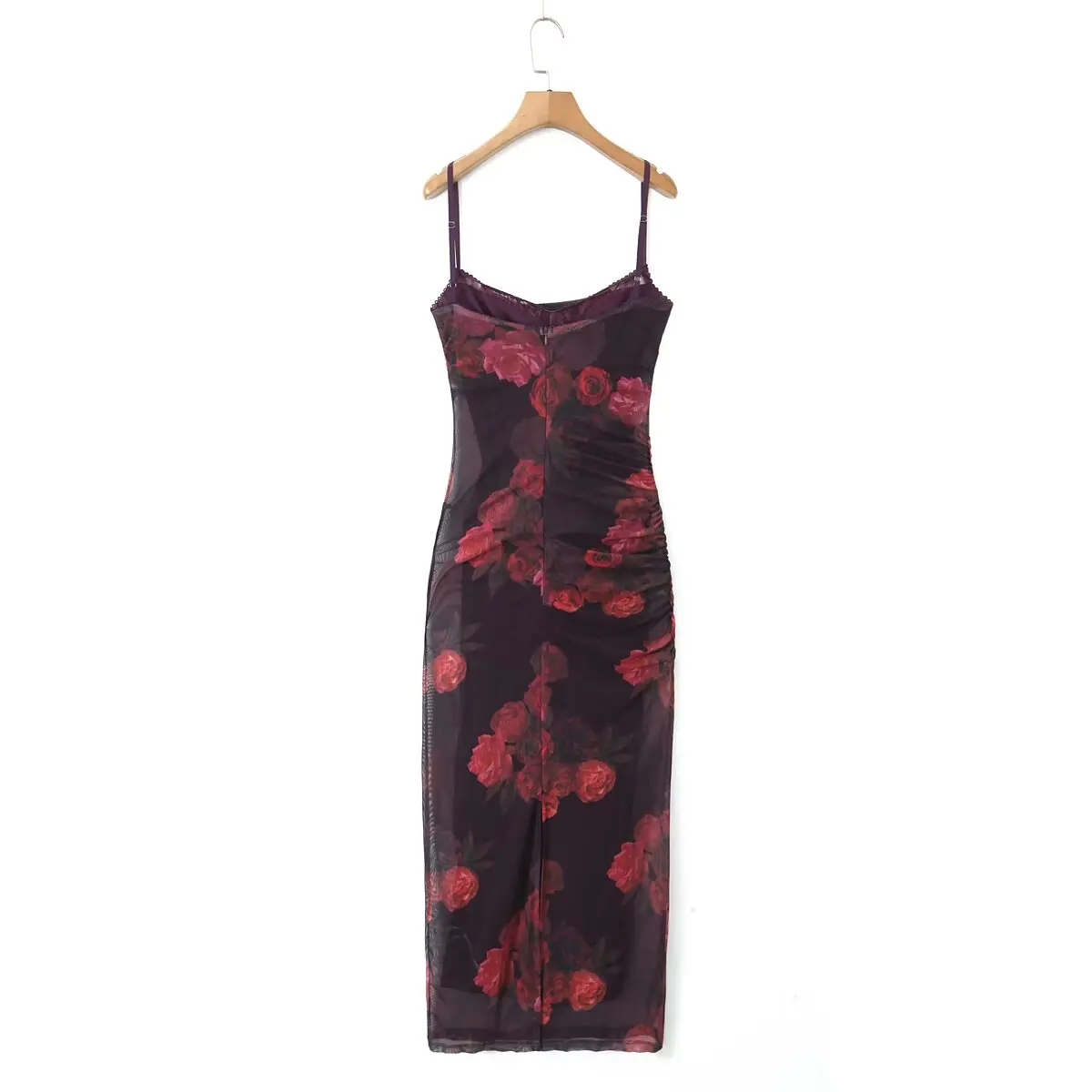 Sexy Women Vintage Floral Print Mesh Sling Long Dress Side Ruching Back Hem Slit Female Summer Dresses Bodycon Robe