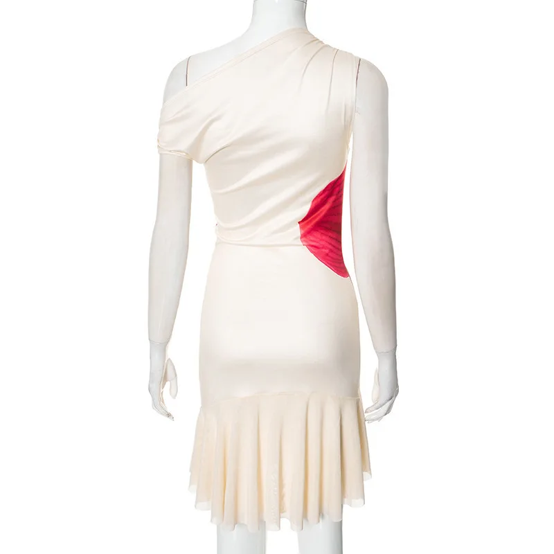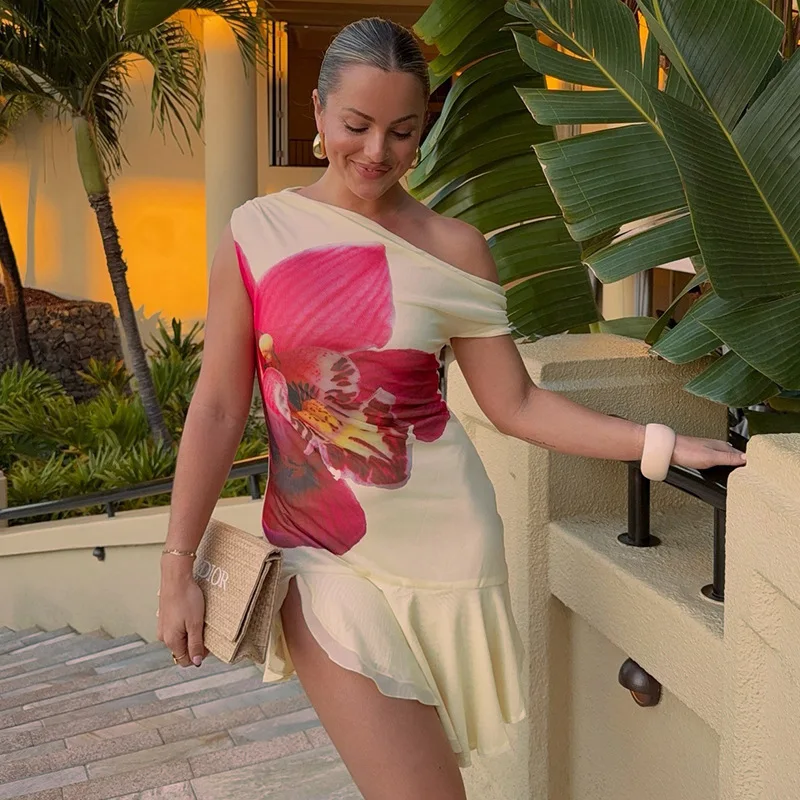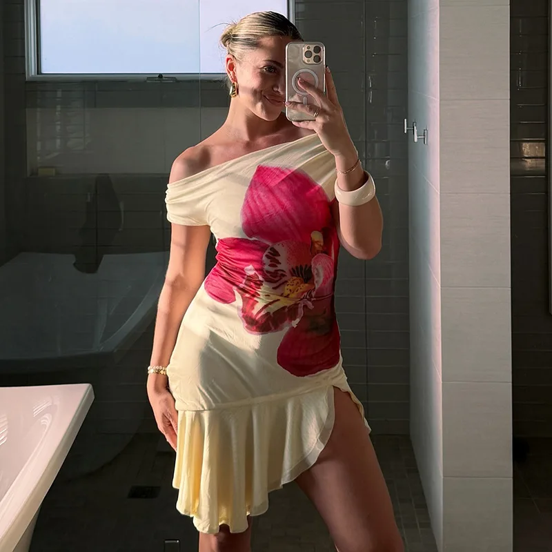 Skew Collar Ruffled Print Sexy Mini Dress For Women Off-shoulder Sleeveless Backless High Waist Printed Dress Vestido