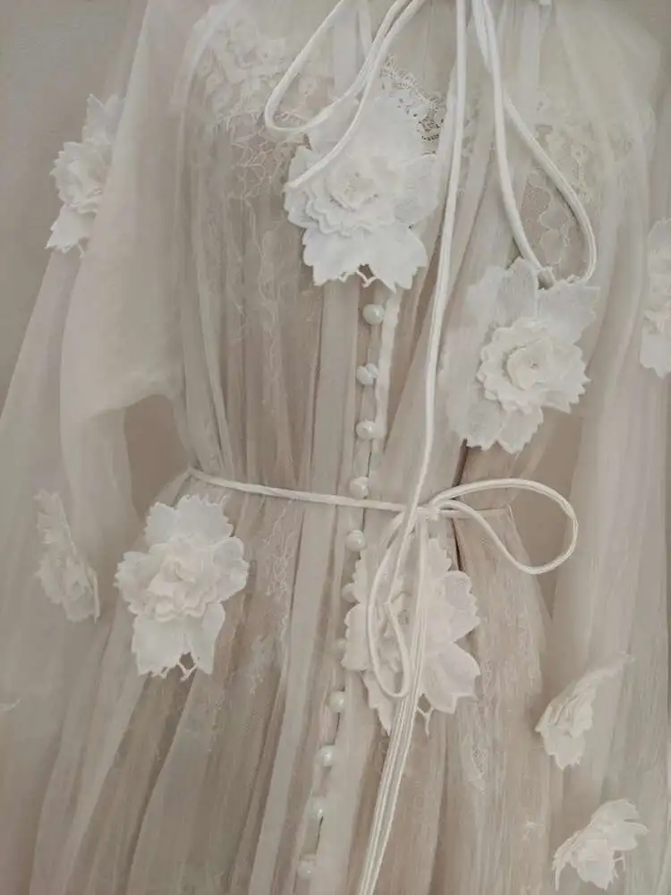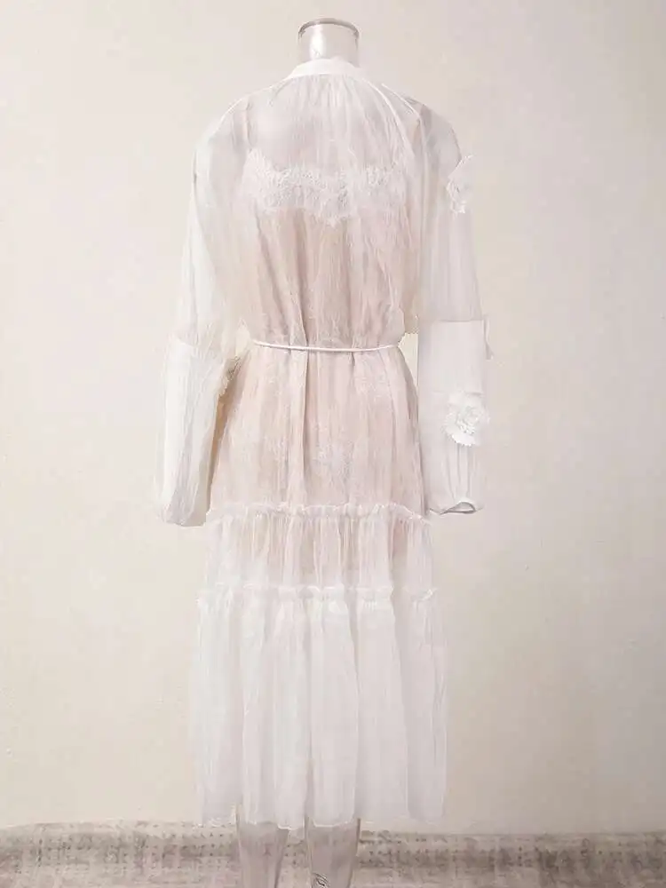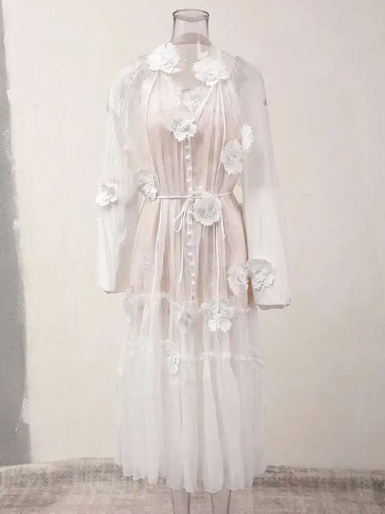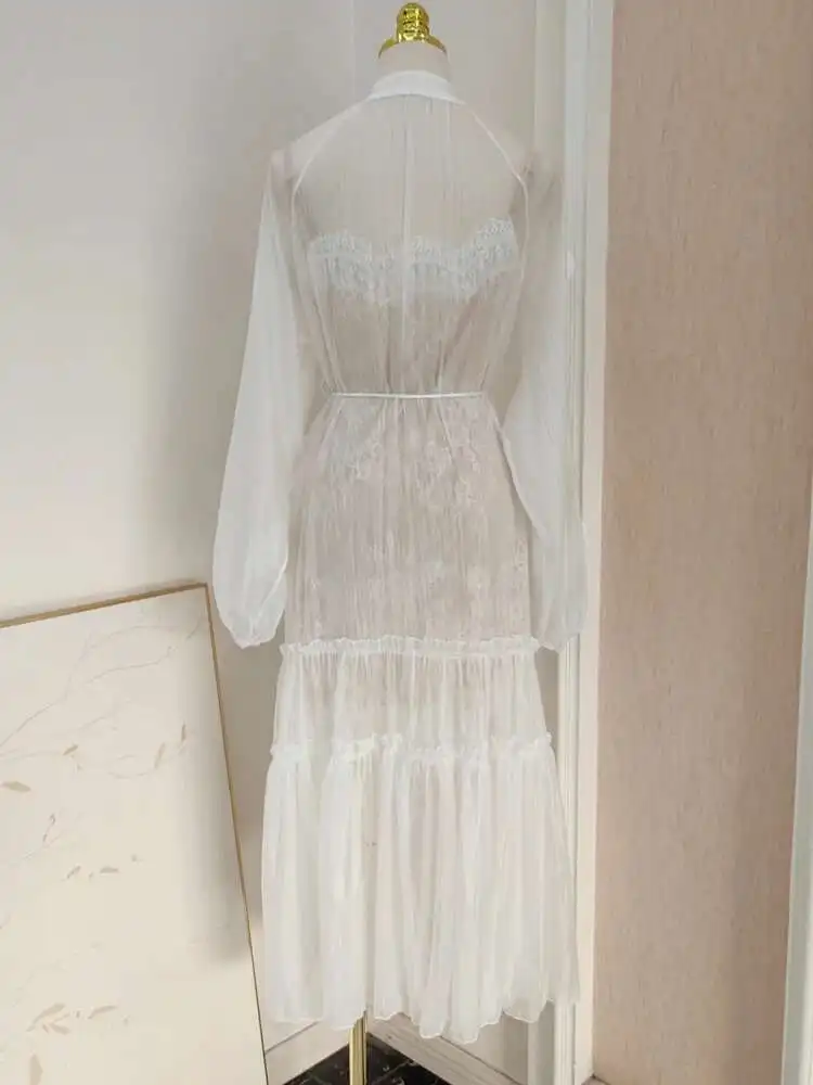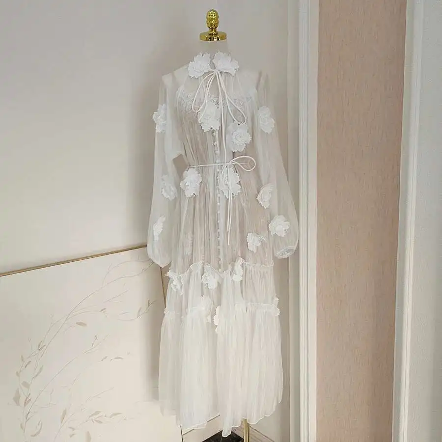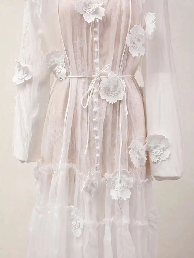 Solid Flower Embroidery Lace Up Dresses For Women Round Neck High Waist Long Sleeve Elegant Dress Summer 2025