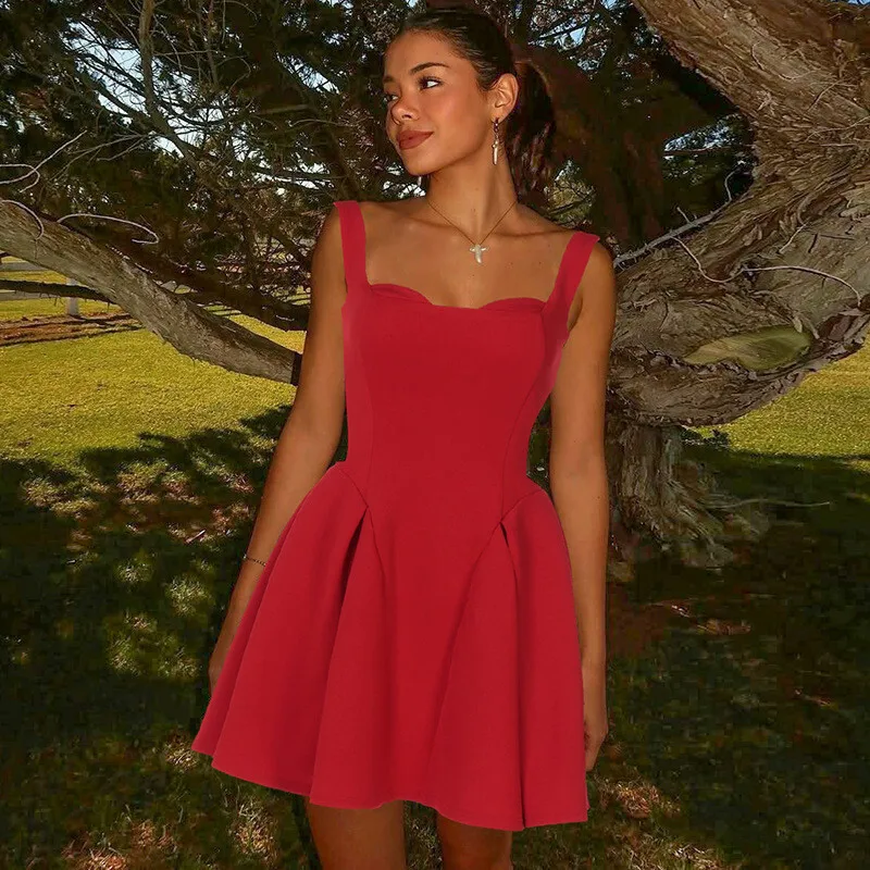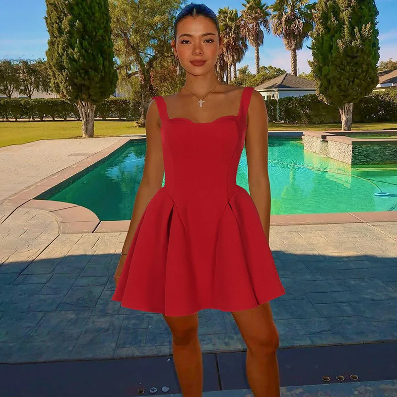Spaghetti Strap Backless Sexy Mini Dress For Women Robe Solid Sleeveless High Waist A-line Pleated Club Party Dress