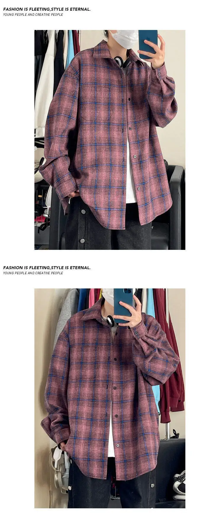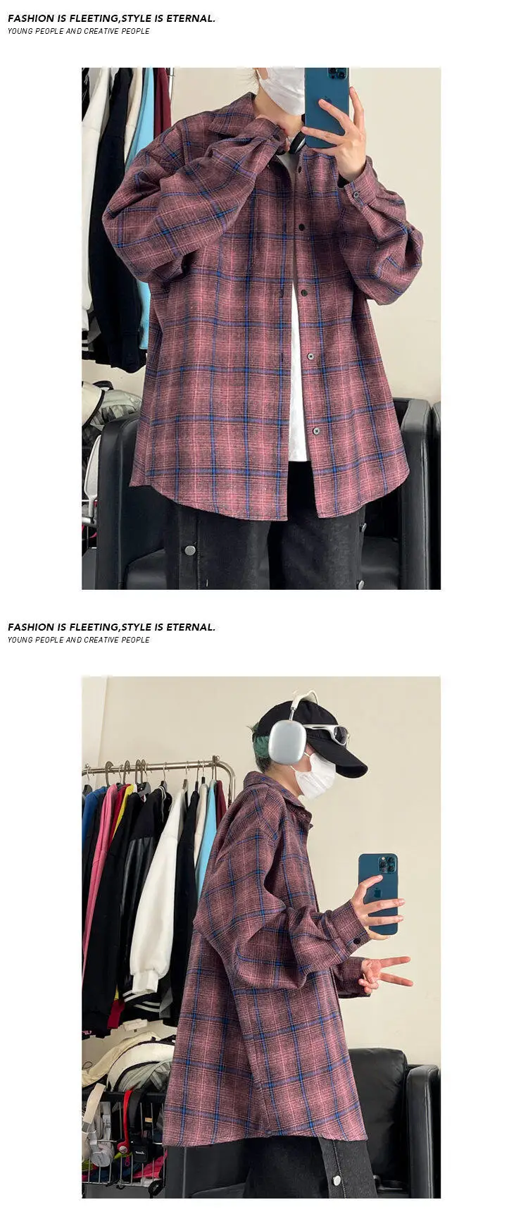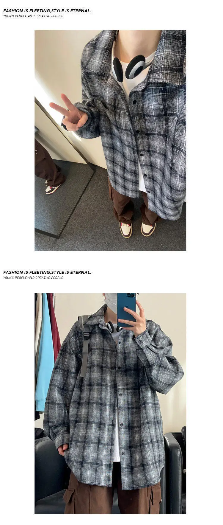Spring Long Sleeved Shirt Men Oversized Retro Plaid Shirt Men Japanese Streetwear Loose Casual Shirt Mens Black Vintage Shirts
