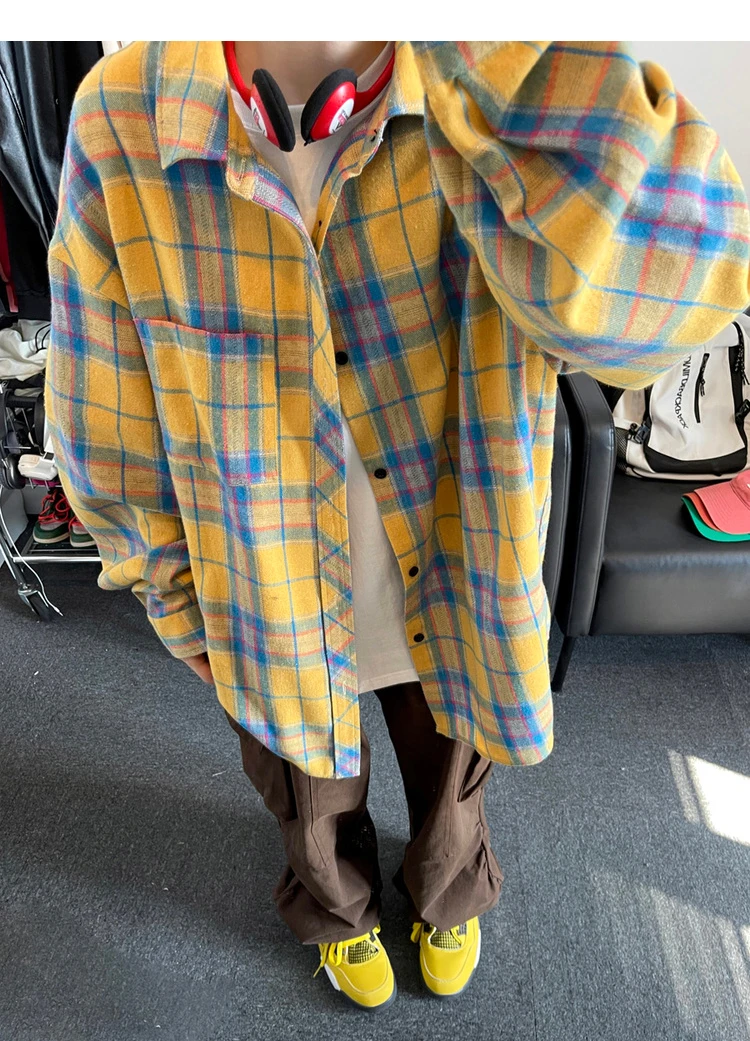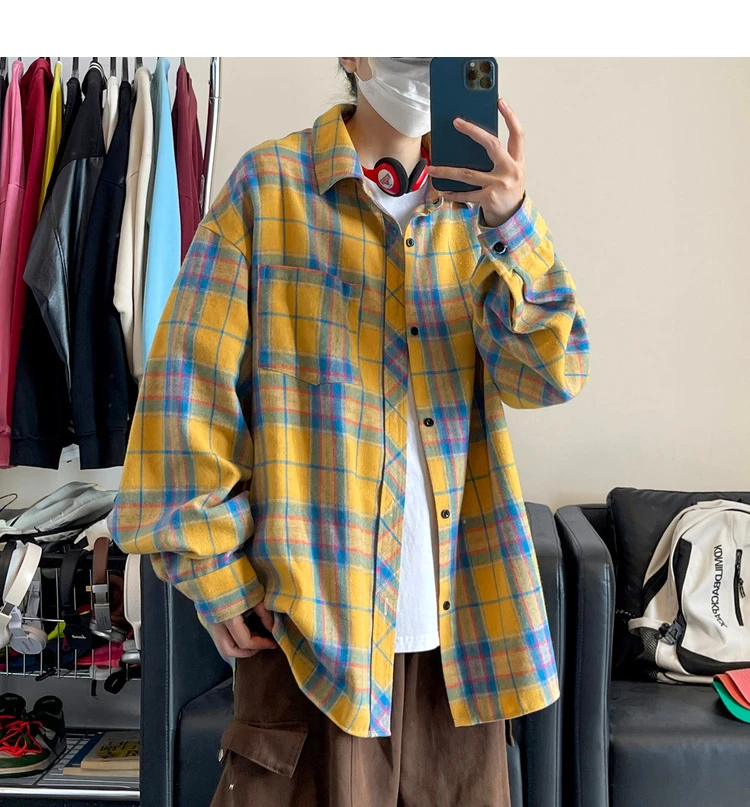 Spring Long Sleeved Shirt Men Oversized Retro Plaid Shirt Men Japanese Streetwear Loose Casual Shirt Mens Vintage Shirts M-3XL
