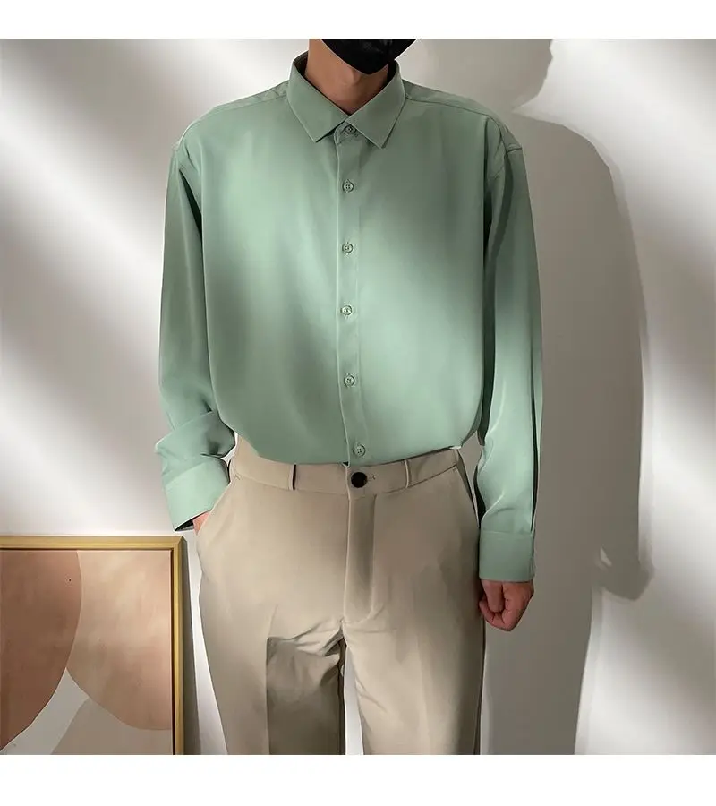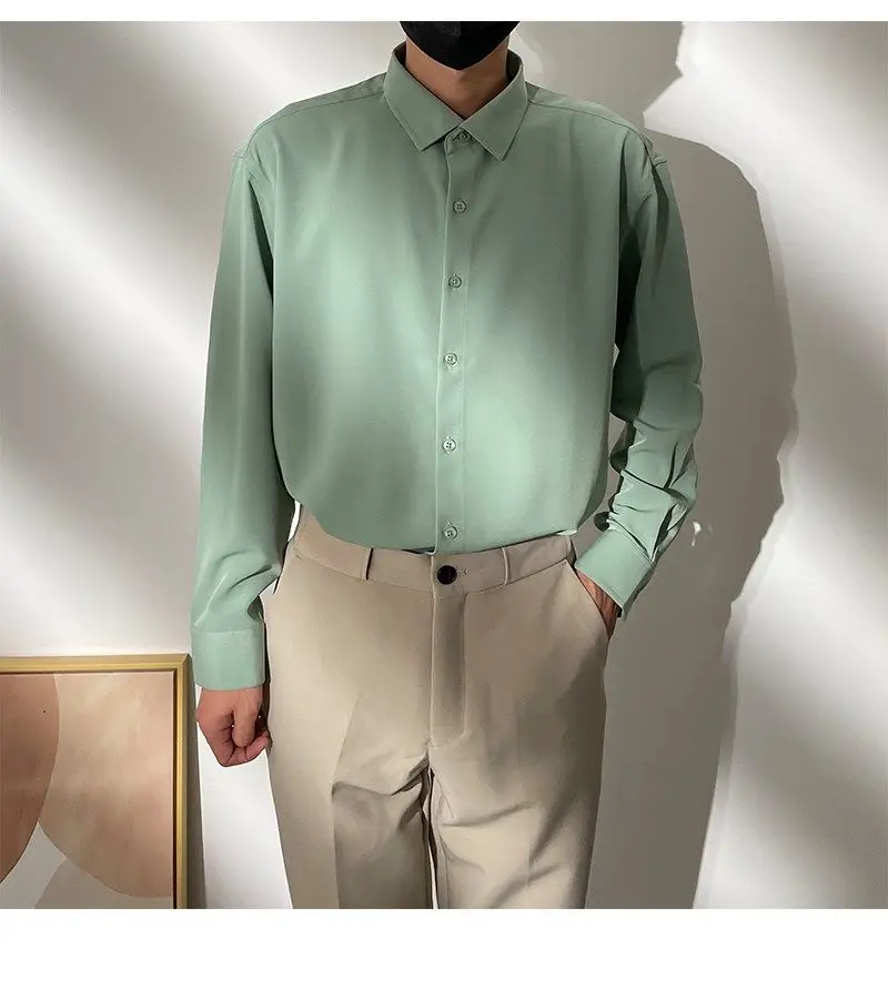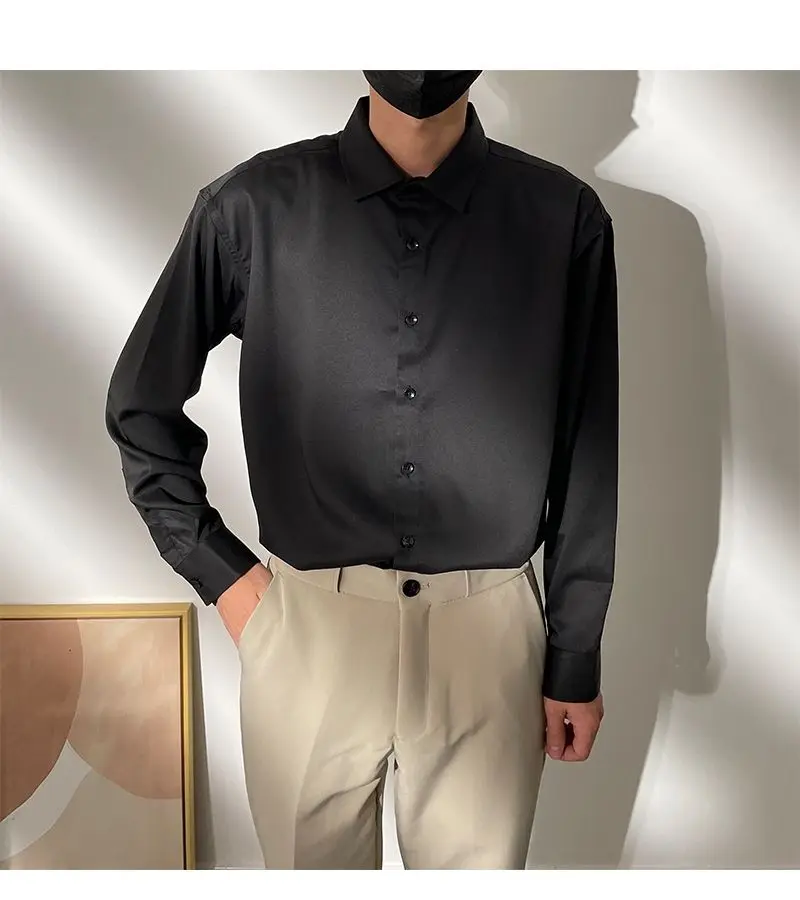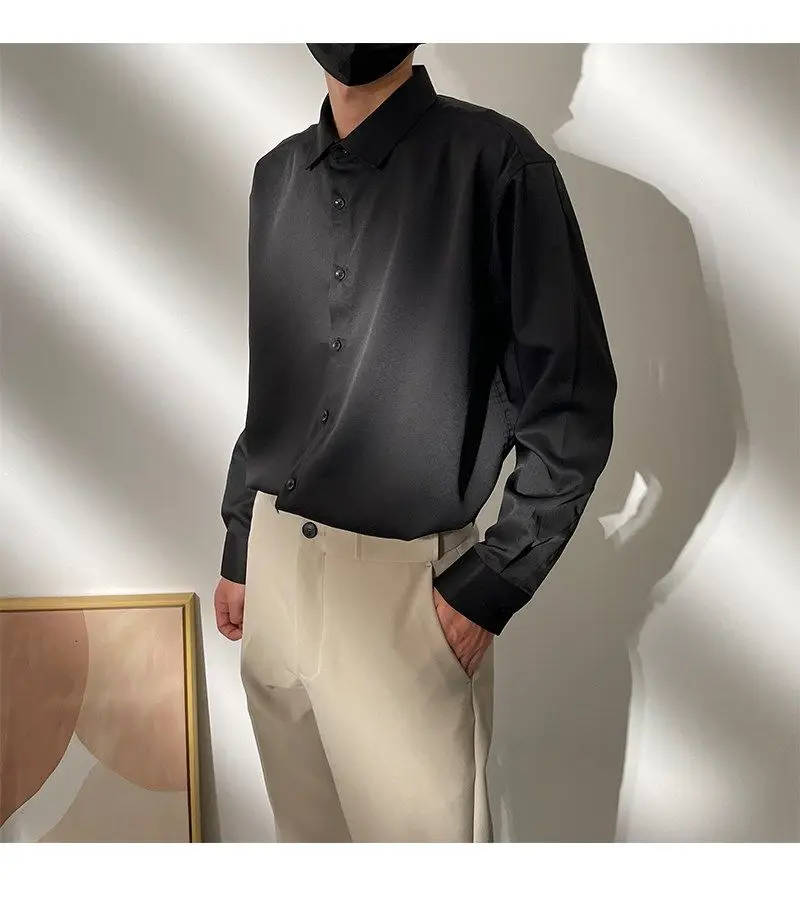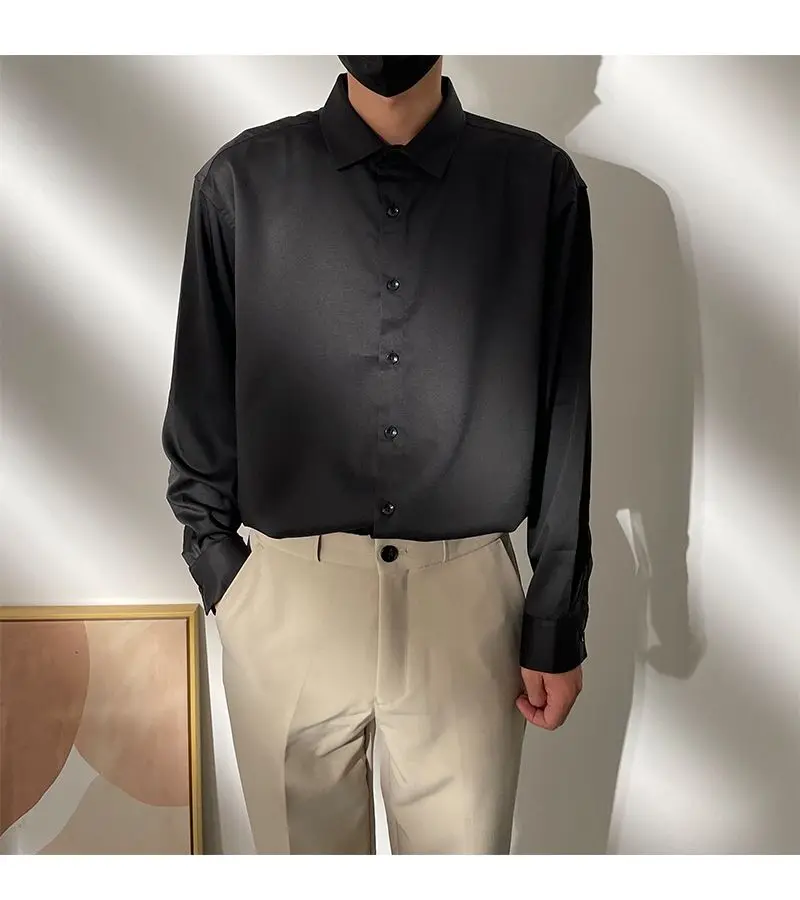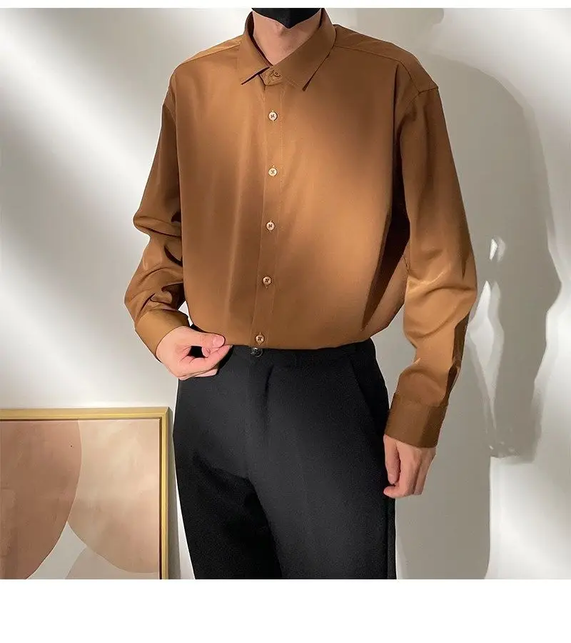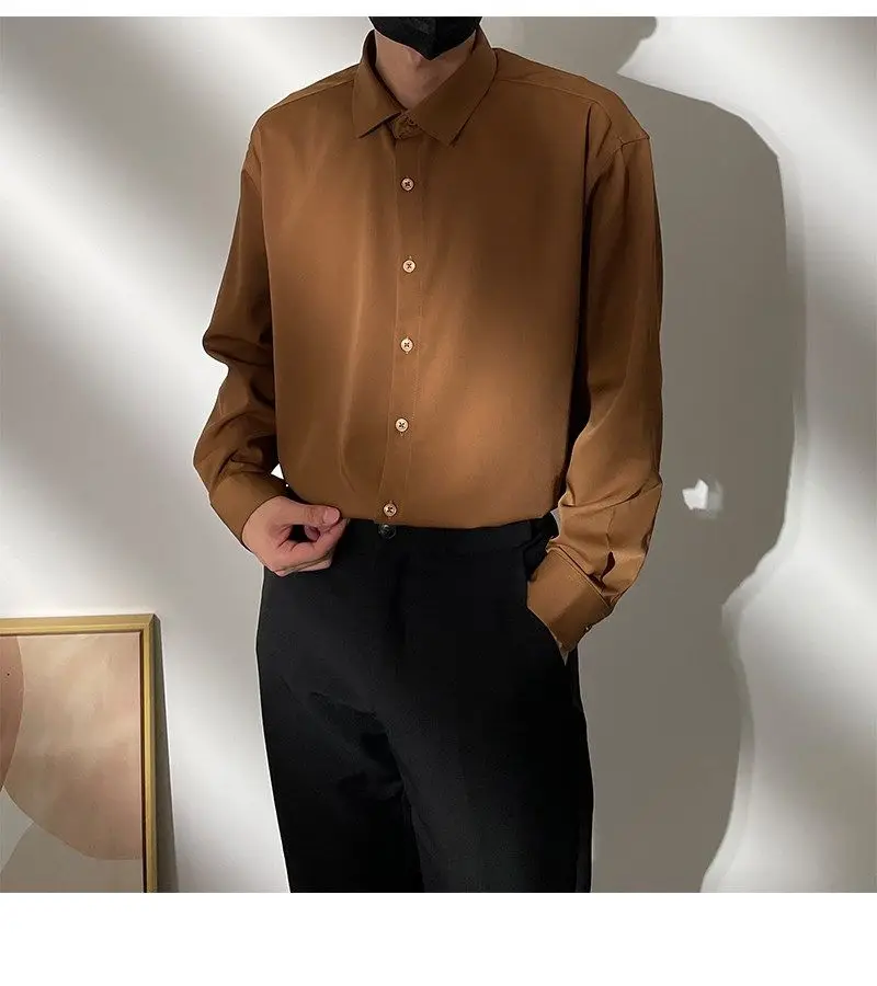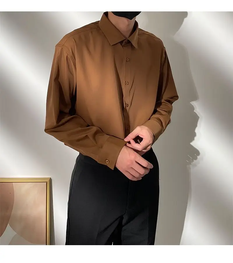 Spring New Senior Coffee Color Solid Long Sleeve Mens Shirts Korean Version Loose Chiffon Silk Shirt Men Casual Fashion Blouse