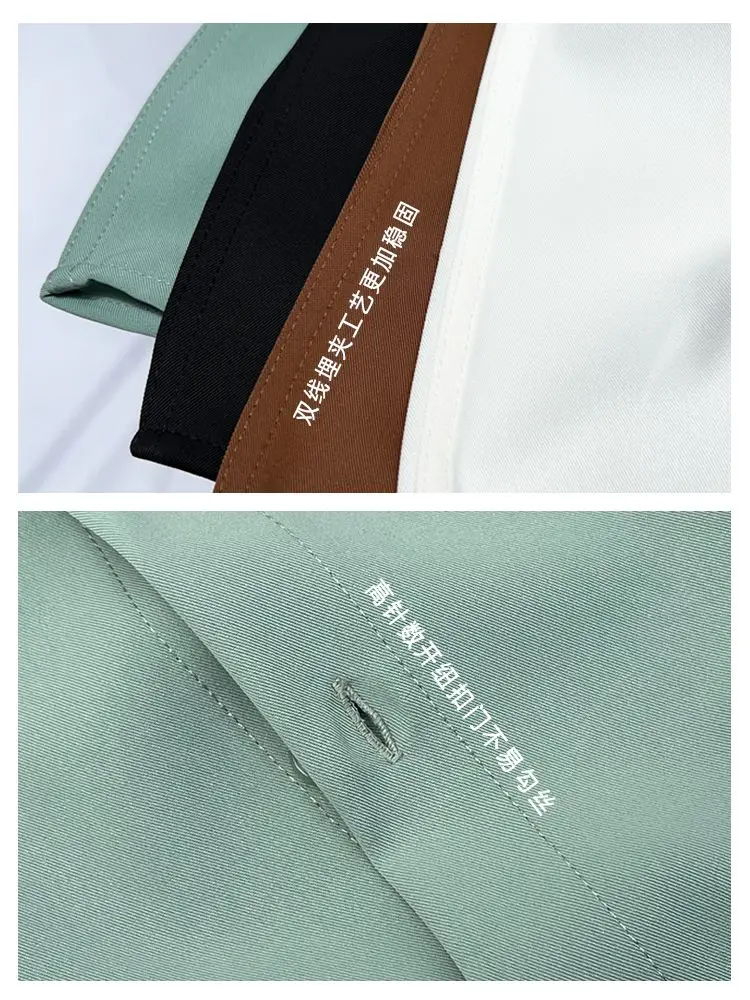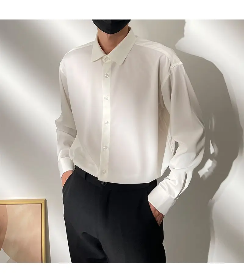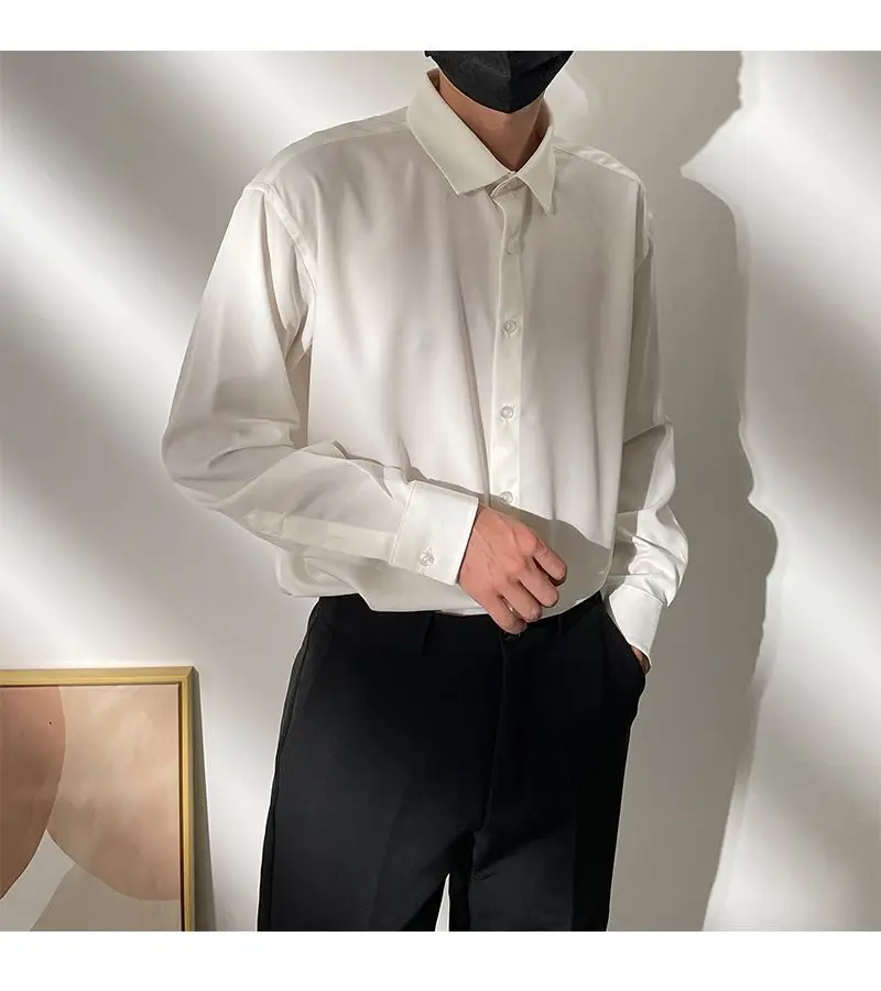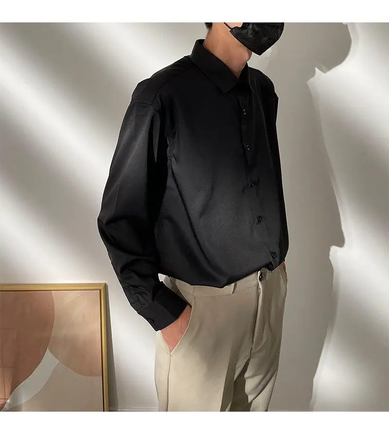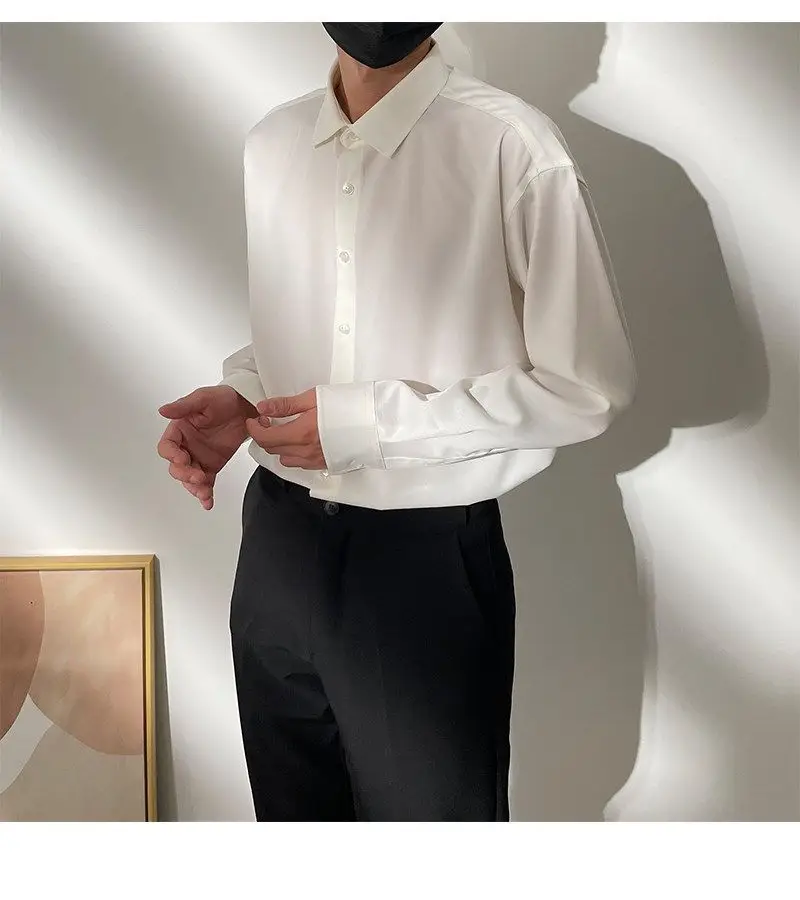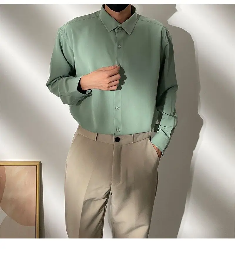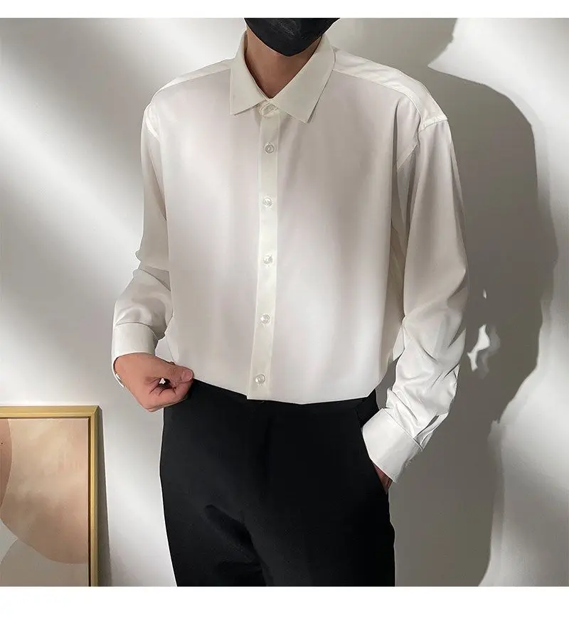 Spring New Senior Coffee Color Solid Long Sleeve Mens Shirts Korean Version Loose Chiffon Silk Shirt Men Casual Fashion Blouse