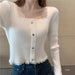 Square Neck Sweater for Women Autumn Lace Patchwork Long Sleeve Knit Base Pullover Korean Chic Button Decoration Slim Crop Tops