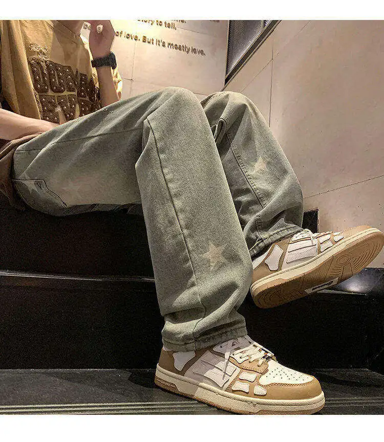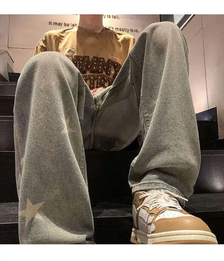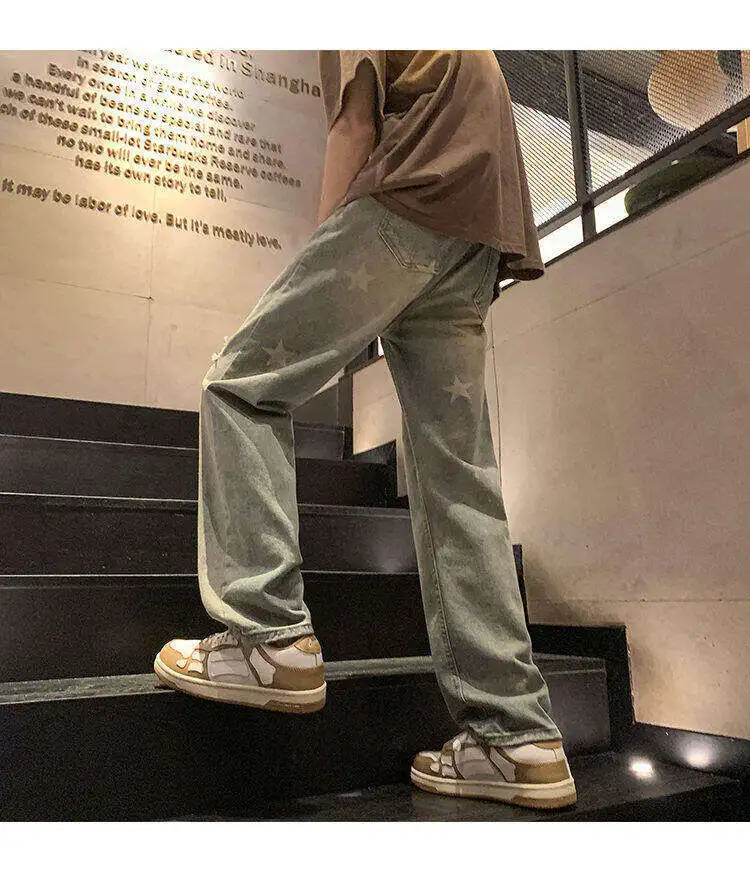 Straight Leg Plus Size Jeans men Vintage Wash Distressed Ripped Star Print Fashion Casual High Quality Trousers Men Retro Style