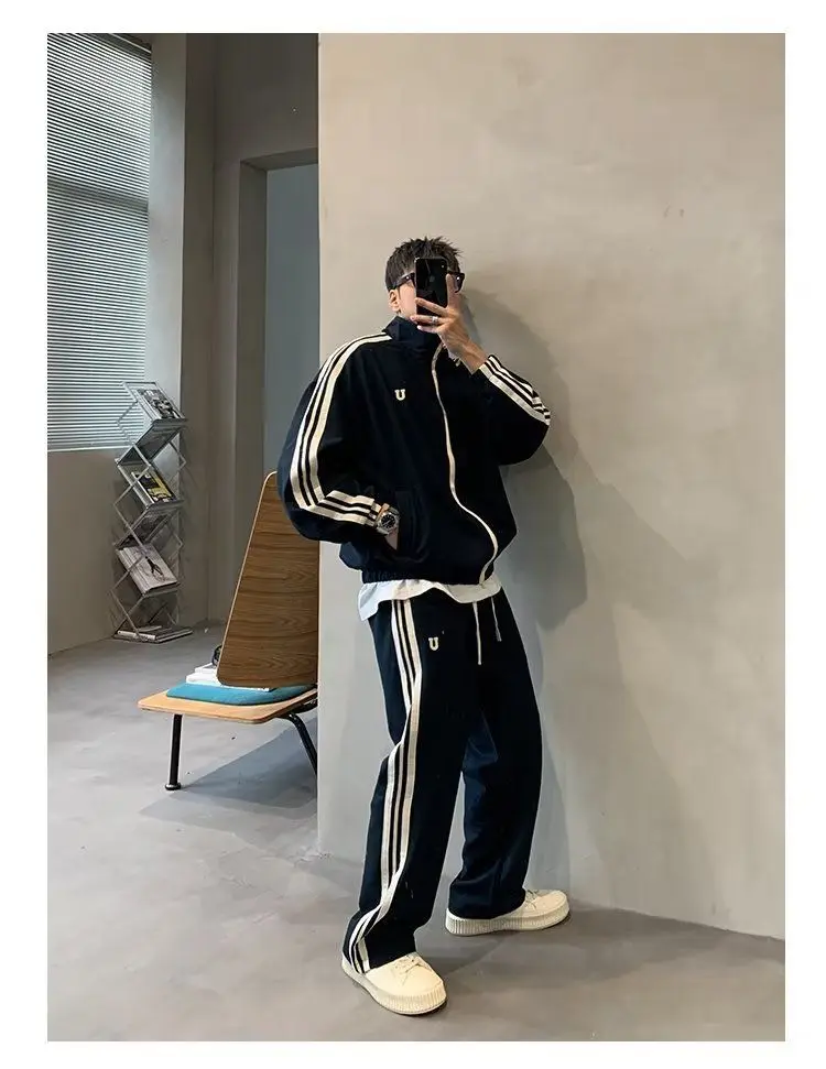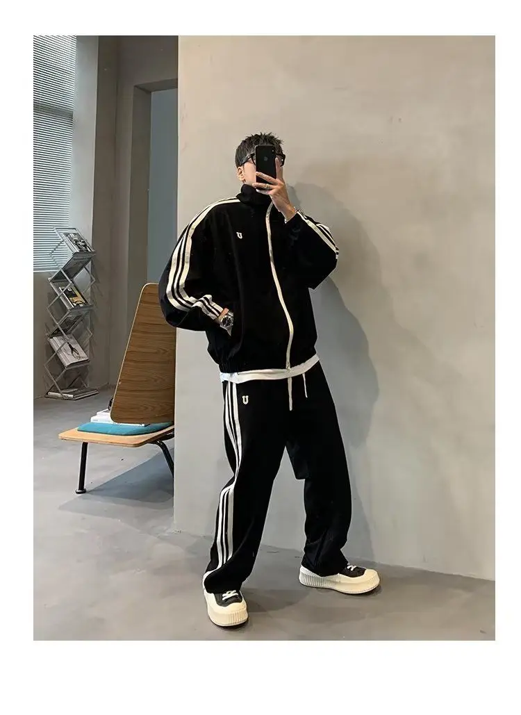 style trendy men's double pole sweatshirt suit men's lazy sports style casual loose ins couple versatile long-sleeved trousers